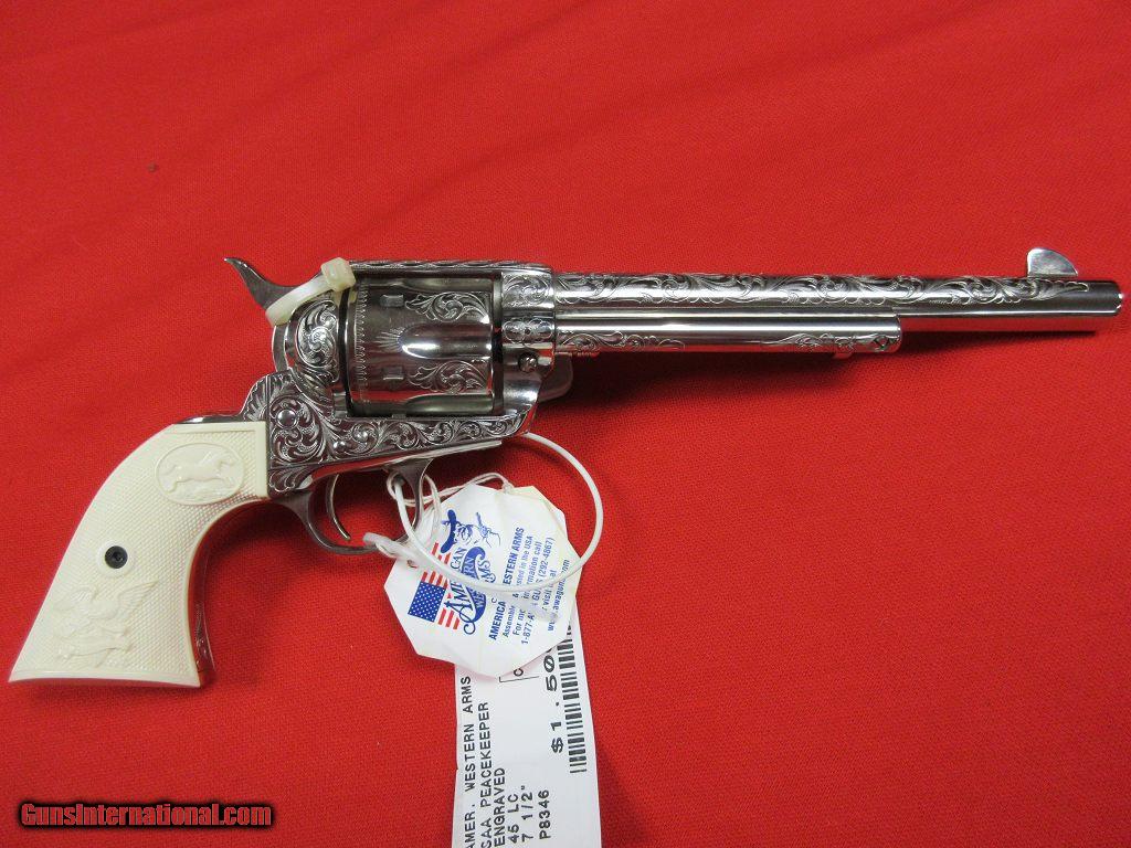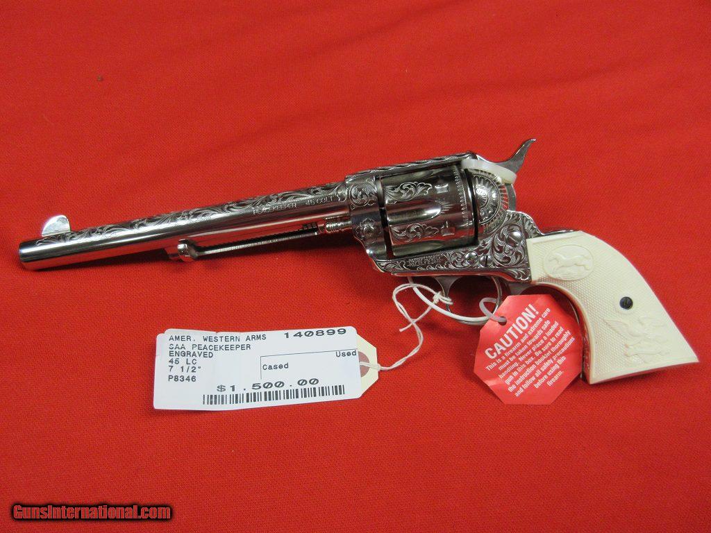 Description: American Western Arms SAA Peacekeeper Engraved 45LC 7 1/2" -- LNIC. Full nickel finish with scroll engraving and white plastic grips. Mint. SOLD |
