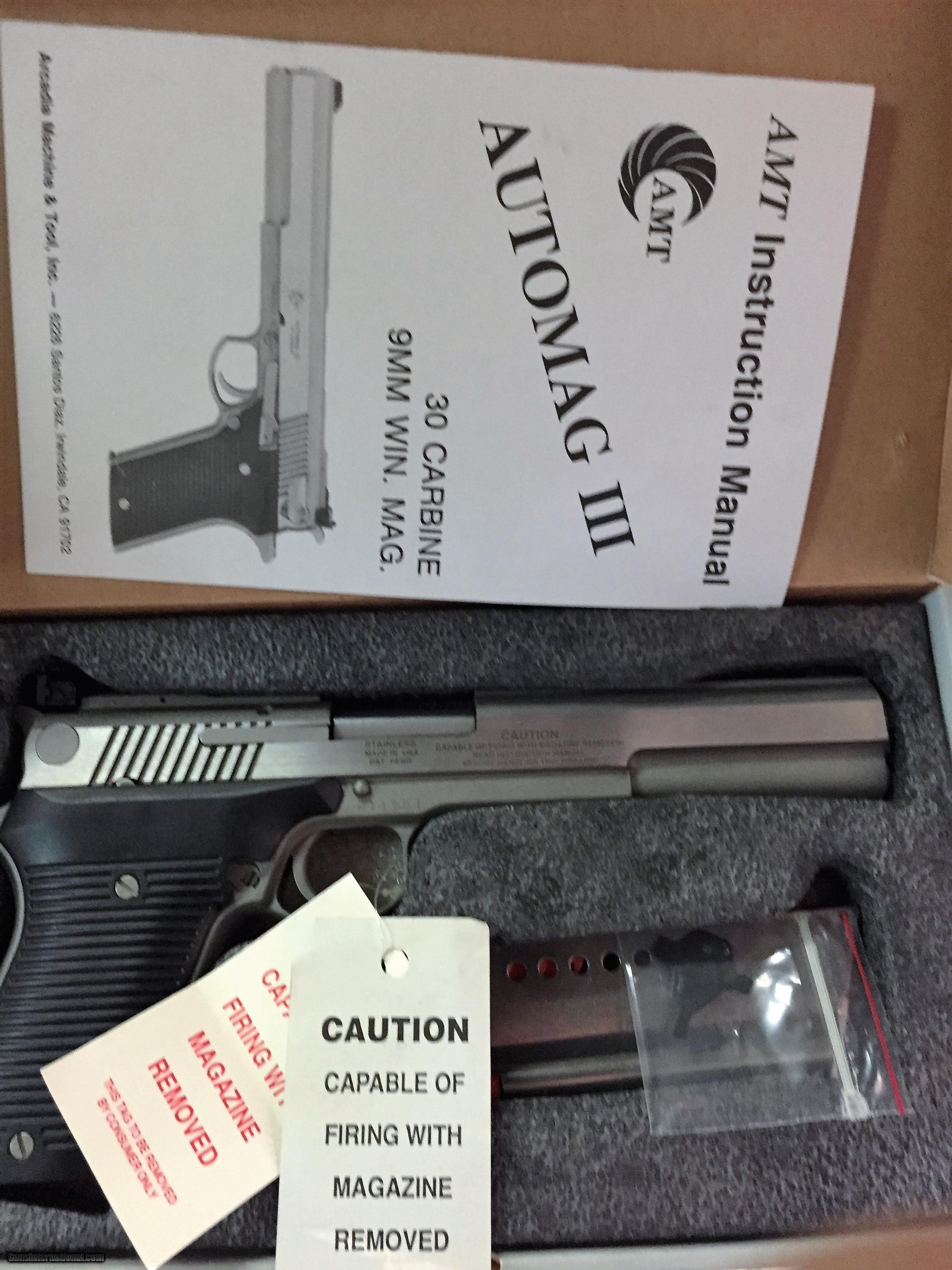 Description: this is ne in the box .30 carbine pistol safe keep nerver shoot this belong to a collector of rear caliber fireamrs thid is super clean and a perfect condition firearm ?weigth 43oz (1200g) ?Length 10.75 in (273mm) ?barrel 6.375in (161.9mm) ?cal .30 carbine/ .9mm wim magnun ?action short recoil operated loock breech ?effictive range 50m (160f) mag 8 rounds ?sight ajustable SOLD Model: automag III Caliber Info: .30 Carbine Condition: new in the box Metal Condition: 100% Bore Condition: 100% Barrels: 6.375in |