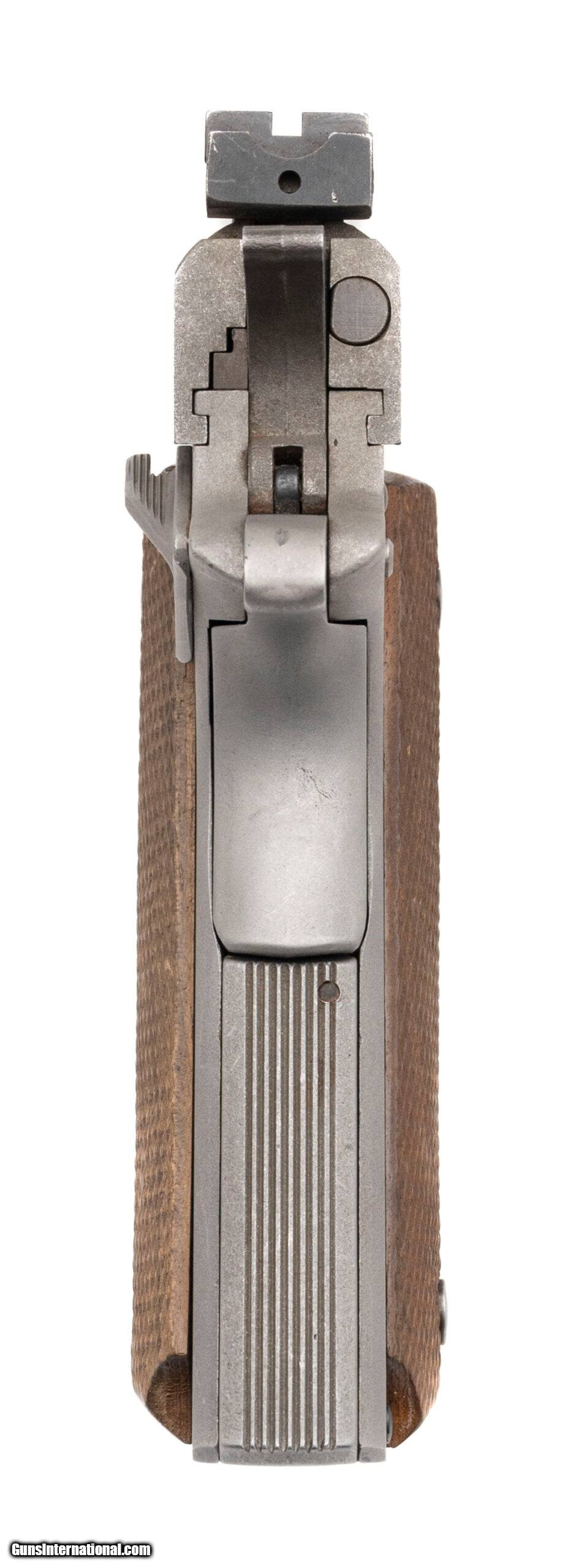 Description: "SN: A02057. 1980s vintage, .45 ACP with a 5"" barrel. Bore is very good. Stainless steel frame 1911 style pistol with an adjustable rear sight, and checkered wood grips. Metal & grips show moderate handling marks throughout. Overall condition is good. Price: $700.00 Contact Seller |