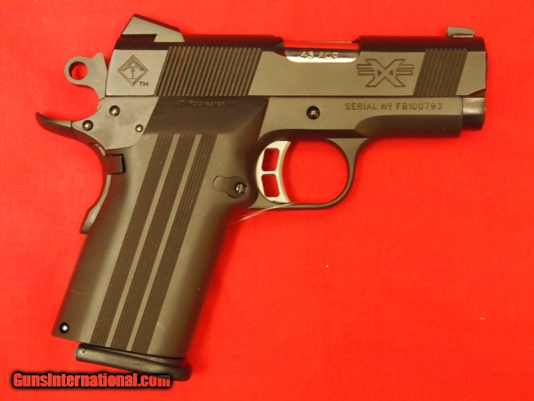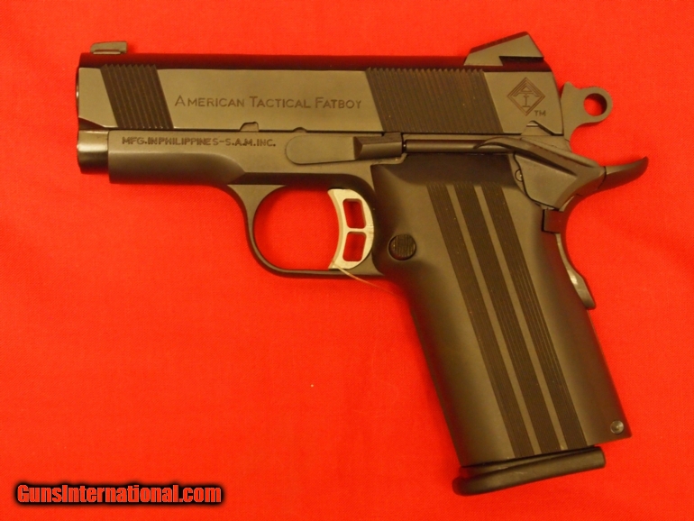 Description: American Tactical 1911 Fatboy .45 ACP, 3.2 inch flared bull barrel, 12 round magazine, all steel construction, dovetail front white sight, Novak style reart sight, extended slide safety, beavertail grip safety, aluminum 2 hole trigger, matte black finish. Add 3% for credit cards $25.00 S&H SOLD |