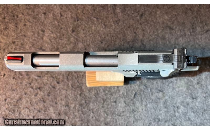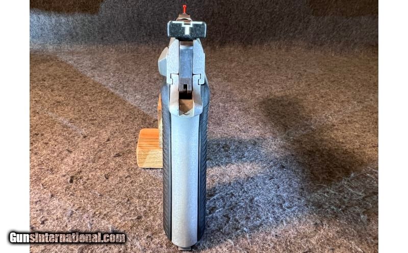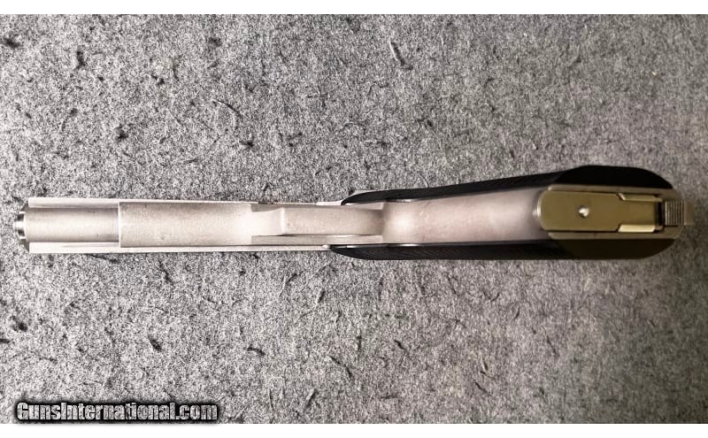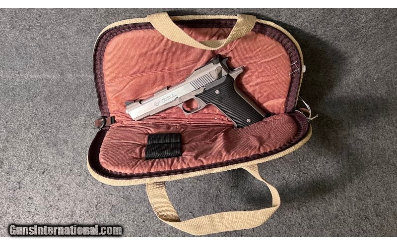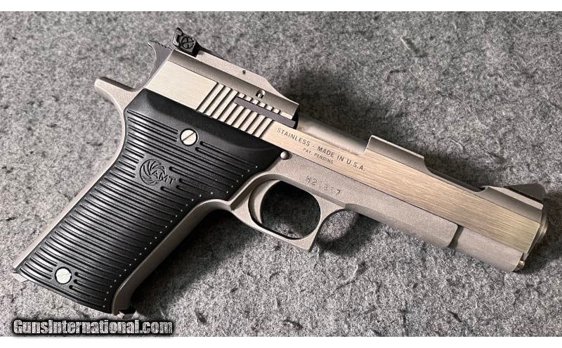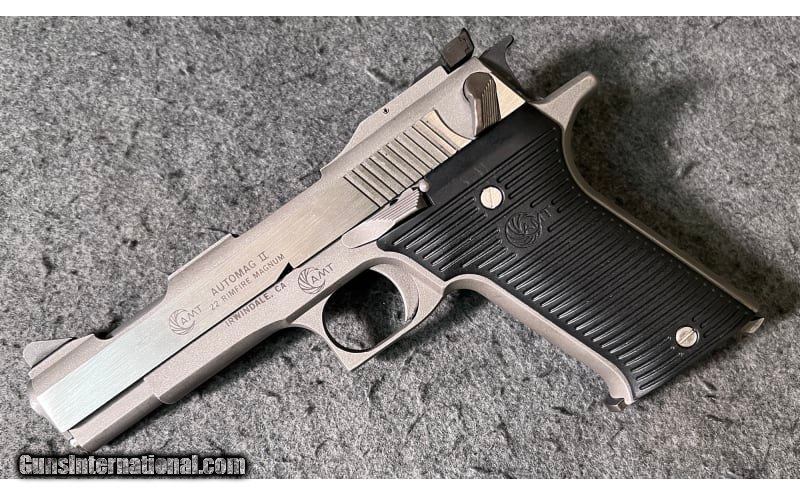 Description: This original Made in Irwindale semi-automatic pistol is an AMT Automag II chambered in .22 WMR. It has a fixed bright orange marker front sight, adjustable "goal post" white outline rear sight, hard black composite serrated grips with AMT logo, rear slide serrations, a left side thumb safety, and a satin stainless steel finish. The stainless steel finish is in excellent condition, with some very negligible handling wear to the underside of the frame. The grips are in excellent condition. It comes with a padded fabric soft case with a place for magazines inside. One magazine total. .22 WMR SOLD Metal Condition: "Satin stainless steel finish is in excellent condition, with some very negligible handling wear to the underside of the frame Wood Condition: Grips are in excellent condition Bore Condition: Bright and shiny with strong rifling intact Barrels: 4½" barrel Triggers: Solid smooth trigger Stock Dimensions: 8" overall length Butt Pad: Hard black composite serrated grips with AMT logo Weight: 1 Lb 14 Oz Sights: "Fixed bright orange marker front sight, adjustable ""goal post"" white outline rear sight Item Location: Wichita, KS |