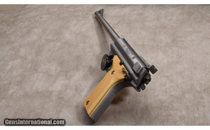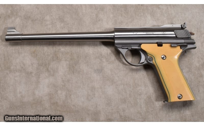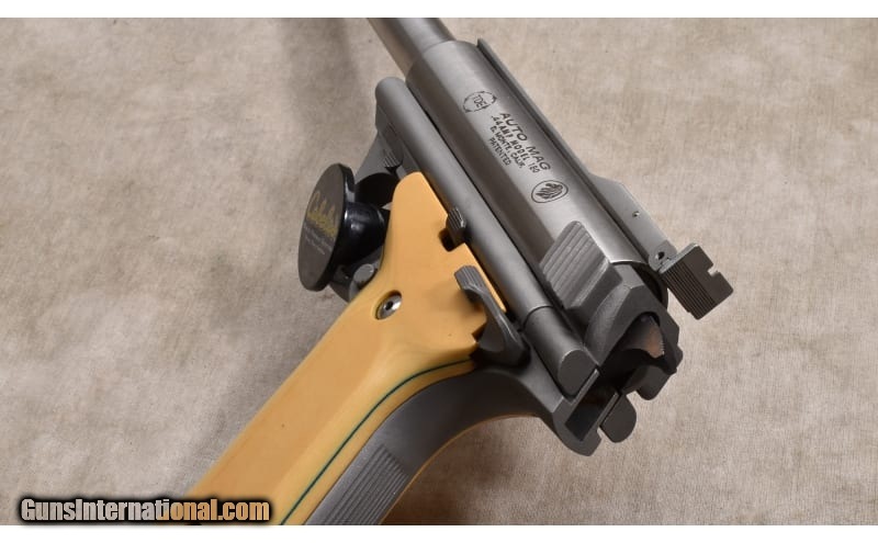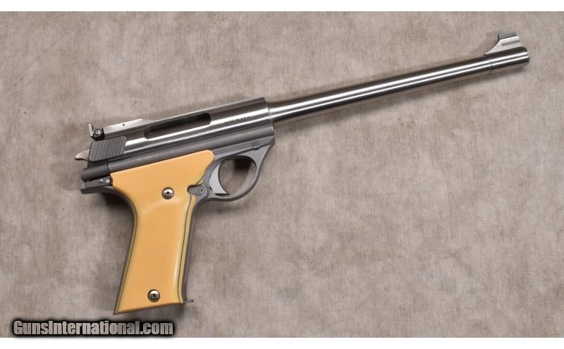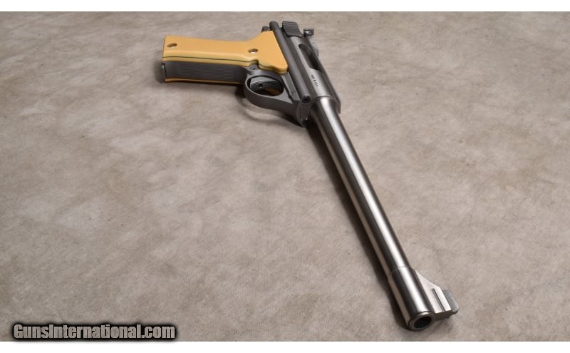 Description: This elegant pistol features a nearly 11-inch barrel, hand-filling grips, and adjustable sights. .44 AMP SOLD Chambers: 7 rounds Metal Condition: Excellent. Wood Condition: Excellent Bore Condition: Shiny and bright with good rifling Barrels: 10-3/4 inches Triggers: Factory single action trigger Butt Pad: Simulated yellow ivory Weight: 61 oz Sights: Post and notch Item Location: Rogers |