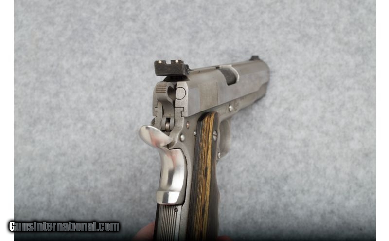 Description: Used. SOLD Caliber Info: .45 ACP Metal Condition: Good, overall Wood Condition: Very good Bore Condition: Clean and sharp Barrels: 5 inch Triggers: SA with grip safety Stock: Laminated wood with finger-grooves Weight: 38 oz. Sights: Adjustable target rear; blade front Extras: Soft case; (1) 8 round magazine and (2) extended magazines. Item Location: Sun Prairie, WI |