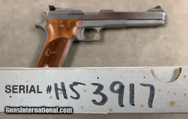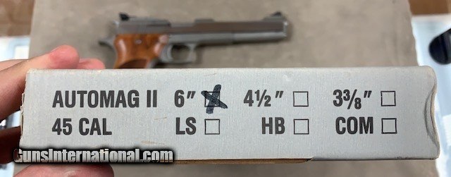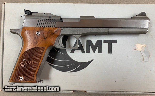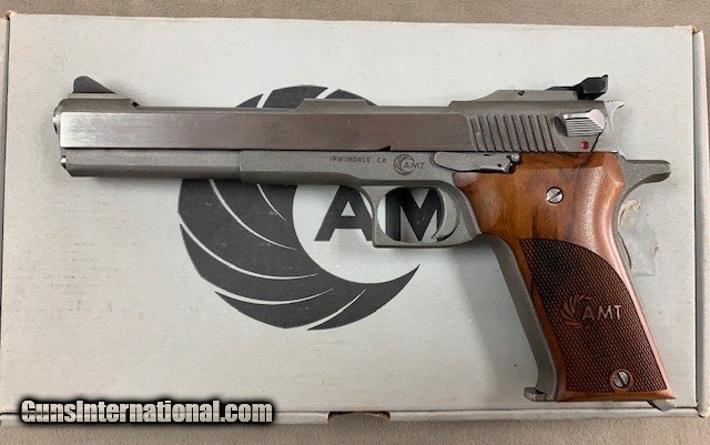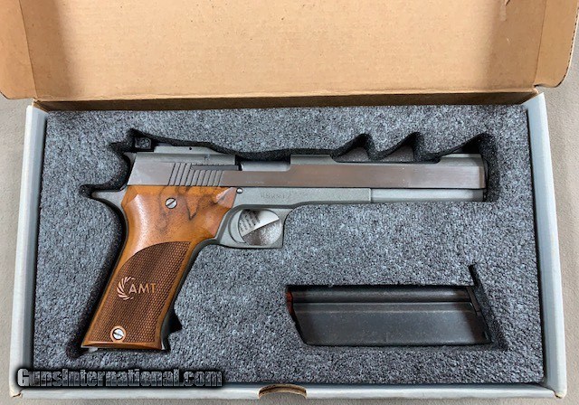 Description: An excellent original AMT Automag II Pistol in .22 Magnum caliber and in the original box with label, etc. Pistol has been fired but is excellent overall and has a georgeous pair of custom checkered grips which look like they could be Nils grips. SOLD |