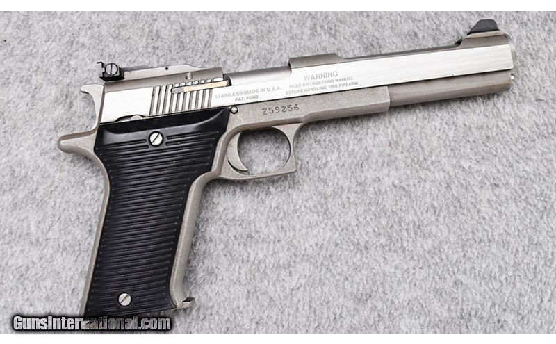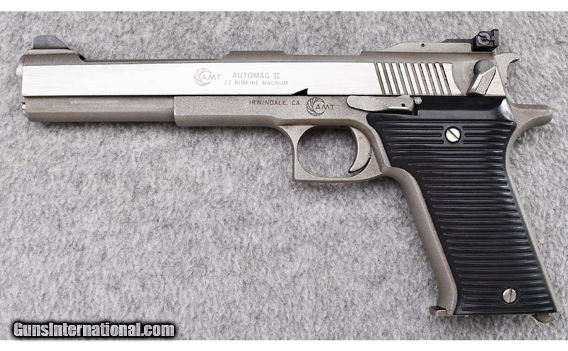Description: This AMT Automag is chambered in .22 Magnum. Very Good overall condition showing only light use. No box. .22 MAG SOLD Metal Condition: Excellent Bore Condition: Excellent Barrels: 6 Triggers: Original Butt Pad: Black Grooved Plastic Grips Weight: 32 ozs. Sights: Millett Adjustable Rear Sight Item Location: Wheeling |