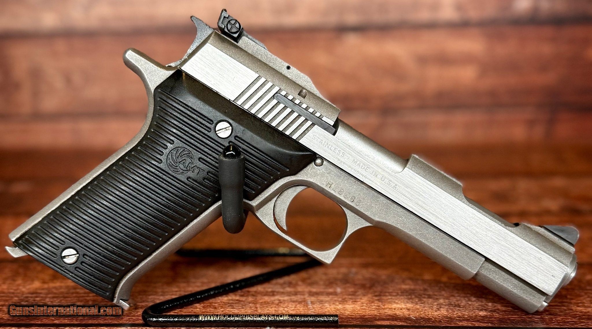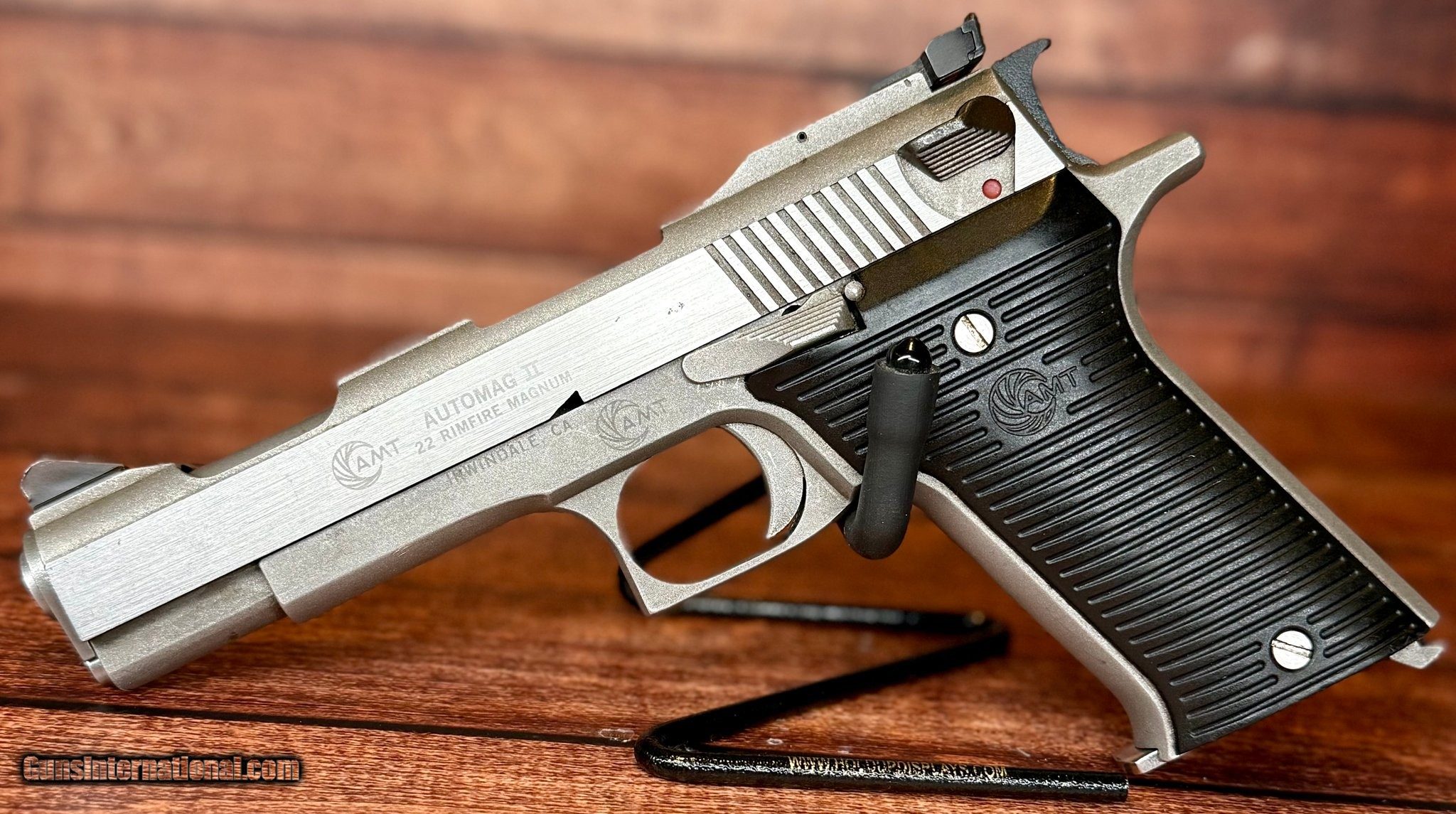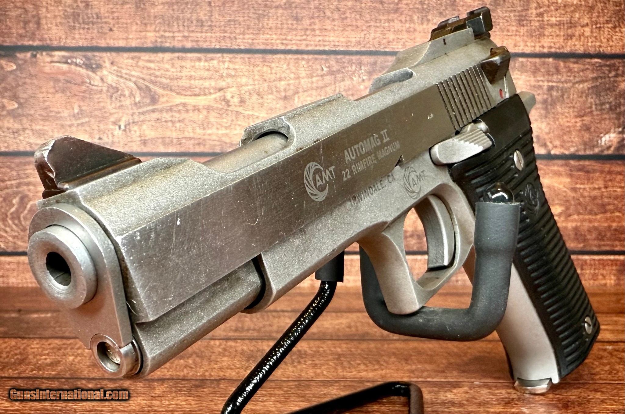 Description: Guns Listing ID: 576501 AMT AutoMag II .22 WMR (.22 Magnum) Semi-Automatic Pistol, Stainless, 4.5 in Barrel, Ported Slide, Irwindale CA Production, 9+1 Capacity This AMT AutoMag II stands out as the first commercially successful semi-automatic pistol chambered in .22 WMR. The AMT Automag II stands out in the world of firearms for its distinctive design and engineering prowess. Manufactured by Arcadia Machine and Tool from 1987 until 1999, this pistol was one of the first successful autoloading .22 Magnum handguns on the market. Built in Irwindale, California, it uses a gas-retarded blowback system with a stainless chamber sleeve featuring 18 radial gas-relief ports to manage the .22 WMR cartridge. Its stainless steel construction, vented slide, and adjustable sights make it a distinctive and collectible full-size rimfire pistol. Condition: Overall Condition: Very good condition, showing few signs of prior use and handling. Bore Overall Condition: Excellent - Clean, mirror finish, no signs of wear. Bore Rifling: Excellent Rifling - Sharp lands and grooves. Specific Condition Notes: There are minor scuffs and scratches on the frame and barrel. Function is excellent. Firearm comes with 1x 9-round stainless steel magazine and a soft pistol case. Construction is all stainless steel, including a 17-4 PH frame and receiver with a matte stainless finish and brushed flats. Overall length is 7.75 in, and weight is approximately 28–32 oz. Safety features include a slide-mounted manual safety, a firing pin block, and a half-cock notch. The pistol feeds from a 9-round single-stack magazine for a 9+1 capacity. Sight alignment is handled by a serrated black blade front sight and a fully adjustable Millett-pattern rear sight. Black ribbed Lexan-type polymer grips with the AMT logo provide a durable, period-correct grip profile on this full-size pistol. Specifications Manufacturer: AMT Model: AutoMag II Item Type: Semi Auto Pistols Caliber: .22 WMR (.22 Magnum) Action Type: Gas-retarded blowback, Barrel Length: 4.5 in Barrel Material: Stainless steel Chamber: Stainless sleeve with 18 radial gas-relief ports Capacity: 9+1 Magazines Included: 1x 9-round Magazine Details: Stainless steel magazine Slide Features: Vented slide ; slide-mounted safety Slide Finish: Matte stainless with brushed flats Frame Material: Stainless steel (17-4 PH) Frame Finish: Matte stainless with brushed flats Receiver Material: Stainless steel (17-4 PH) Receiver Finish: Matte stainless Sights: Serrated black blade front; fully adjustable Millett-pattern rear Safety Features: Slide-mounted manual safety; firing pin block; half-cock notch Hammer: Commander-style exposed hammer Grips: Black ribbed Lexan-type polymer with AMT logo Overall Length: 7.75 in Weight: Approx. 28–32 oz Size: Full-size Country of Origin: United States Production Location: Irwindale, California Manufacturer: AMT Model: AutoMag II Caliber Info: .22 WMR Condition: Used - Non-Certified Barrels: 4.5" BARREL Action: SEMI AUTOMATIC Finish: stainless steel Price: $832.99 Contact Seller |