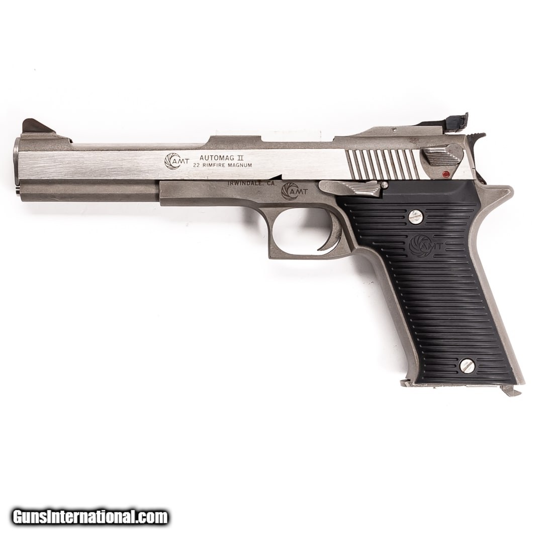 Description: Guns Listing ID: 273958 The AMT Automag II is a 22 WMR semi-automatic handgun with a stainless-steel finish. Recently, companies like Kel-Tec brought back semi-auto 22 WMR pistols, but they are largely made of polymer. This model features a metal slide and frame, making this an overall more robust old-school alternative. It has an adjustable rear sight, thumb safety, and a mag release at the grip heel. It is in very good condition, with some marks on the frame and slide, and comes with one 9-round magazine. SOLD Manufacturer: AMT Model: AUTOMAG II Caliber Info: 22 WMR Condition: Used - Certified Barrels: 6 BARREL Finish: STAINLESS |