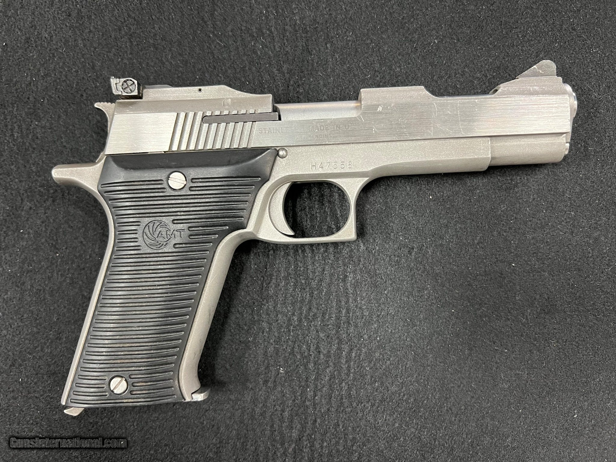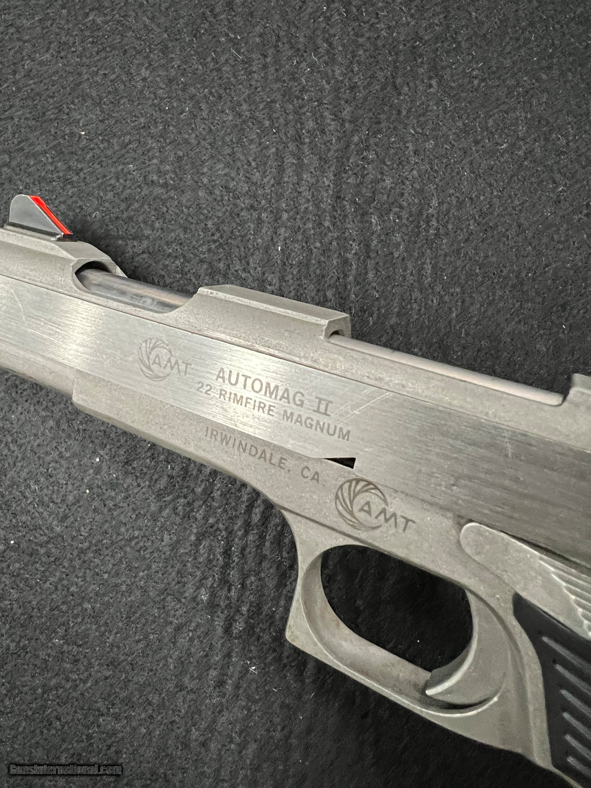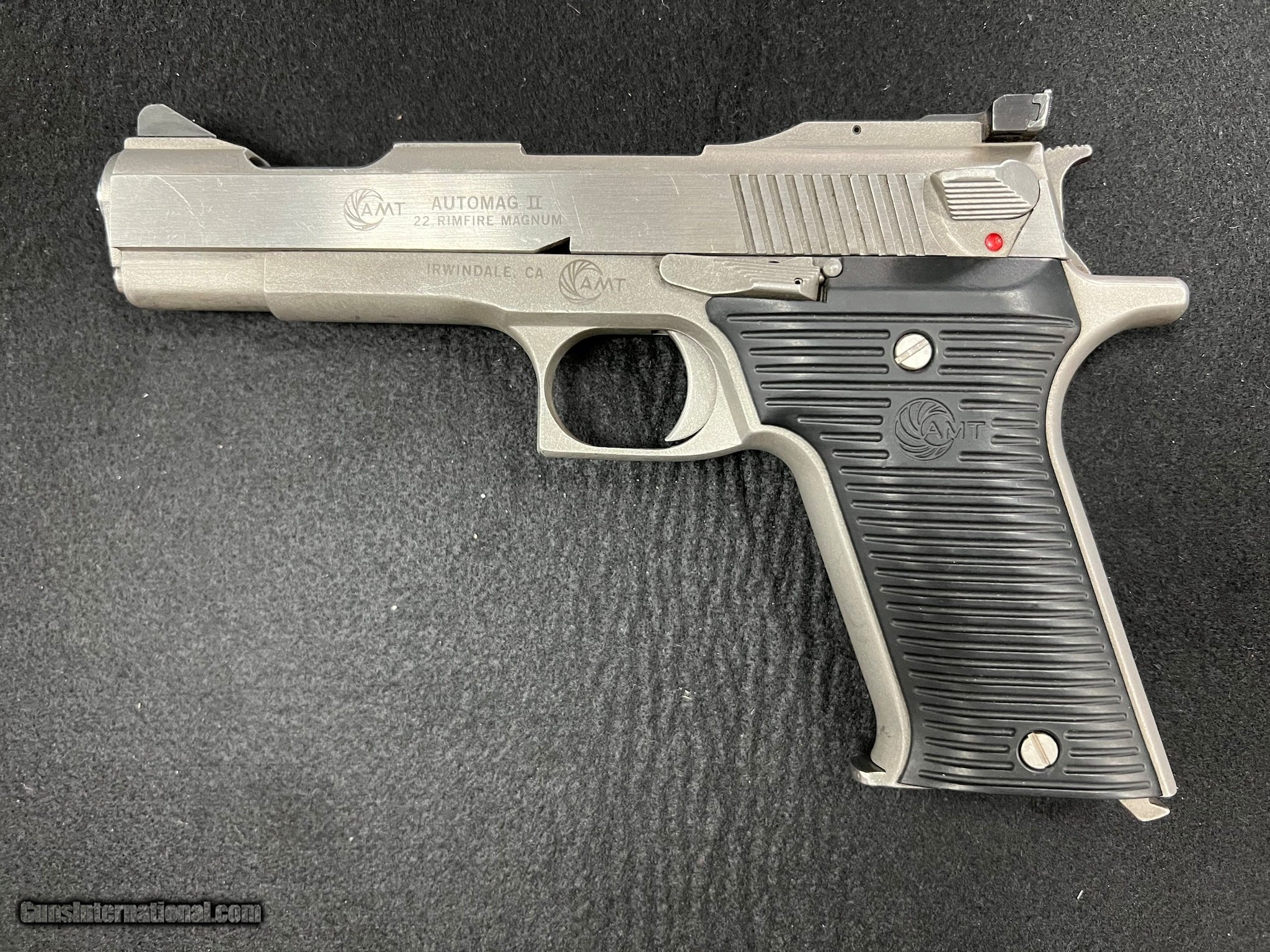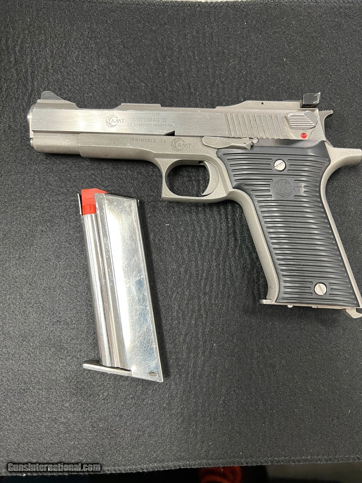 Description: Guns Listing ID: 486561 With two mags Overall condition 7/10 (A11001434) SOLD Manufacturer: AMT Model: Automag II Caliber Info: 22 MAGNUM Condition: Used - Non-Certified Barrels: 4 BARREL Finish: STAINLESS |