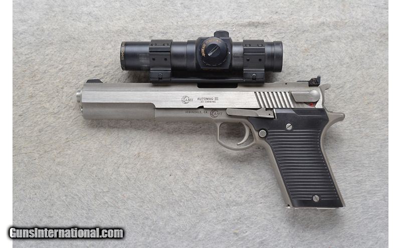 Description: This AMT Model Automag III is a right hand semi-auto pistol in .30 Carbine Cal. It has a 6.5 inch barrel with a rear serrated two tone finish stainless steel slide. A blade front sight and an adjustable notch rear sight and with 3 white sight dots. It is outfitted with a Simmons 11 setting red dot sight. It has ribbed grip black polymer grip panels. .30 Carbine SOLD Chambers: 7 round magazine. Metal Condition: Good. Minor handling/use marks. Bore Condition: Very good. Barrels: 6.5 inch barrel with a rear serrated slide. Weight: 3 lb. 6 oz. Sights: Blade front. Adjustable notch rear. 3 white sight dots. Simmons 11 setting red dot sight. Item Location: Richfield, WI |