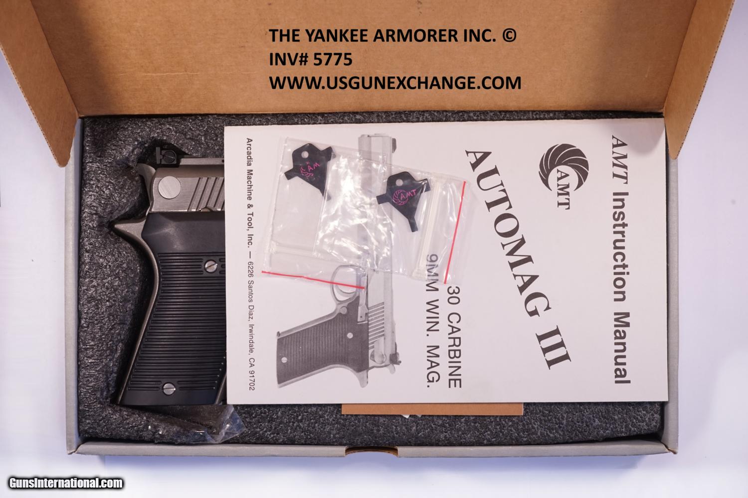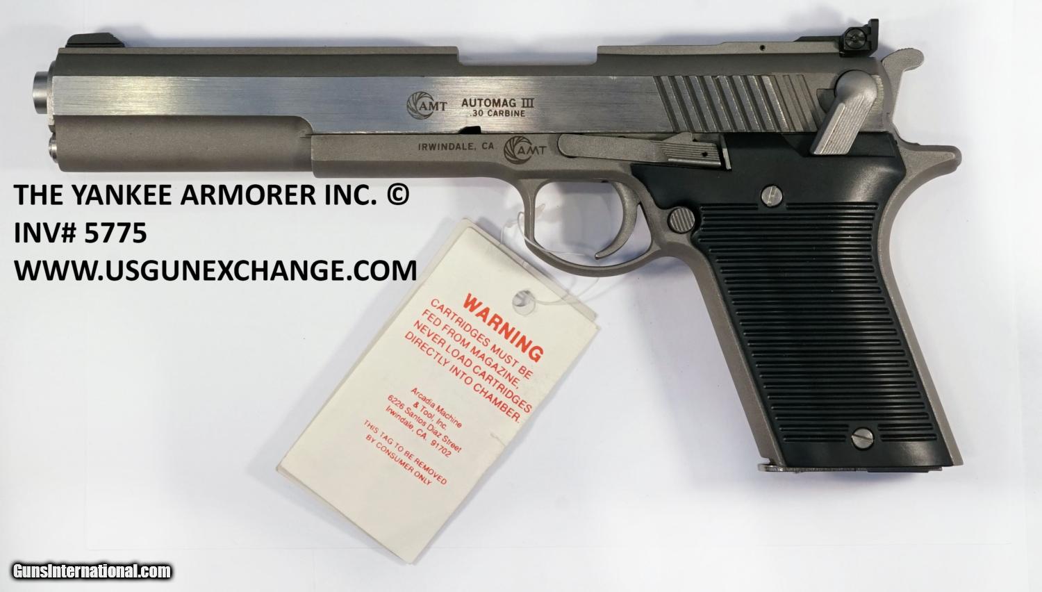 Description: Inv. 5775 AMT Automag III. Cal. .30 Carbine, 6 3/8 inch barrel, Ser. A108XX. Mint, unfired in the original box and is the biggest handful of pistol you ever saw. This is a work of modern gun makers art and still has the original hang tag and all the factory papers. All stainless steel and made only one year, 1997. The AutoMag III is the only successful automatic chambered to fire the .30 caliber Carbine cartridge. The gun features a fully adjustable Millet white outline rear sight and white dot front sight. It is basically patterned after a 1911A1. It comes with all the original factory issued items including two 8 round magazines and two take down tools, and the original factory warrantee. This gun will turn heads at any range and will prove to be a trophy winner in any competition. It is the King Kong of the firing line. The gun is very scarce, mint unfired in the original box still with the factory hang tag. .....$1495. To purchase this firearm or if you want to request more information contact us at: Email ckgunsymail Phone 201-512-0002 Cell 201-575-6838 FAX 201-215-4759 We accept most major credit cards. Prices shown are Discounted 3% for Cash or Check. The buyer must be familiar with all the laws governing the purchase and the ownership of firearms in their own city and state. The Yankee Armorer, Inc is not responsible for any failure to comply with or observe these laws. The Yankee Armorer, Inc will only ship after full payment and receipt of all required documents. Shipping: Add $35.00 for handguns, $45.00 for long guns. New Jersey buyers are subject to a 7% sales tax. The Yankee Armorer, Inc offers a 3 day inspection period with full refund upon return of intact firearm and in the original condition. The Yankee Armorer, Inc offers a no interest lay away program - 25% down; 25% in 30 days; 25% in 60 days; and full payment in 90 days. Any violation of this policy is subject to restocking and forfeiture of all payments. Any variation from this policy must be agreed to in advance. Unshipped Cancelled sales are subject to a 20% restocking fee. Be advised that all firearms sold by The Yankee Armorer, Inc. or the Gun Exchange, LLC (SELLER) are sold as collector’s items. They have not been fired or tested for safety and must be examined by a license gunsmith prior to use. By purchasing any item from the (SELLER), you are agreeing to hold the (SELLER) free from any damages or lawsuits of any nature. Any item left for transfer or storage will be charged to $25.00 per month, per item from the day of its receipt. Any variation from this policy must be agreed to in advance. Store hours 10:00 am to 5:00 pm Tuesday -Saturday. It's always best to call for appointment. Store 201-512-0002, cell 201-575-6838. SOLD Manufacturer: AMT Model: Automag III Serial Number: A108XX Caliber Info: .30 Carbine |