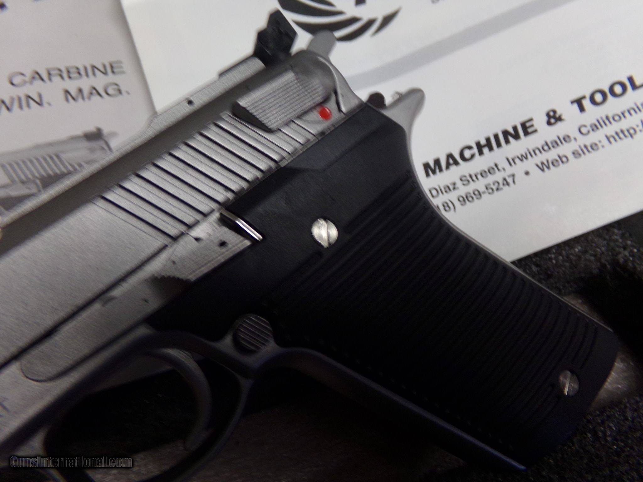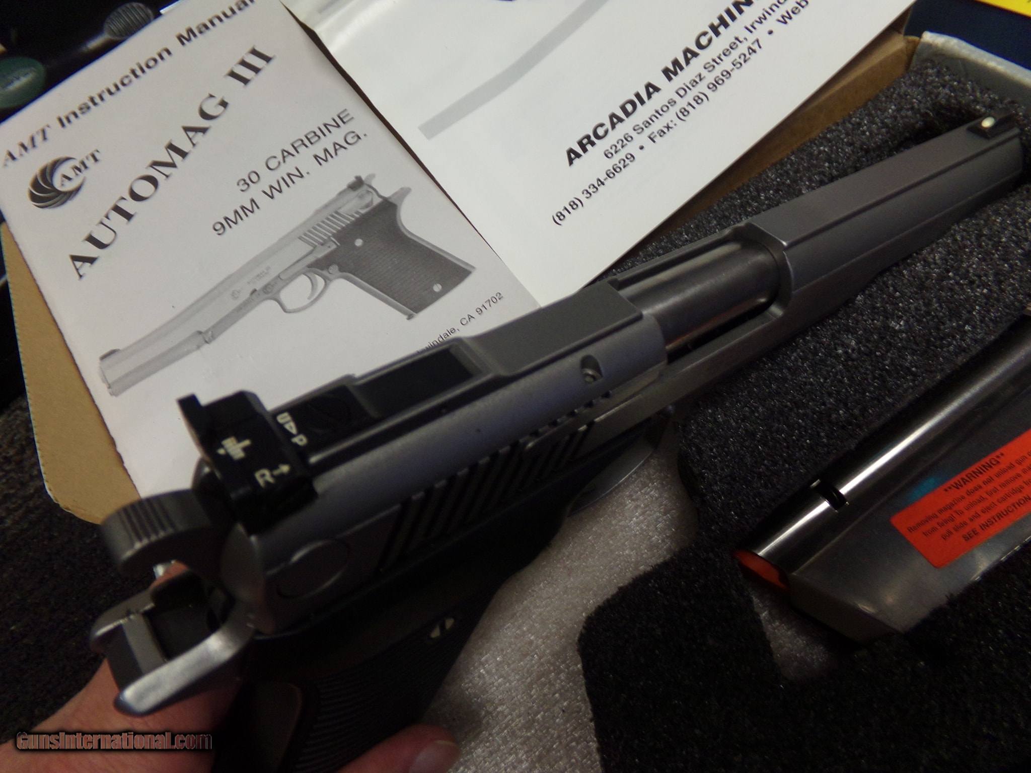 Description: Guns Listing ID: 577608 AMT Automag II semi-automatic pistol in .30 Carbine. This pistol comes with the original box, manual, and an 8-round magazine. The AutoMag III was designed by Harry Sanford, creator, and designer of the original AutoMag. It was introduced in 1992 and discontinued in 2001. The AutoMag III looks extremely different from the original AutoMag, despite both being designed by the same person. The AutoMag III does not use a magnum-caliber round, however; it uses the older .30 Carbine round known for being used in the M1 Carbine. SOLD Manufacturer: AMT Model: Automag III Caliber Info: .30 CARBINE Condition: Used - Non-Certified Barrels: 6.5 BARREL Finish: STAINLESS |