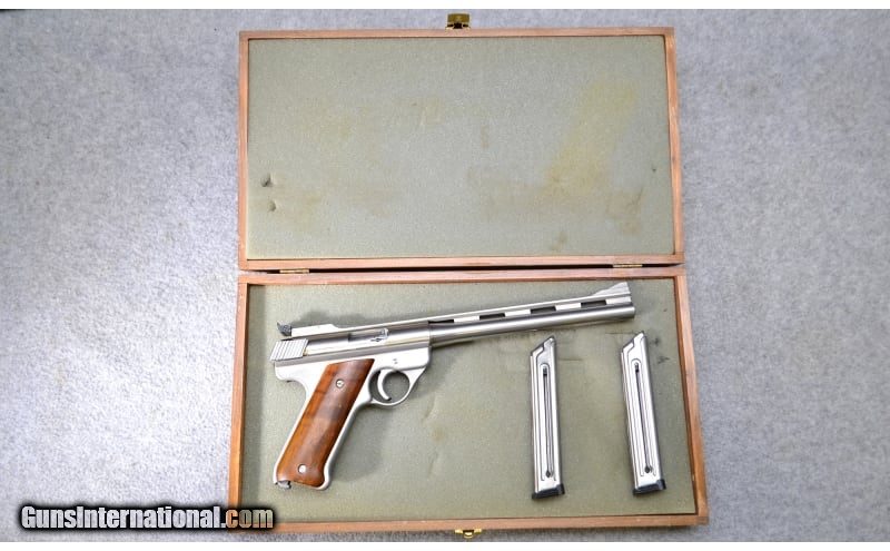 Description: Introducing the rare AMT Baby Auto-Mag, an exquisite semi-automatic pistol that stands as a testament to unique craftsmanship and precision engineering. Created by Arcadia Machine & Tool, this .22 LR caliber firearm is a must-have for collectors and enthusiasts alike, with only about 1,000 examples ever made. Its distinctive matte stainless finish and sleek wood grips combine to offer not only durability but also a striking visual appeal that will add value to your firearm's collection. .22 Long Rifle SOLD Barrels: 8.5 Weight: 2.5lbs Item Location: Hammond, IN |