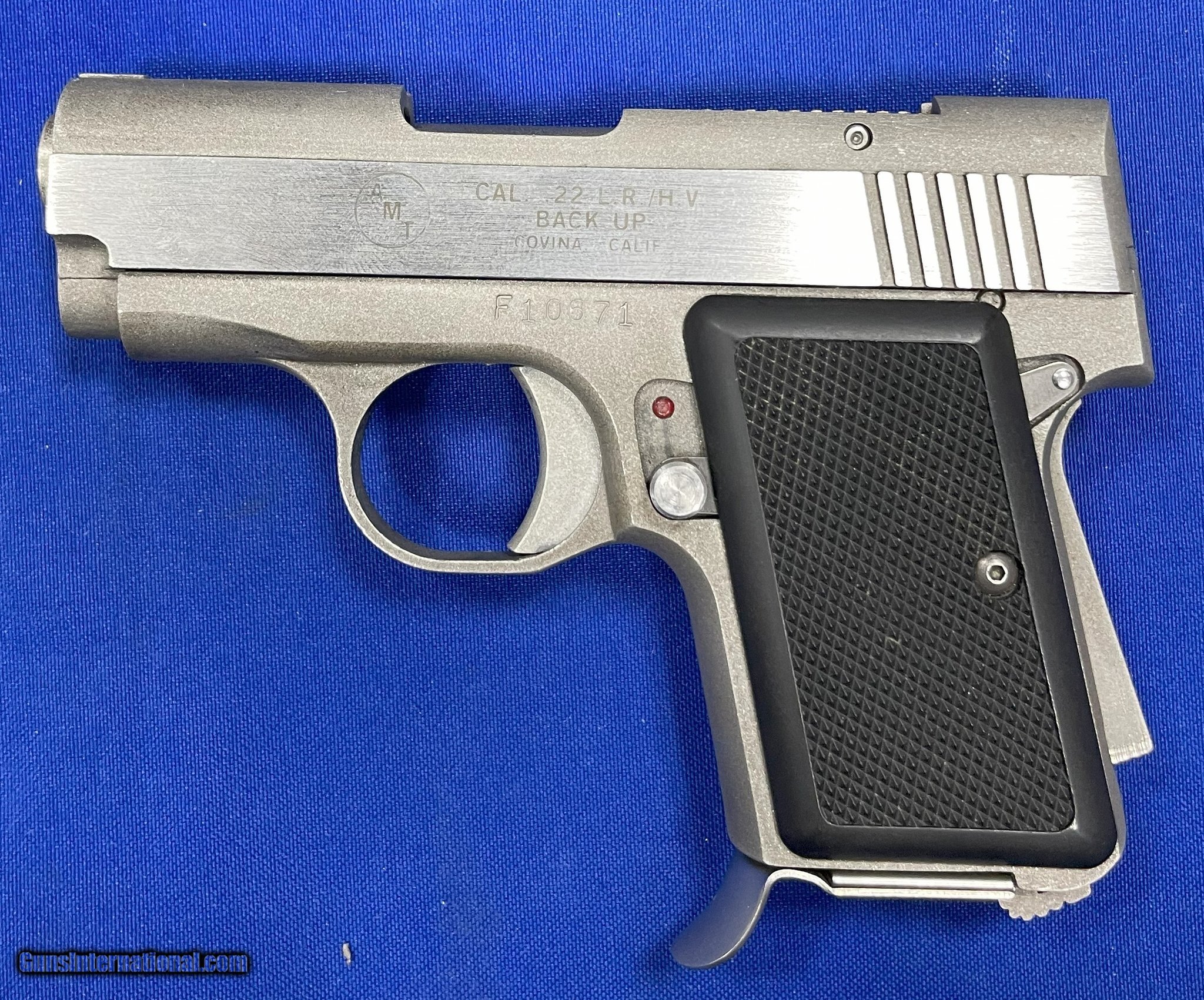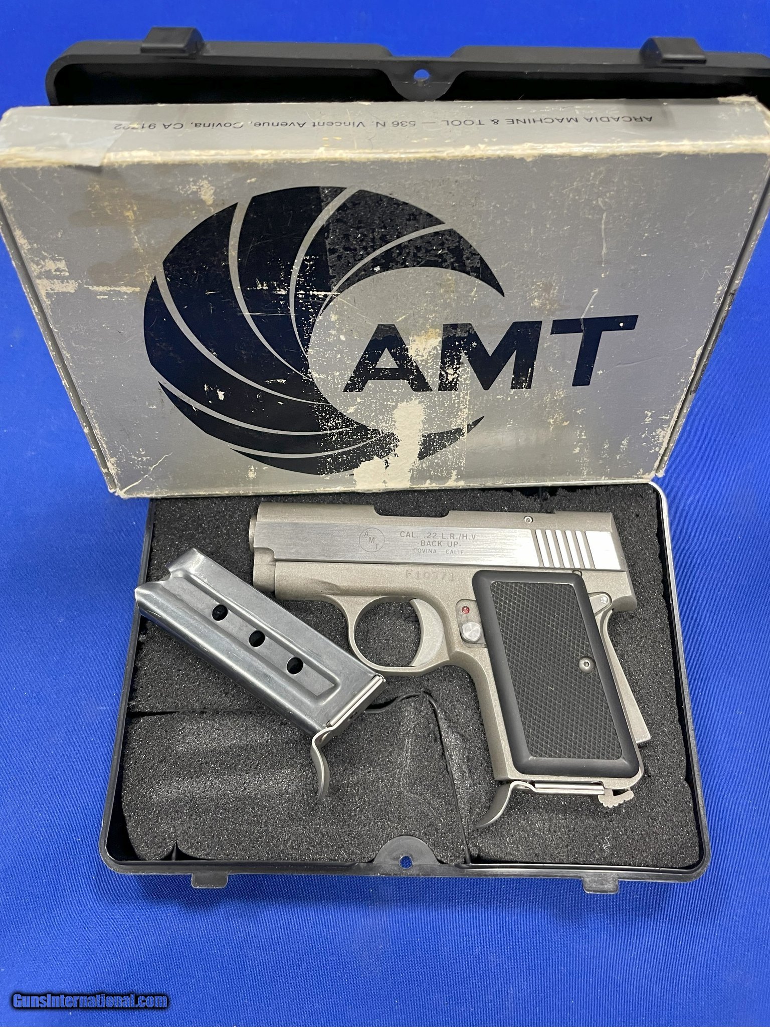 Description: Guns Listing ID: 499073 Comes with hard case, cardboard box and 2 magazines. SOLD Manufacturer: AMT Model: Back Up Caliber Info: .22 LR Condition: Used - Non-Certified Barrels: 2 Action: SEMI AUTOMATIC Finish: stainless |