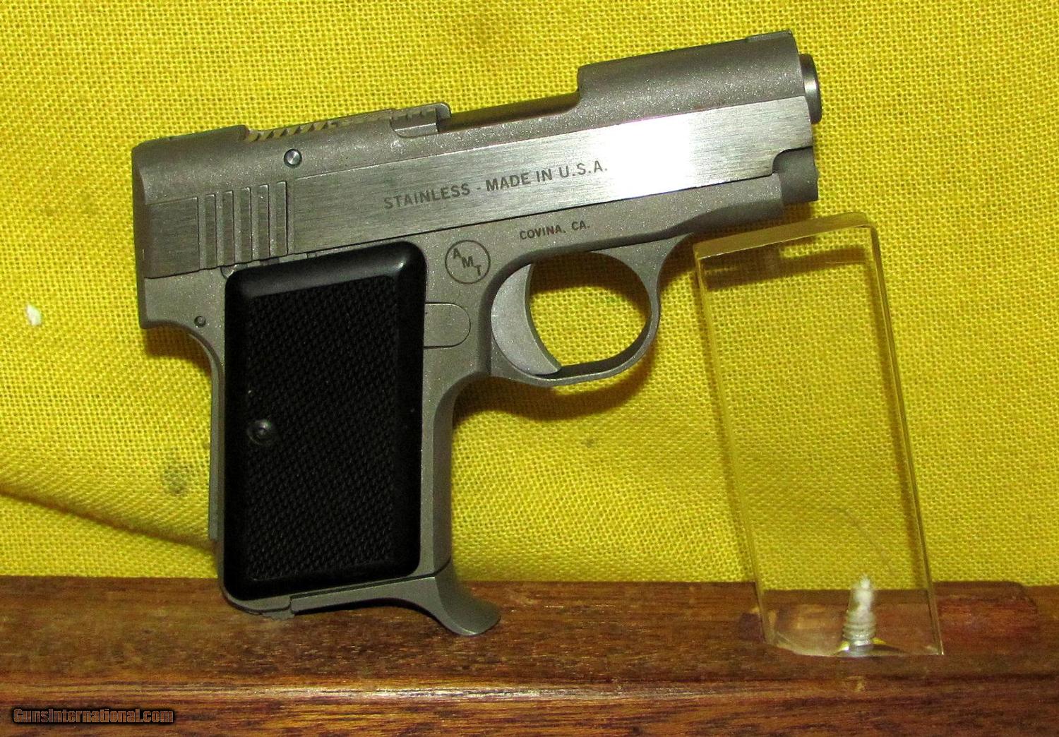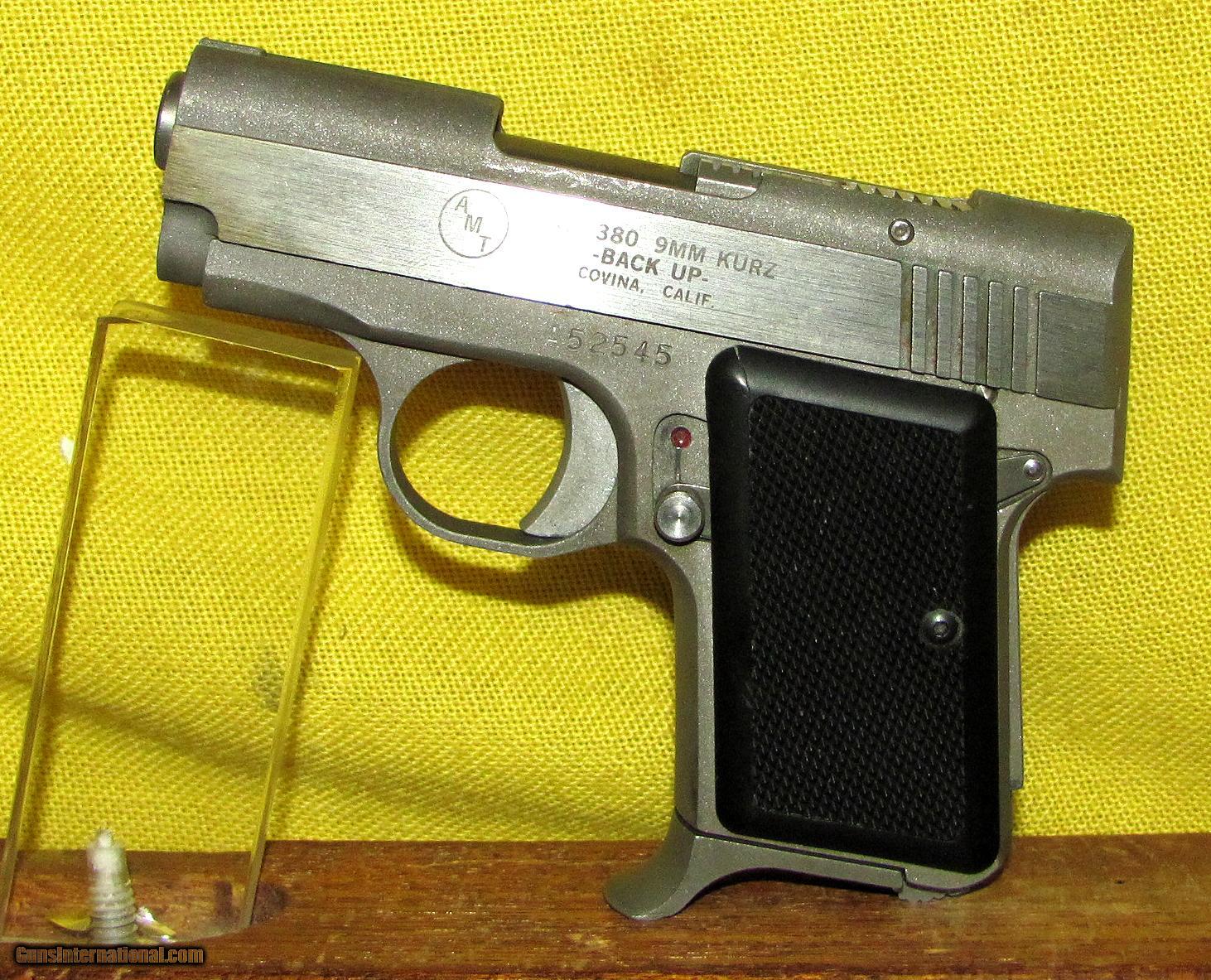 Description: AMT model BACK UP in .380 ACP CAL., with 2 1/2" barrel. Color STAINLESS STEEL. AMT MODEL BACK UP, COVINA CAL. STAMPED ON RECEIVER, BORE EXCELLENT, GRIPS EXCELLENT, 98% ORIGINAL FINISH. OUR NEW STOCK # D31218 Condition 98%. Serial number A52515. SOLD |