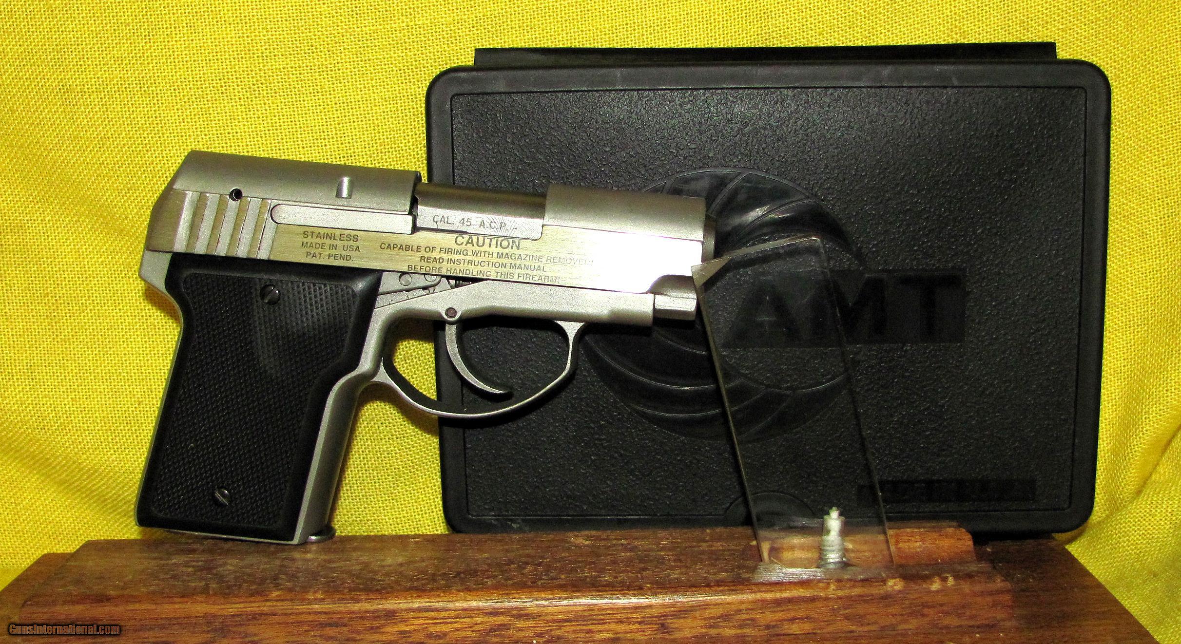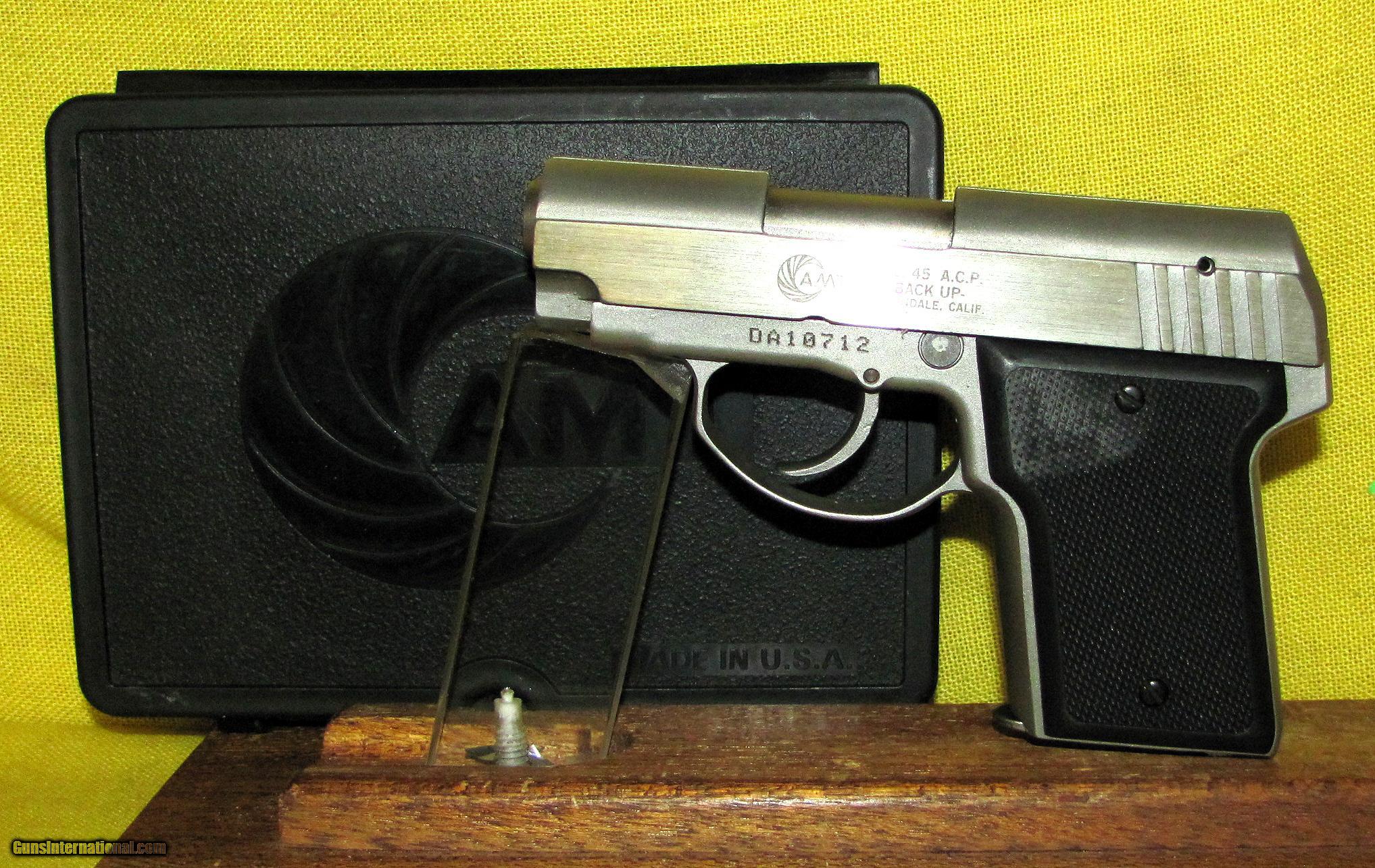 Description: AMT model BACK-UP in .45 ACP CAL., with 3" barrel. Color STAINLESS STEEL. AMT MODEL BACK-UP, COMES WITH ONE FACTORY MAGAZINE, BOX AND PAPERS, LIKE NEW CONDITION APPEARS TO BE UNFIRED. OUR NEW STOCK # D31737 Condition LIKE NEW. Serial number DA10712. SOLD |