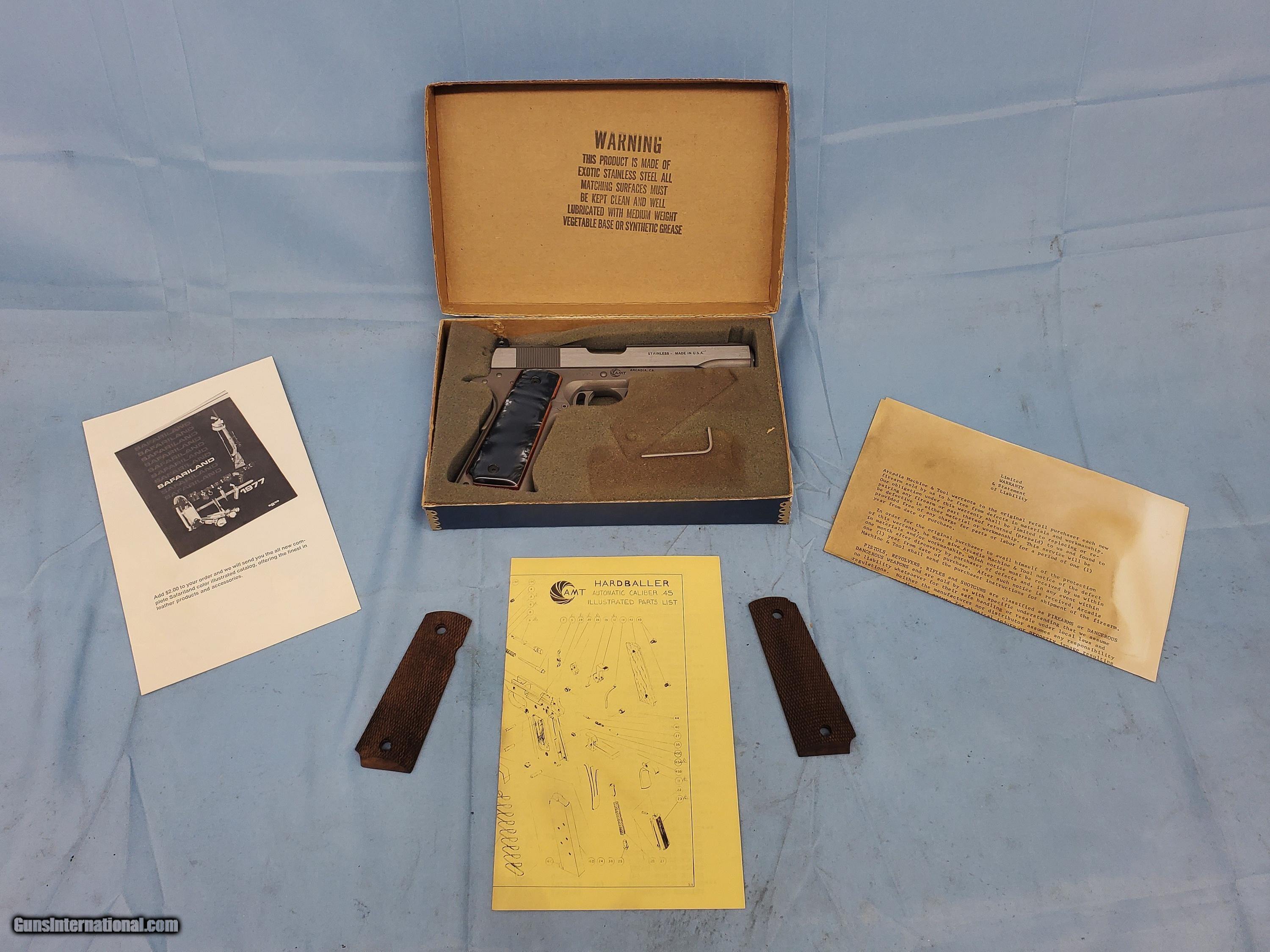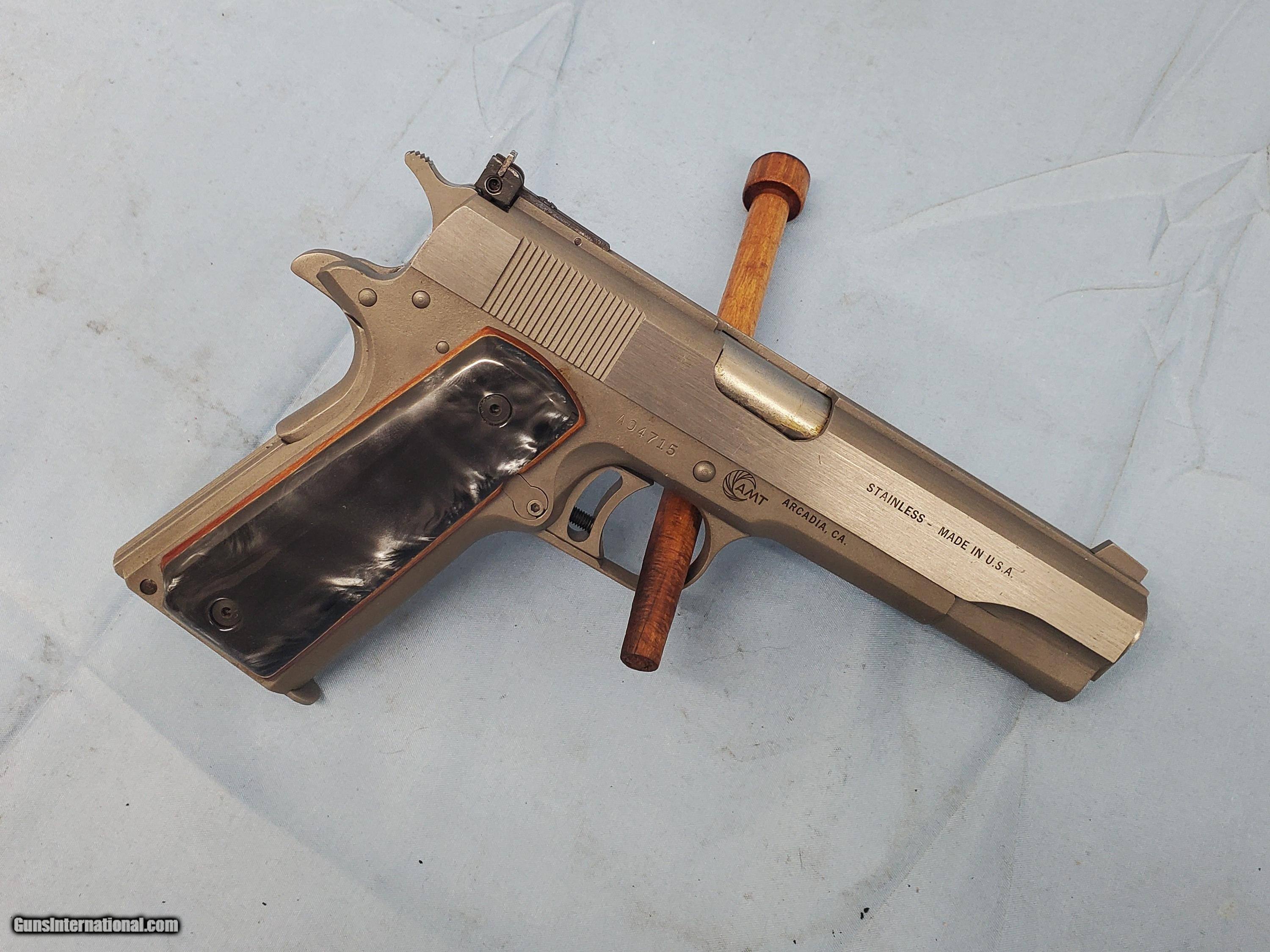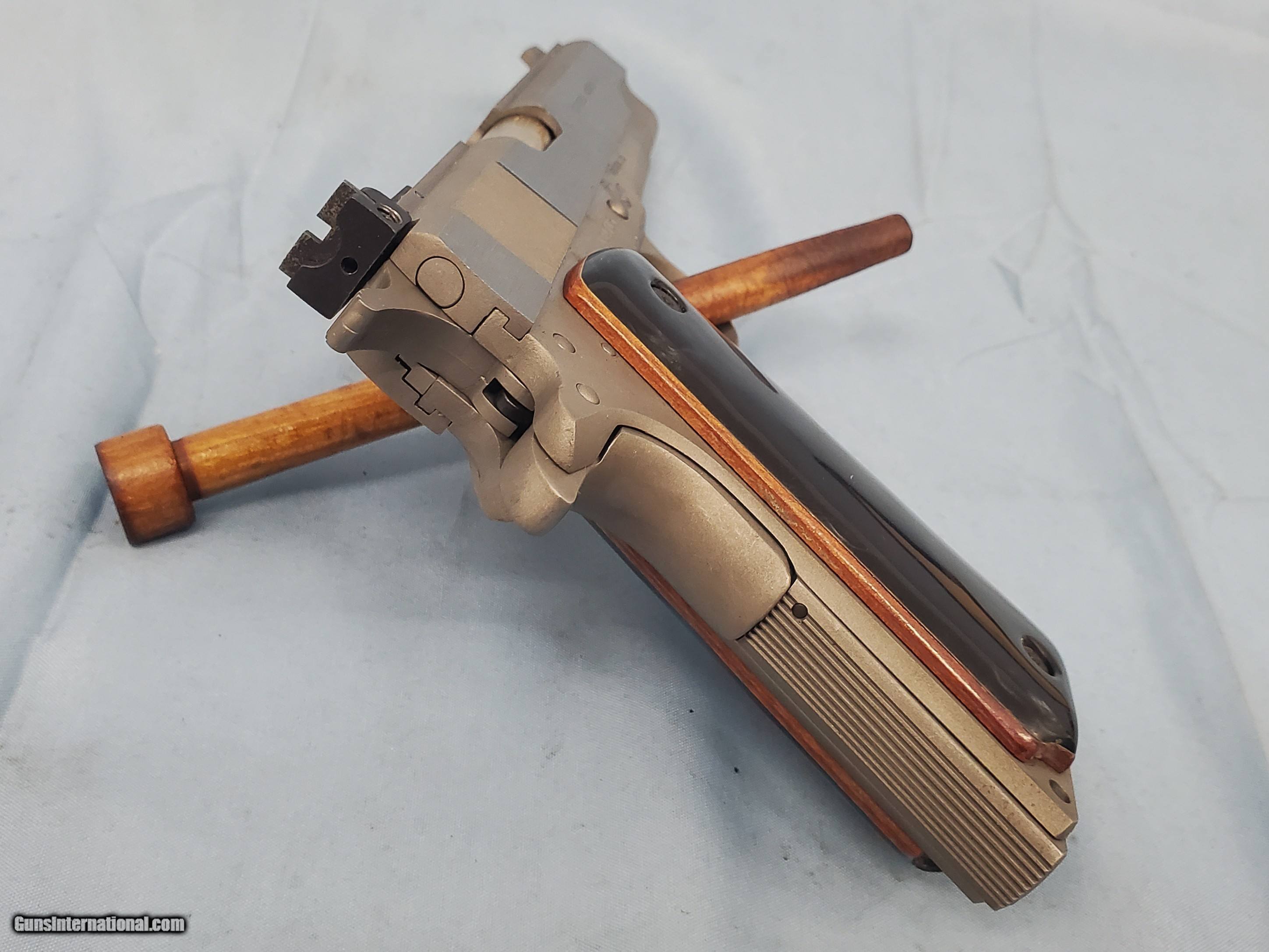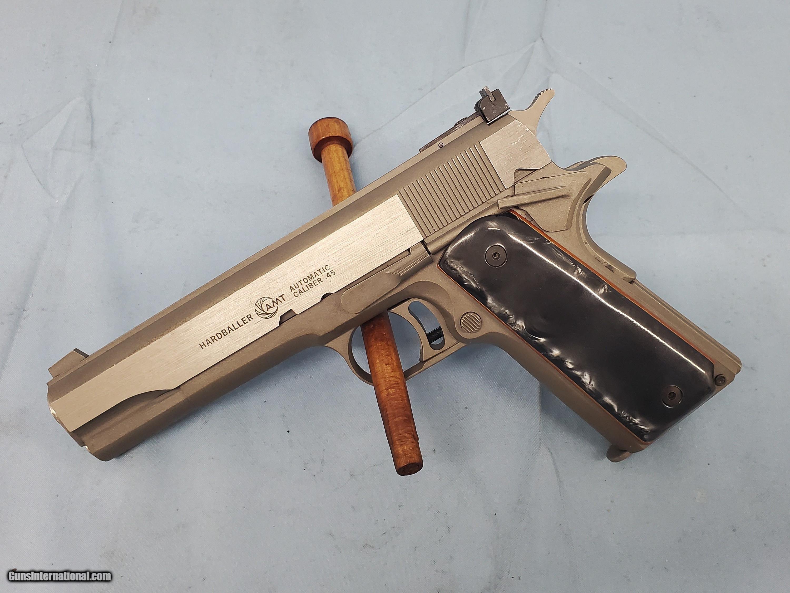 Description: MADE IN THE USA. 5'' BARREL. INCLUDES WRENCH, GRIPS, BOX, AND PAPERWORK. ALL FACTORY AND VERY GOOD CONDITION. PLEASE ADD $35 FOR SHIPPING. SOLD Handgun Caliber: .45 ACP (.45 Auto) Manufacturer: AMT Model: 1911 Condition: EXCELLENT Metal Condition: EXCELLENT Wood Condition: EXCELLENT Bore Condition: E |