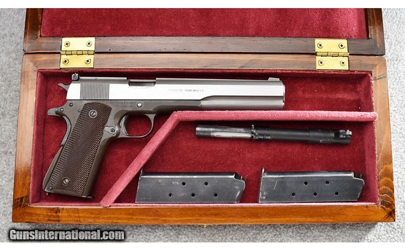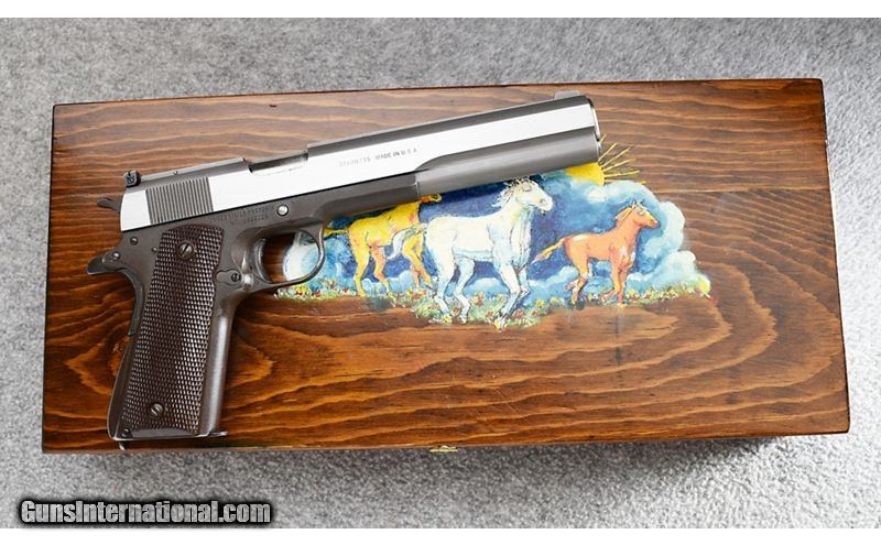 Description: AMT (Arcadia Machine & Tool) was founded in 1977 and produced 1911 style and large frame magnum pistols. This gun is an AMT Hardballer slide on a Colt M1911 A1 frame. Gun has a few use and handling marks on frame but has been well maintained. Bore is excellent! The Colt frame is stamped with "US Army" and "United States Property". Complete with wooden box made by previous owner and hand painted. Box also contains and extra barrel and extra mags. Nice setup for the target shooter. .45 ACP SOLD Metal Condition: Very Good Bore Condition: Excellent Barrels: 7 Triggers: Original Butt Pad: Checkered Brown Plastic Grips Weight: 42 oz. Sights: Patridge Front - Adjustable Square Notch Rear Item Location: Wheeling |
