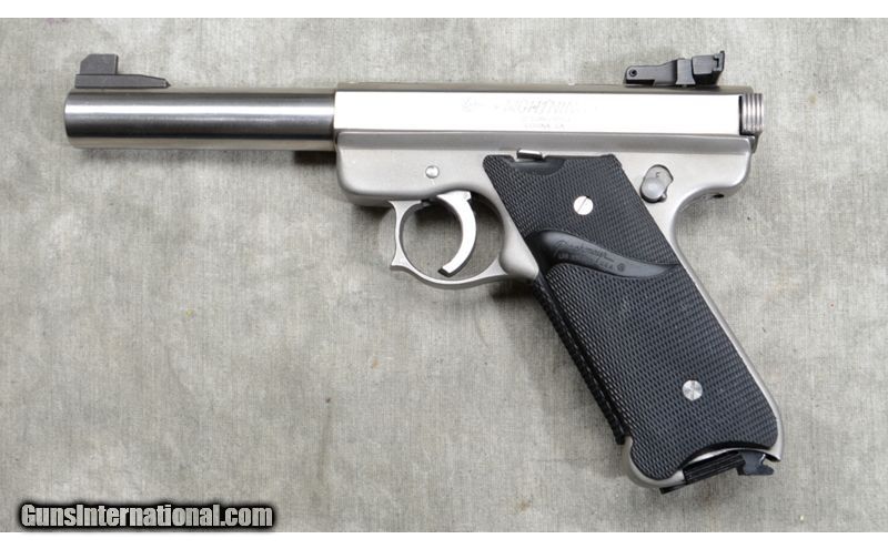 Description: .22 Long Rifle SOLD Chambers: 10 + 1 capacity semi-automatic. Metal Condition: Excellent. Very little evidence of usage. Wood Condition: Excellent. Barrels: 5 inch stainless match barrel. Triggers: Factory Factory single action trigger. Sights: Post and adjustable notch open sights. Item Location: Rogers |