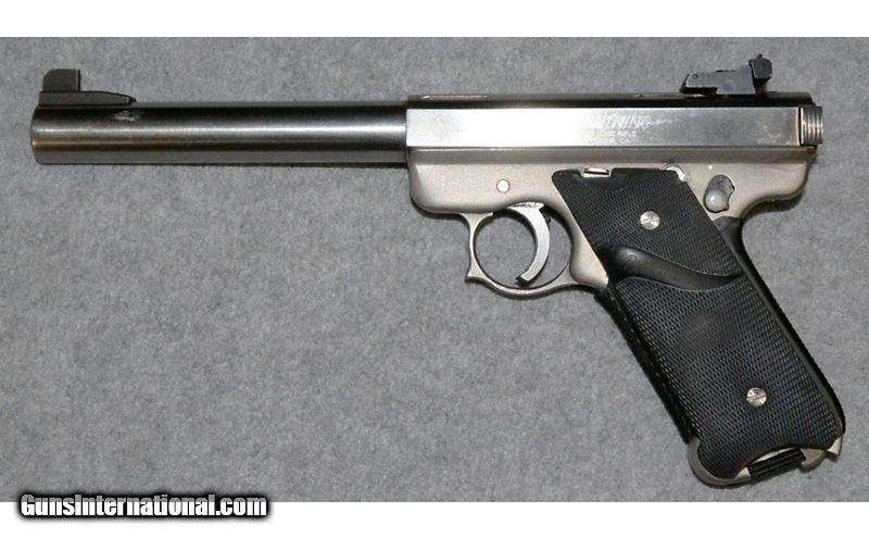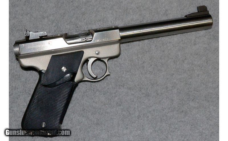Description: .22 Long Rifle SOLD Metal Condition: "Good-Very Good, Some minor damage and discoloration. There is a small gouge on the left side of the barrel near the front sight. Wood Condition: "Good, The left panel has been worn down somewhat. The rubber remains in good shape. Bore Condition: "Very Good, Clean and shiny. Barrels: 6.5" Bull barrel Triggers: Wide factory target trigger Butt Pad: Black rubber Pachmayr grips Weight: 2lbs 11oz Sights: Fixed front sight with adjustable rear sight Item Location: Lacey, WA |