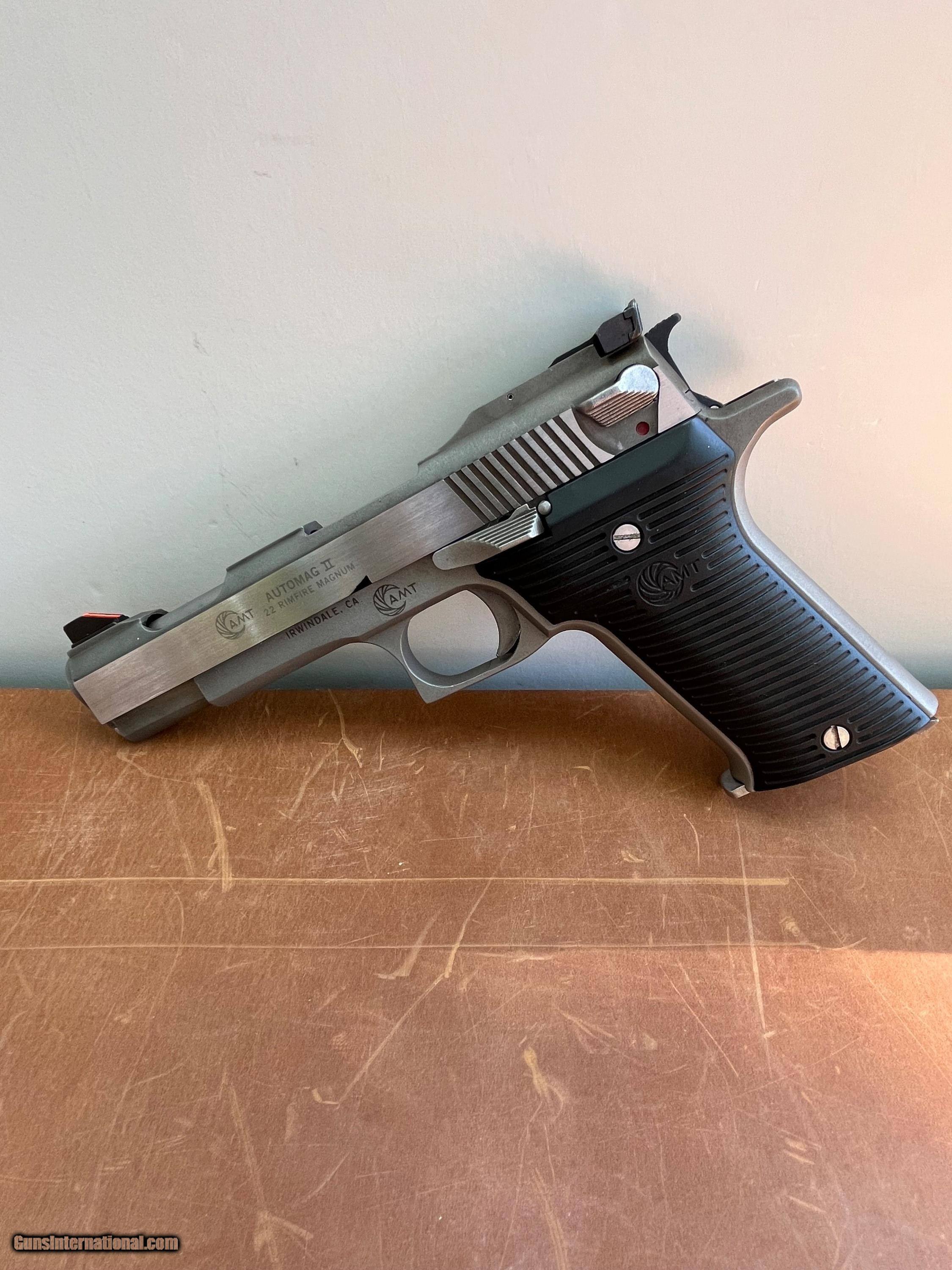 Description: Automag II AMT 22 magnum auto pistol. Possibly the most handy little 22 magnum pistol made! 4-1/2" barrel and 9 round magazine Stainless steel construction & no longer made. These aren't the easiest to find. This one's priced to sell! See pictures for details. Glad to take more pictures and address any questions. I will only ship where and to whom it's legal. Please know your states magazine laws! Cleared personal/certified checks and USPS money orders gladly accepted. SOLD Handgun Caliber: .22 WMR (.22 Magnum) Manufacturer: AMT Model: Automag II Barrel Length: 4 |