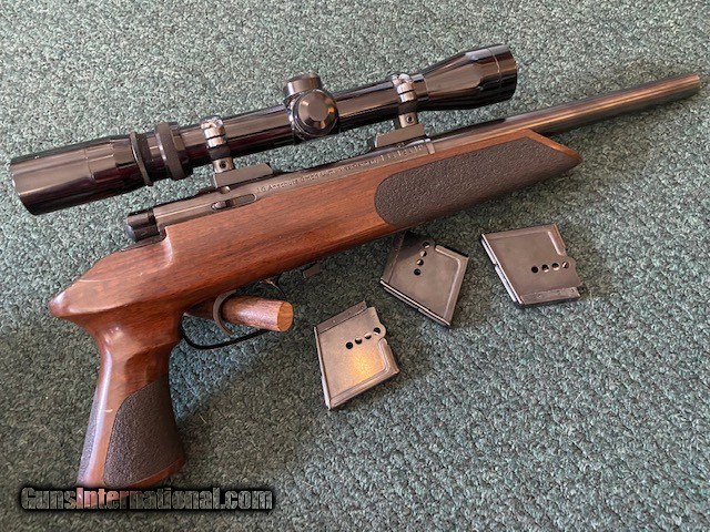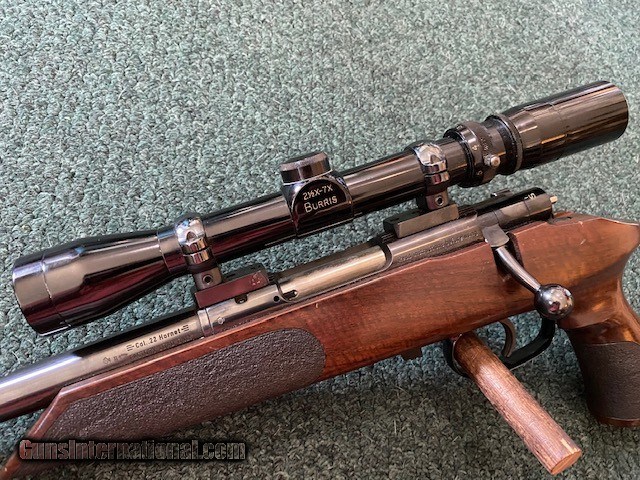 Description: J. G. Anschutz, Exemplar, GmbH Ulm, West Germany, .22 Hornet, 10" barrel, 3 clips, overall condition is 98%, stipple forend and grip, Burris 1 1/2x-7x scope. Serial no. 1341241P. For further information and quicker response call John at 941-748-7318. SOLD |