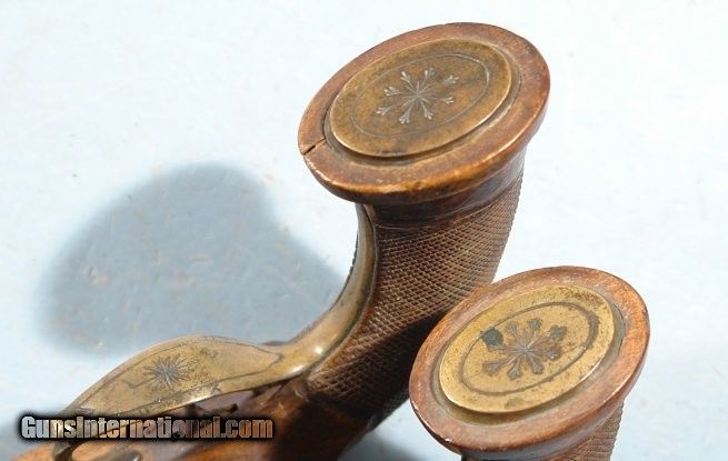 Description: NAPOLEONIC WARS 1ST EMPIRE FRENCH FLINTLOCK BRASS BARREL OFFICER’S PISTOLS CIRCA 1811-15. 13” o/a with 7” brass octagon .64 caliber smoothbore sighted barrels with early Liege proofs at the left breech. All original and in fine condition. Walnut stocks with checkered grips. Engraved brass mounts and wood ramrods with trumpet form tips. Plain locks and hammers with all the original parts and in perfect working order. Excellent condition with dark mellow brass. Extra crisp engraving. Stocks with all the original finish and crisp checkering. Barrels with excellent bores. Extra nice pair of 1st Empire Officer’s Pistols of the type that could have been at the Battle of Waterloo. SOLD Antique: Yes |