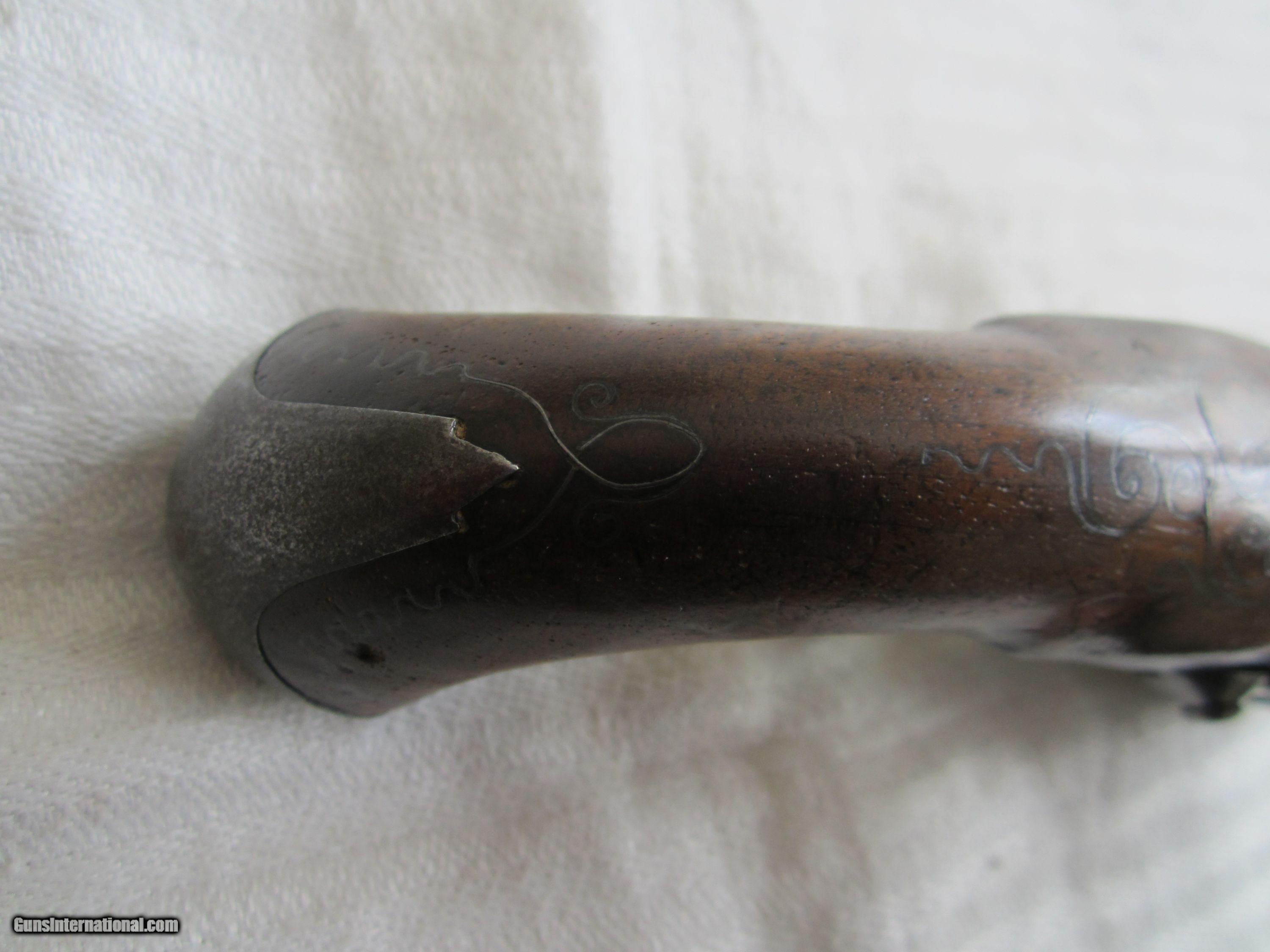 Description: A small well made ( 6 & 1/2" overall) Flintlock pistol to be carried in a gentlemans pocket or perhaps in a ladies muff. It is approximately ..50 caliber with a cannon type barrel which is partially round and partially octogon. All metal parts were I believe blued including the steel ramrod. There is no makers name or proof mark evident, . The prior owner stated that under the barrel he found the following 4 marks: R D B and an upside down "Y". The metal is quite clean overall. .I estimate this weapon was made in the early 1700's and probably in England based on the design and level of craftsmanship. There is a full walnut stock which is in very good condition . This is an antique- No FFL required. Can be shipped directly to the buyer. Note: For some reason the pictures of this pistol don't do it justice. It is really a very handsome weapon in excellent condition! SOLD Antique: Yes Manufacturer: unknown (English ?) Model: Pocket Flintlock Pistol Serial Number: none Caliber Info: ..50 Bore: smooth, no rifling Condition: very good Metal Condition: Very Good Wood Condition: Very Good Bore Condition: -- Barrels: 1 Barrel Type: 1/2 octogon-1/2 round Action: flintlock Triggers: one Stock: full - walnut Finish: Remains of blueing? Sights: none Manufacture Date: 1720-1740 Engraving: on top of barrel Item Location: California-San Diego |