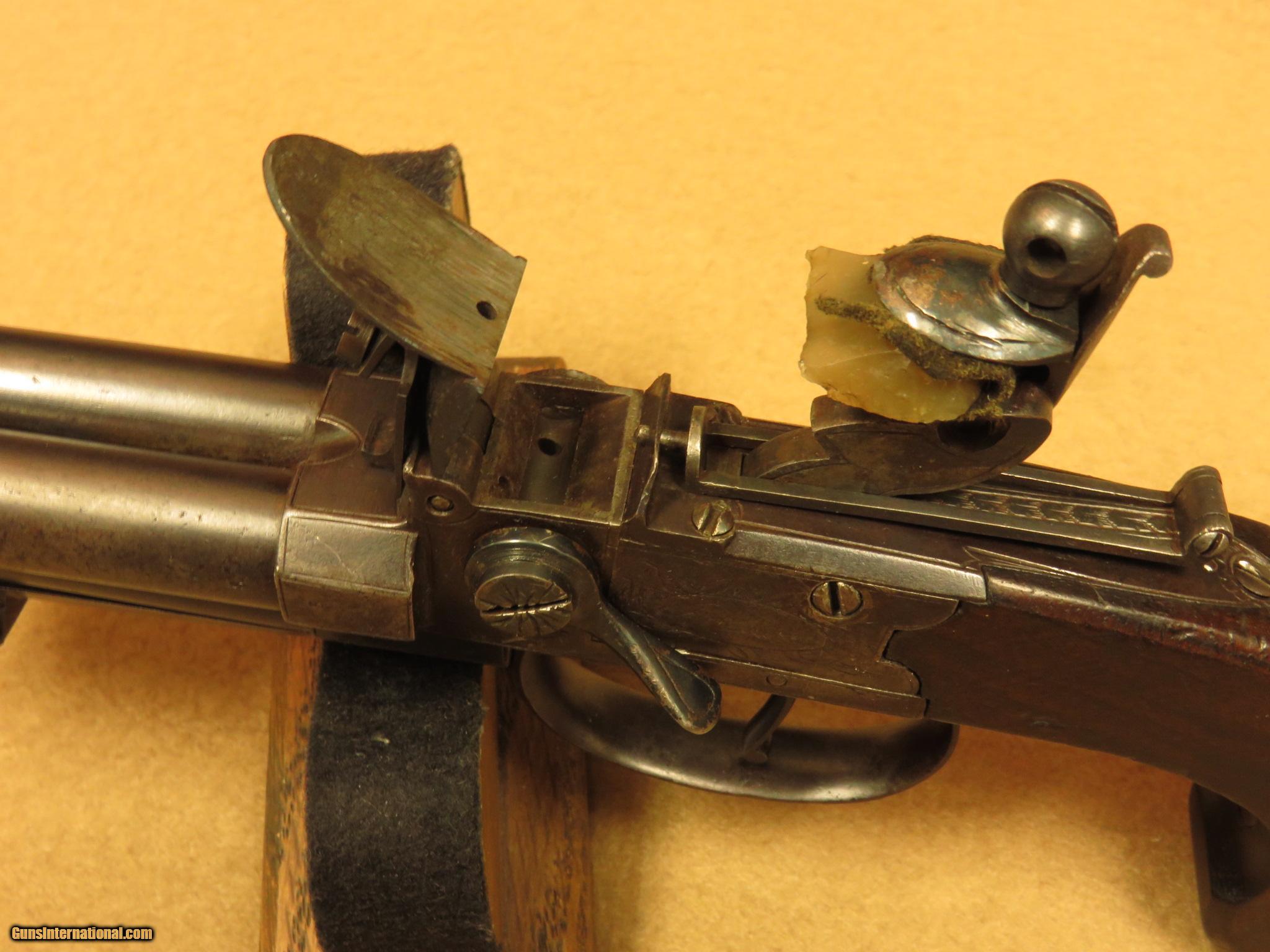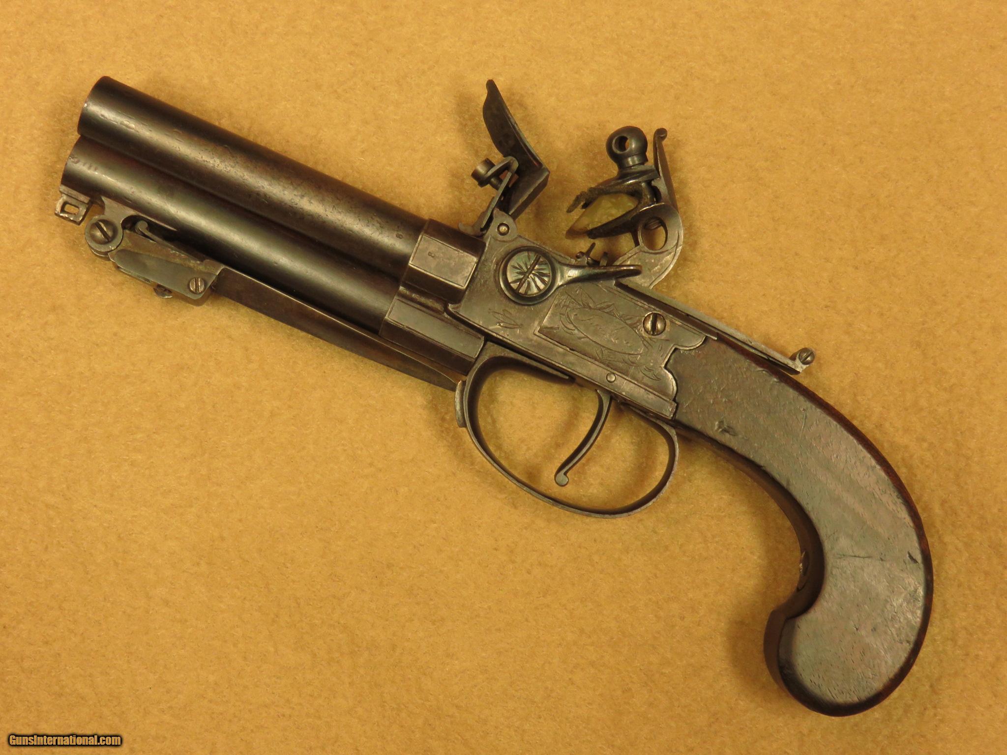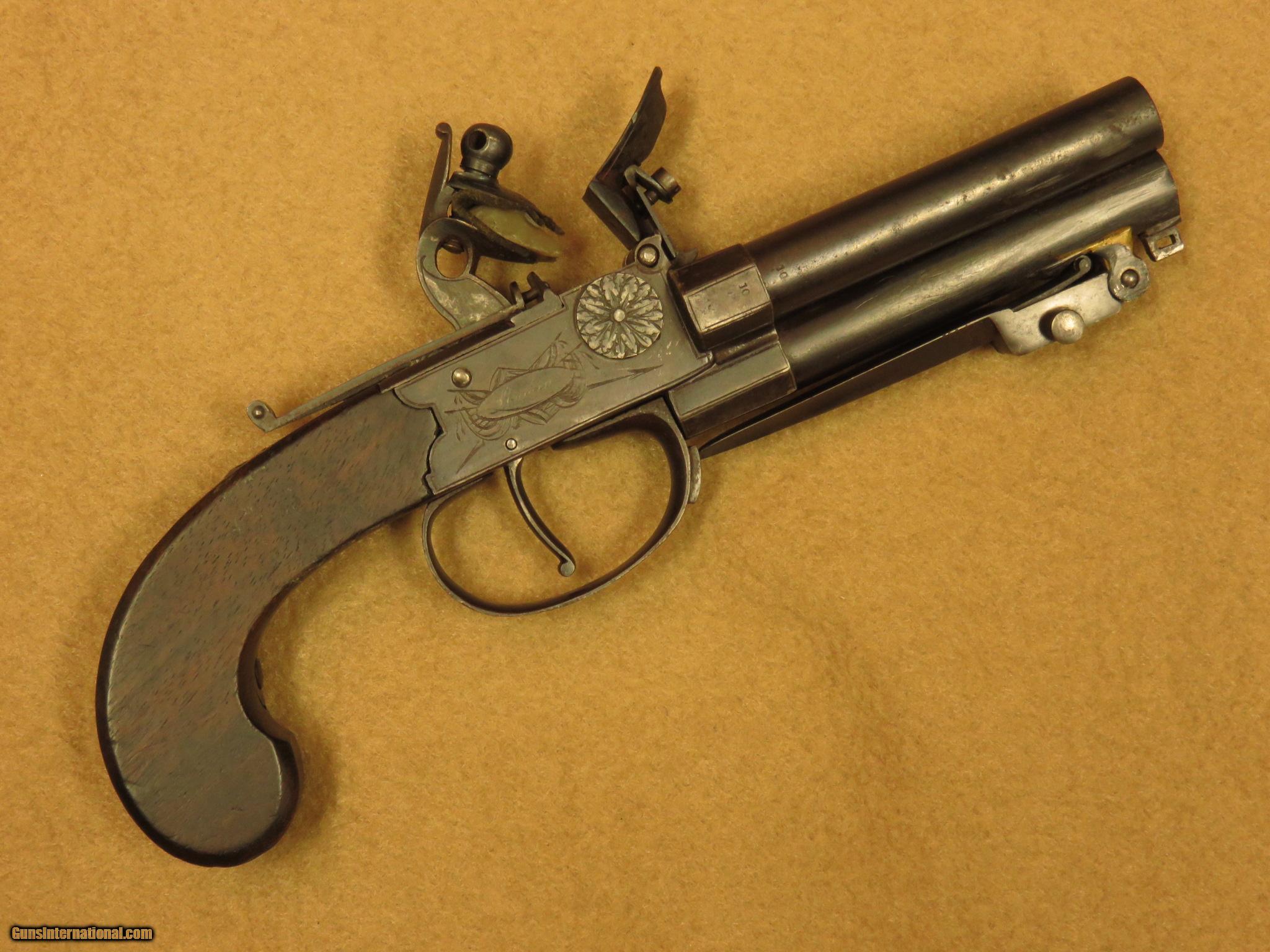 Description: A circa 1810 English flintlock pistol with 3 1/2 inch barrels, this compact little pocket gun is marked "Jackson, London" and has a 2 1/2 inch spring loaded bayonet on the bottom barrel. The .40 caliber barrels are smooth bored with faux grooves in the last 1/4 inch to resemble rifling. The barrel selector on the left side rotates the breech block, in order to fire one barrel at a time. There is a sliding bar safety below the hammer. The gun has minimal English engraving and is in excellent working order. Cased with the gun is a number of balls, a piece of flint, tool, and an old, wooden handled pocket knife in poor condition. Unique close-in self defense pistol with 2 extra barrels over the usual single barrel guns of the time. PRICE: $1,850 We are Antique & Modern Firearms in Lexington, KY, dealer of fine firearms since 1974. PH. 859-276-1419 We Buy, Sell and Trade Firearms & Knives. Have a Individual Firearm, Firearms Collection, or Firearms Estate to sell, let us know, we can buy or consignment sell it for you. (sales at am-firearms) SOLD Antique: Yes |