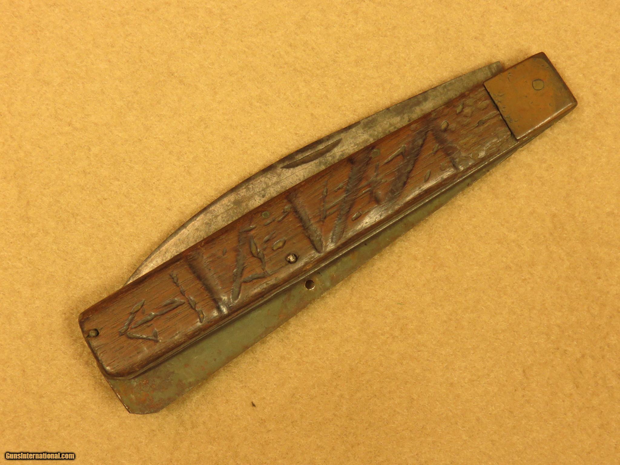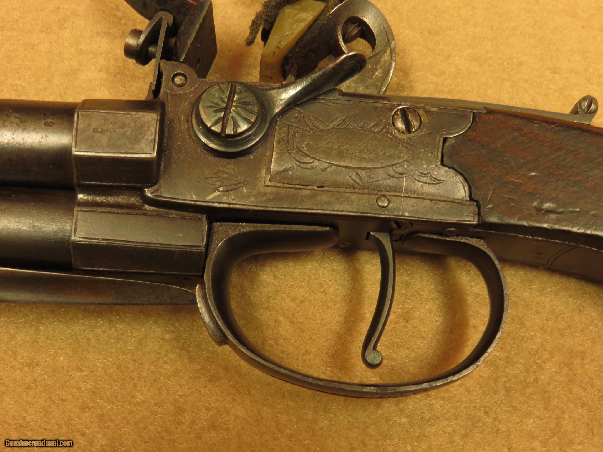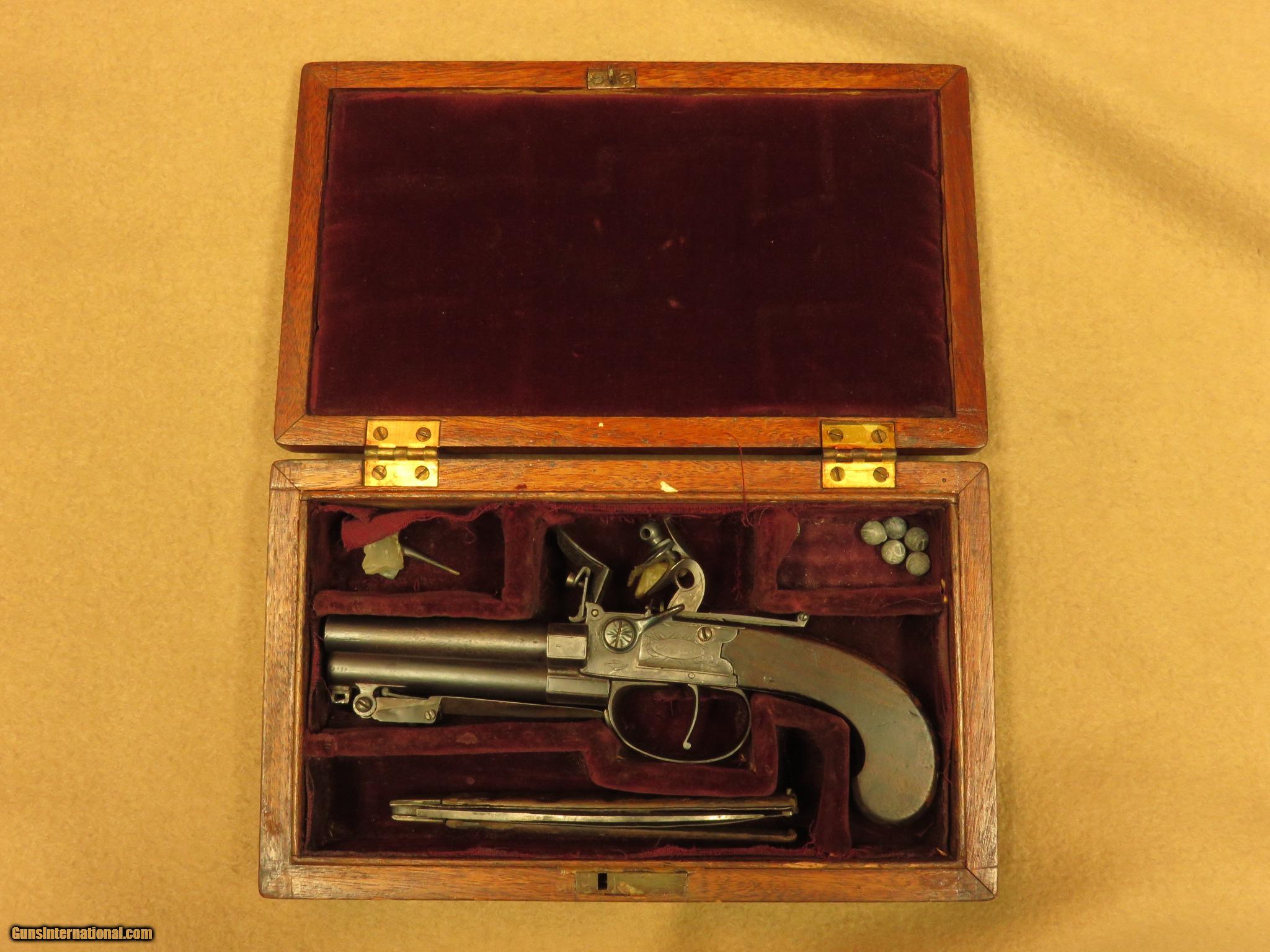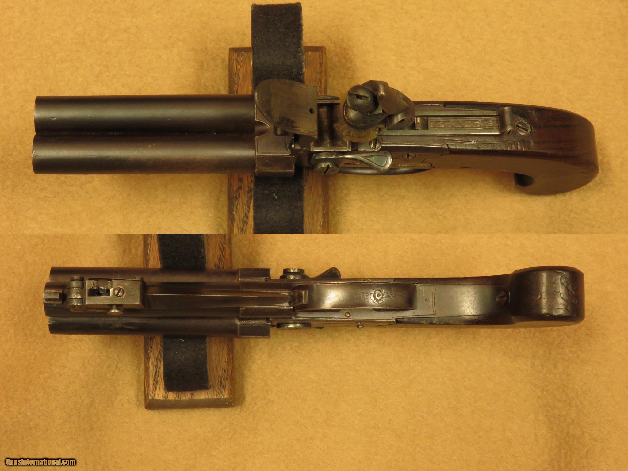 Description: A circa 1810 English flintlock pistol with 3 1/2 inch barrels, this compact little pocket gun is marked "Jackson, London" and has a 2 1/2 inch spring loaded bayonet on the bottom barrel. The .40 caliber barrels are smooth bored with faux grooves in the last 1/4 inch to resemble rifling. The barrel selector on the left side rotates the breech block, in order to fire one barrel at a time. There is a sliding bar safety below the hammer. The gun has minimal English engraving and is in excellent working order. Cased with the gun is a number of balls, a piece of flint, tool, and an old, wooden handled pocket knife in poor condition. Unique close-in self defense pistol with 2 extra barrels over the usual single barrel guns of the time. PRICE: $1,850 We are Antique & Modern Firearms in Lexington, KY, dealer of fine firearms since 1974. PH. 859-276-1419 We Buy, Sell and Trade Firearms & Knives. Have a Individual Firearm, Firearms Collection, or Firearms Estate to sell, let us know, we can buy or consignment sell it for you. (sales at am-firearms) SOLD Antique: Yes |