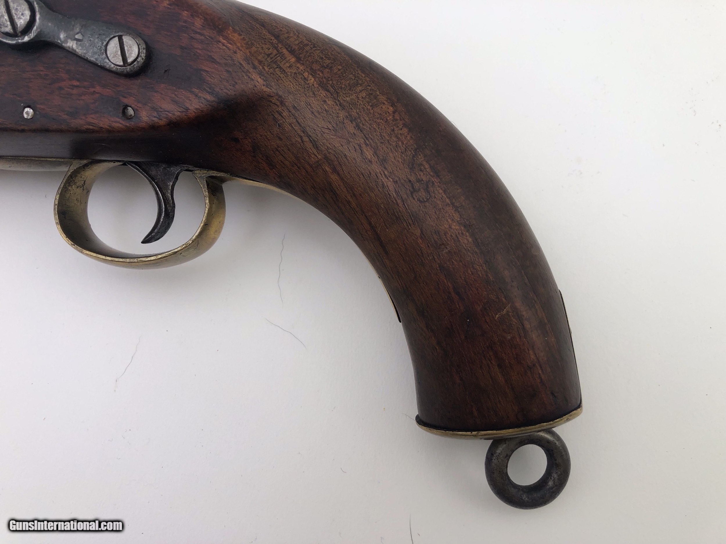 Description: An original 19th century British Sea Service or Coast Guard percussion, single shot pistol with an iron belt hook on the left side of the stock. The lock is stamped with a crown over “VR”, and “Tower” at the rear edge. There are six British proof marks stamped into the top of the barrel, near the breech. The original captive iron, swivel ramrod is intact. The pistol is fitted with typical British military style brass fittings. There is an iron lanyard swivel at the butt of the walnut grip/stock. Caliber: .58 Percussion Overall Length: 11.25" Barrel Length: 5.875" Condition: Iron parts a nice grey brown patina- Brass parts are a light mustard color – Wood is very good with minor nicks and bumps – Action is very crisp – All markings clear SOLD Antique: Yes Manufacturer: Tower Model: Sea Service Barrel Length: 5.875 |