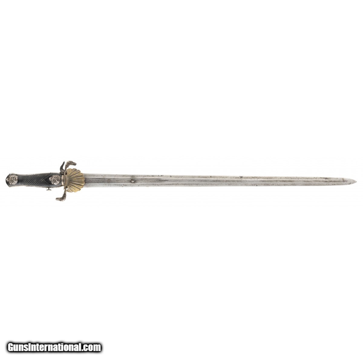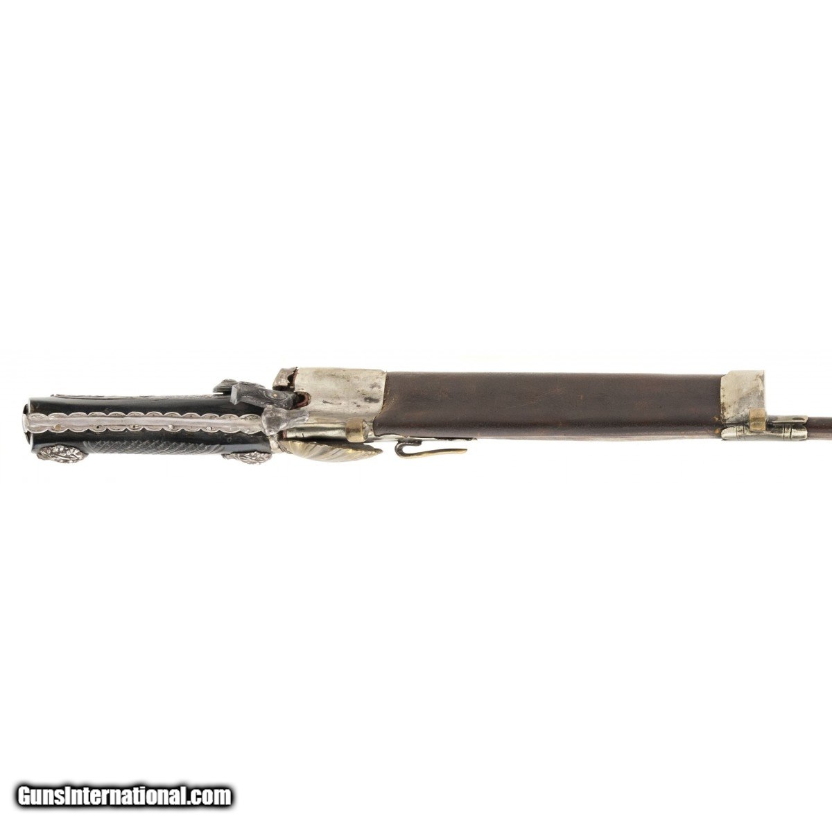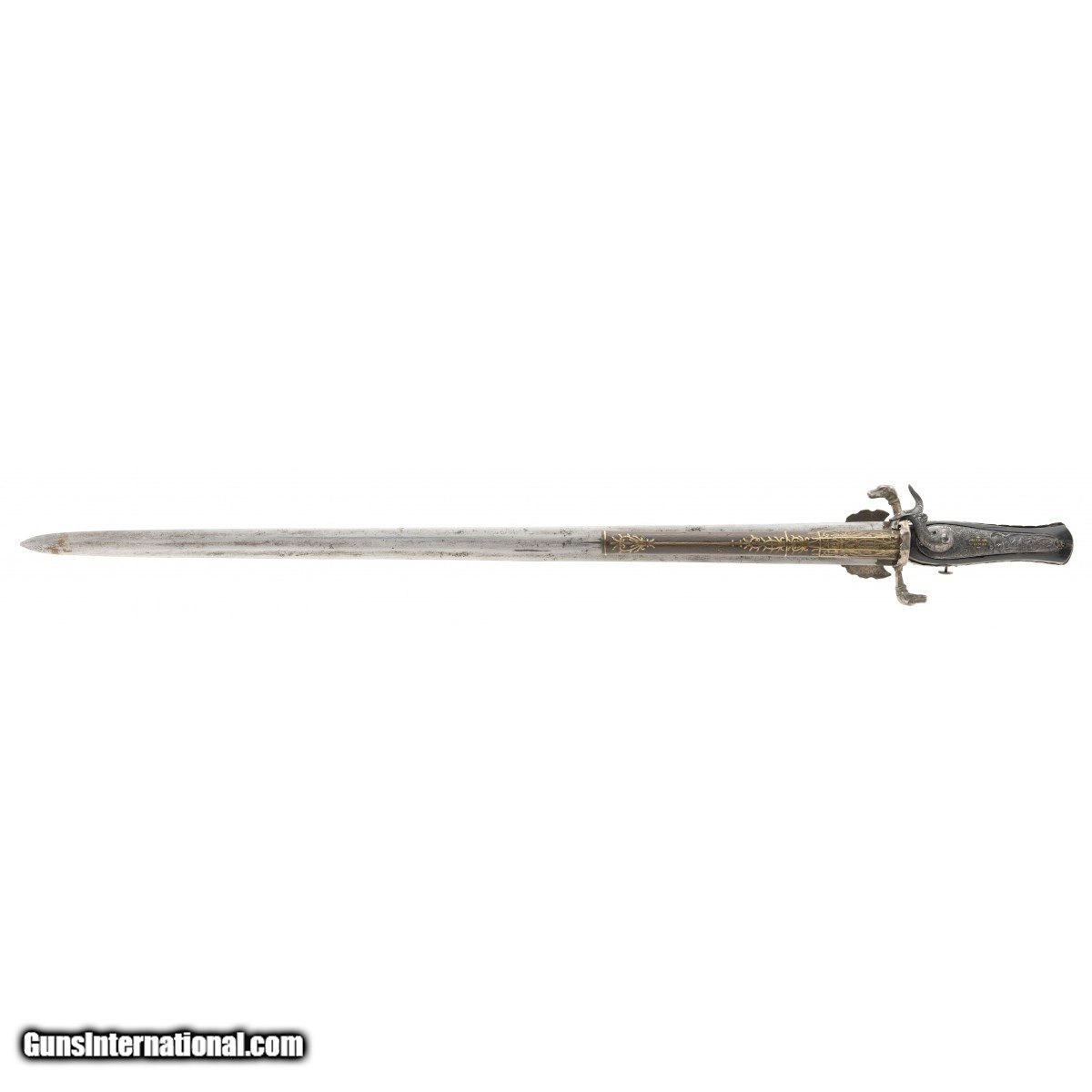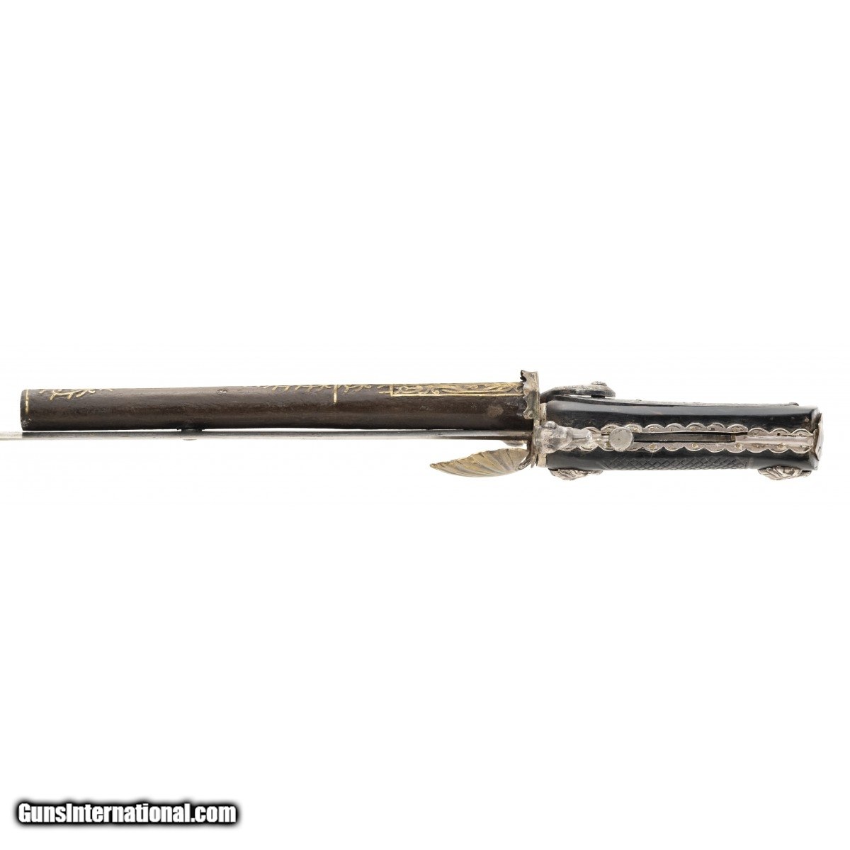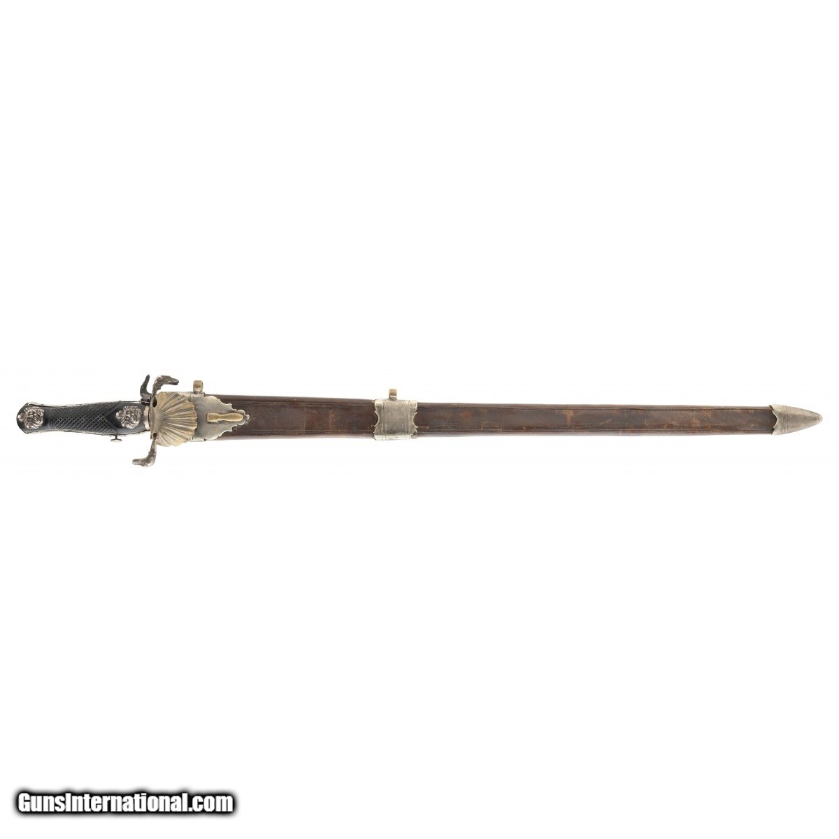 Description: "Blade has a 28" blade and is 33 ½" overall length. This Pistol sword is made of old components puts together not in the period. It comes with a very well made leather scabbard. SOLD |