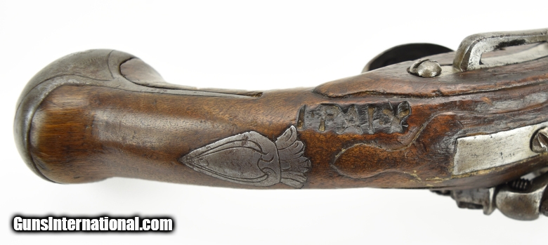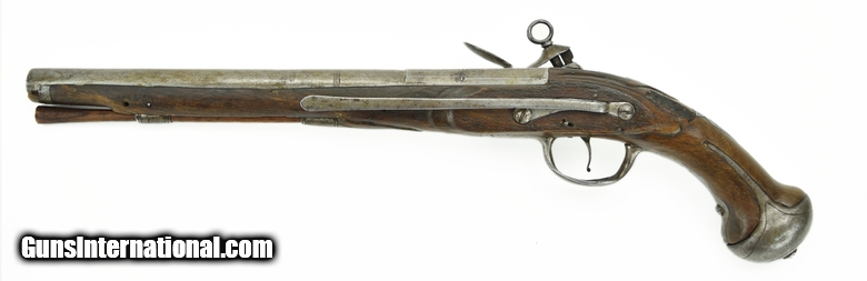 Description: Spanish Miguelet Cavalry Pistol. Circa 1690-1700. Barrel is 13.5” long. 17mm caliber. Stamped SALA (active 1690-1750), a Catalan maker, ramrod a correct reproduction. The lock is an iron pan, stamped LDIAM. A pair can be found in Bayerisches Armeemuseum. 4 are in Esterhazy in Burland, Austria probably left by Catalan troops aiding in the Hapsburg. SOLD Antique: Yes |