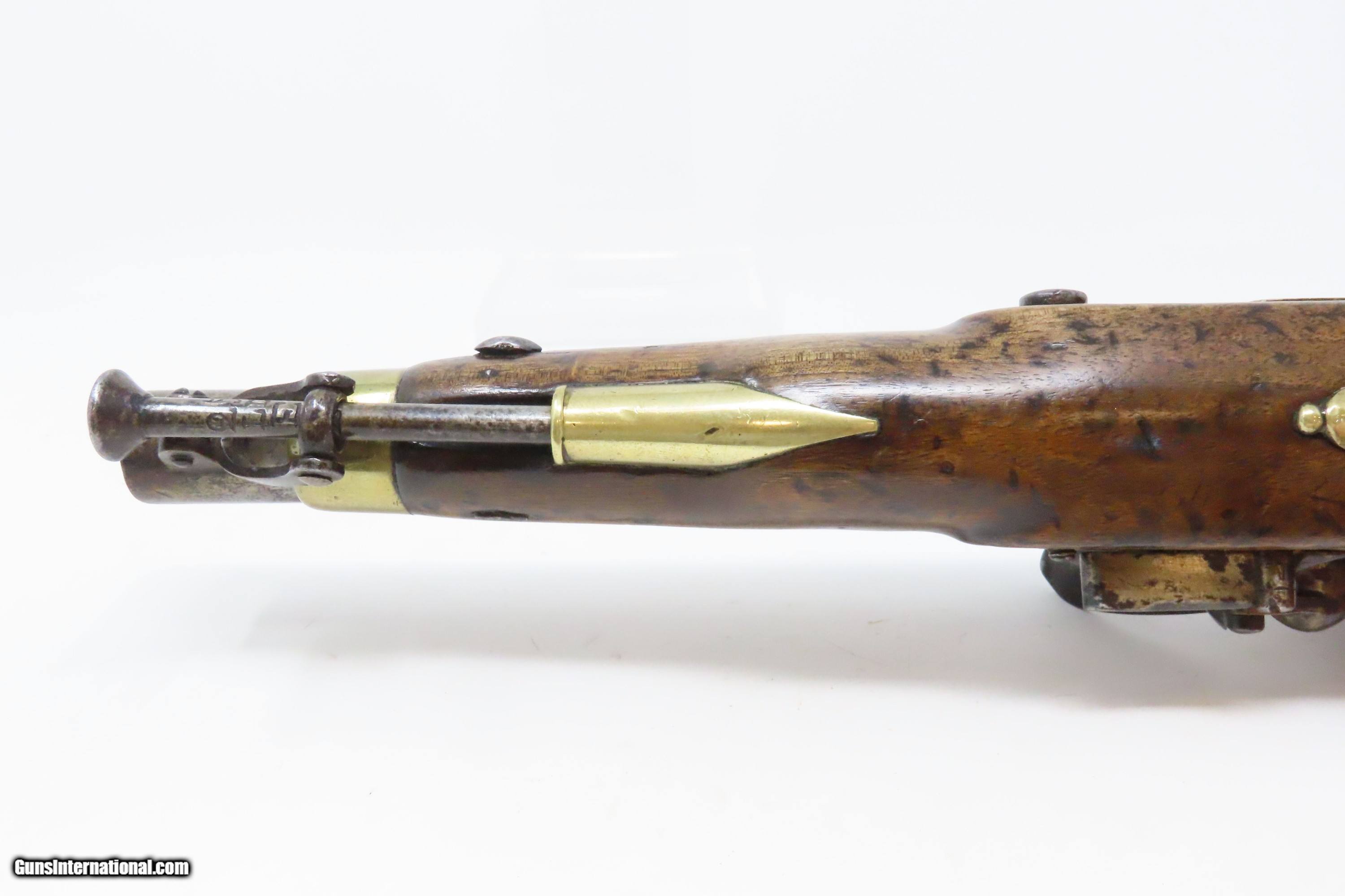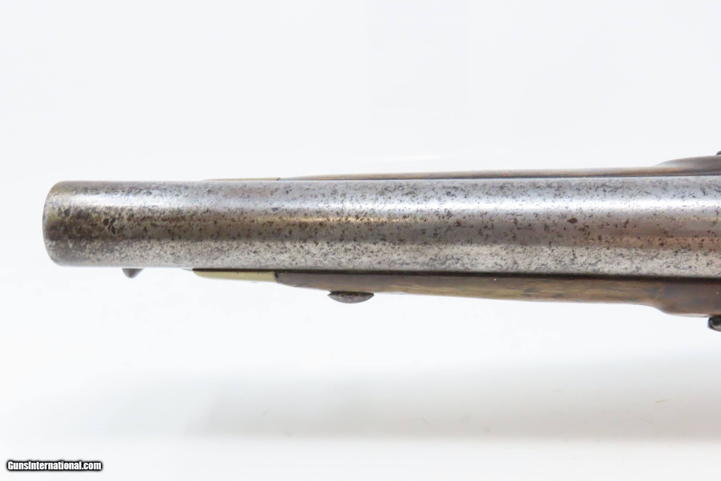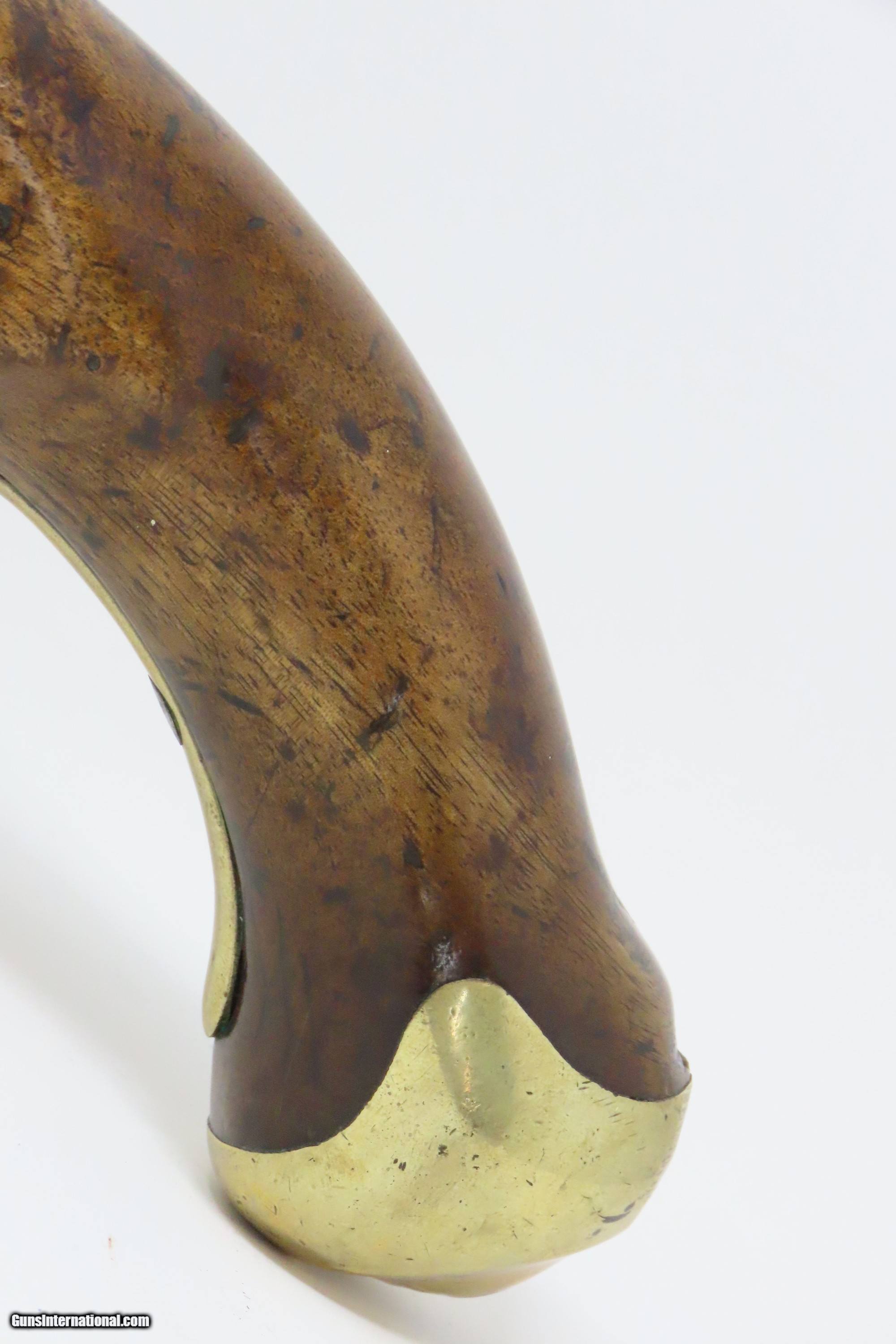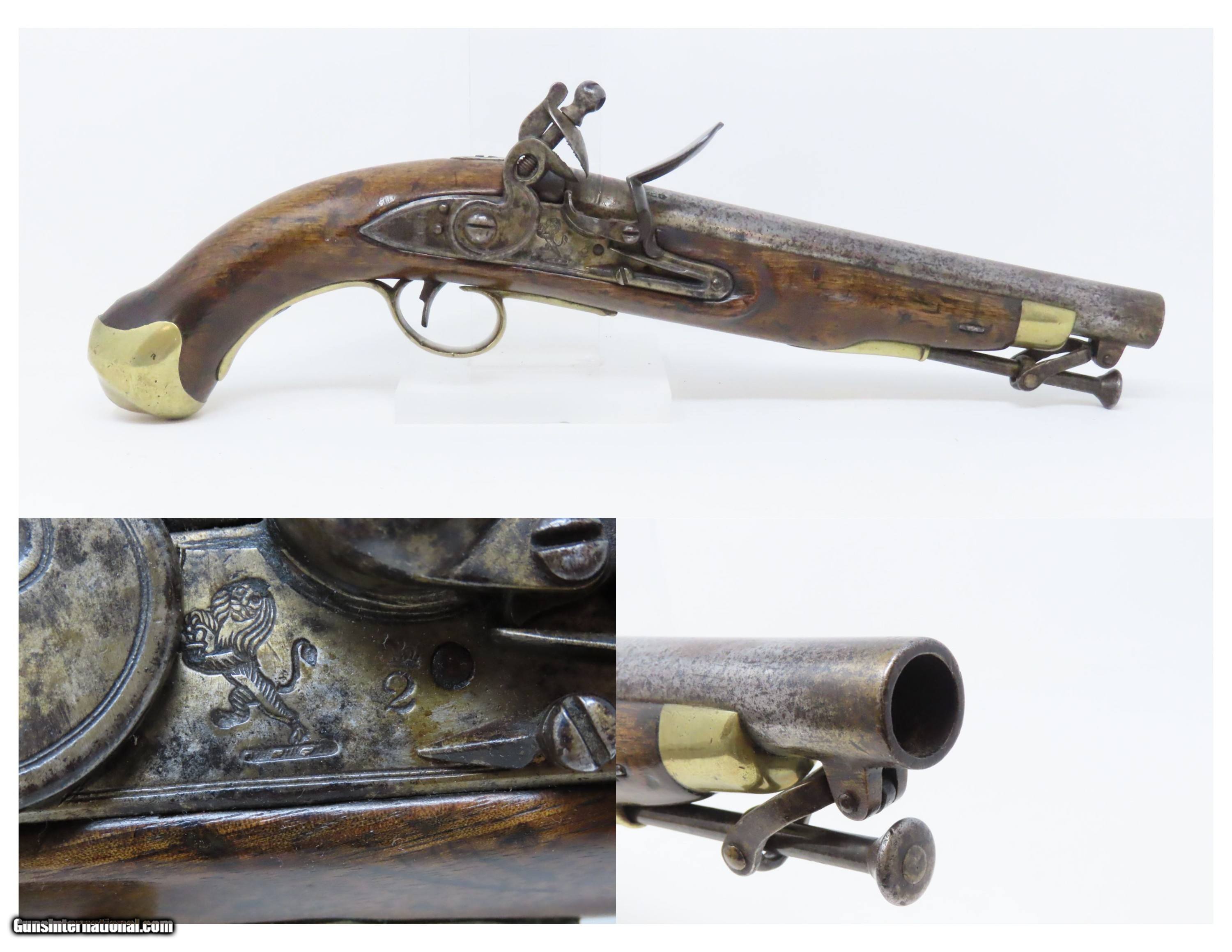 Description: 1812 Dated EAST INDIA COMPANY Unit Marked NEW LAND Pattern FLINTLOCK Pistol UNIT MARKED With RAMPANT LION Logo Here we present an antique 1812 Dated East India Company Unit Marked New Land Pattern British Cavalry Flintlock Pistol, made circa 1812 in London, England. Introduced in 1796 and in widespread production by 1802, the New Land Cavalry Pistol provided one model of pistol for all of Britain's cavalry units such as the Royal Horse Artillery. Initially it started out with a rounded brass butt, as is the example, but this soon gave way to a flat butt with a lanyard ring. The ring on the later pistols allowed the pistol to be attached to the cavalryman's equipment and not be lost in the heat of battle. The famous East India Company made many of these for British Cavalry serving in India, who in turn brought them into service elsewhere in the world. The 1812 dated lock is marked with the rampant lion symbol of the East India Company at the center. It is unit marked with “25/LD/E/23” on both the bottom of the trigger guard and the ramrod, indicating the pistol was issued to “E” Company of the 25th Light Dragoons (1804-1819), who spent most of their existence deployed in India. The second page of the article gives quite a nice succinct history of the unit. Overall condition is fair to good. Original patina. The action moves under spring tension and will hold half-cock but not the full-cock notch. The bore is smooth and dim. The stock shows lots of wear and remains solid. Own the original! This is a legitimate antique and not a reproduction. Barrel is 9 inches. Caliber: .65 Flintlock Overall condition as seen in photos. Very Fast. Very Safe. FREE SHIPPING WORLDWIDE. Delivered directly to your door by express mail! Guaranteed AUTHENTIC & Includes CERTIFICATE OF AUTHENTICITY. ancestryguns $1650 #227596 SOLD Antique: Yes |