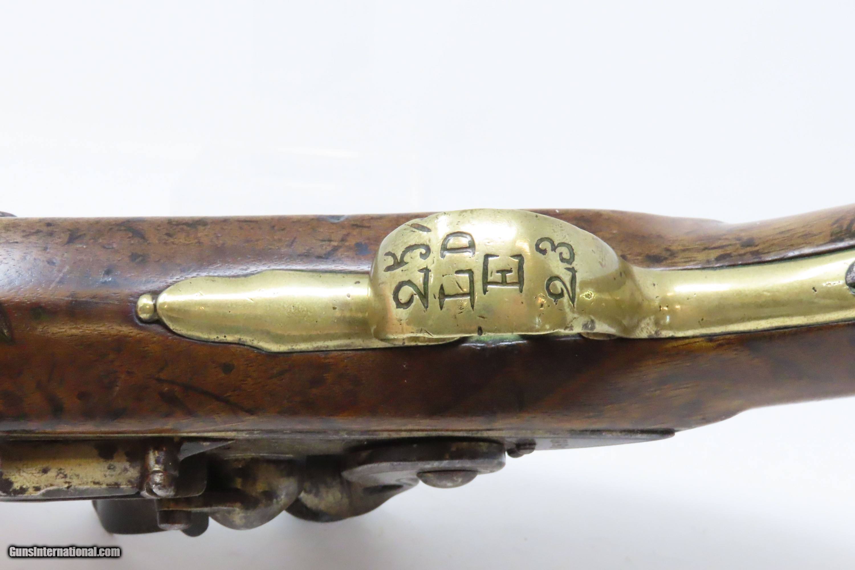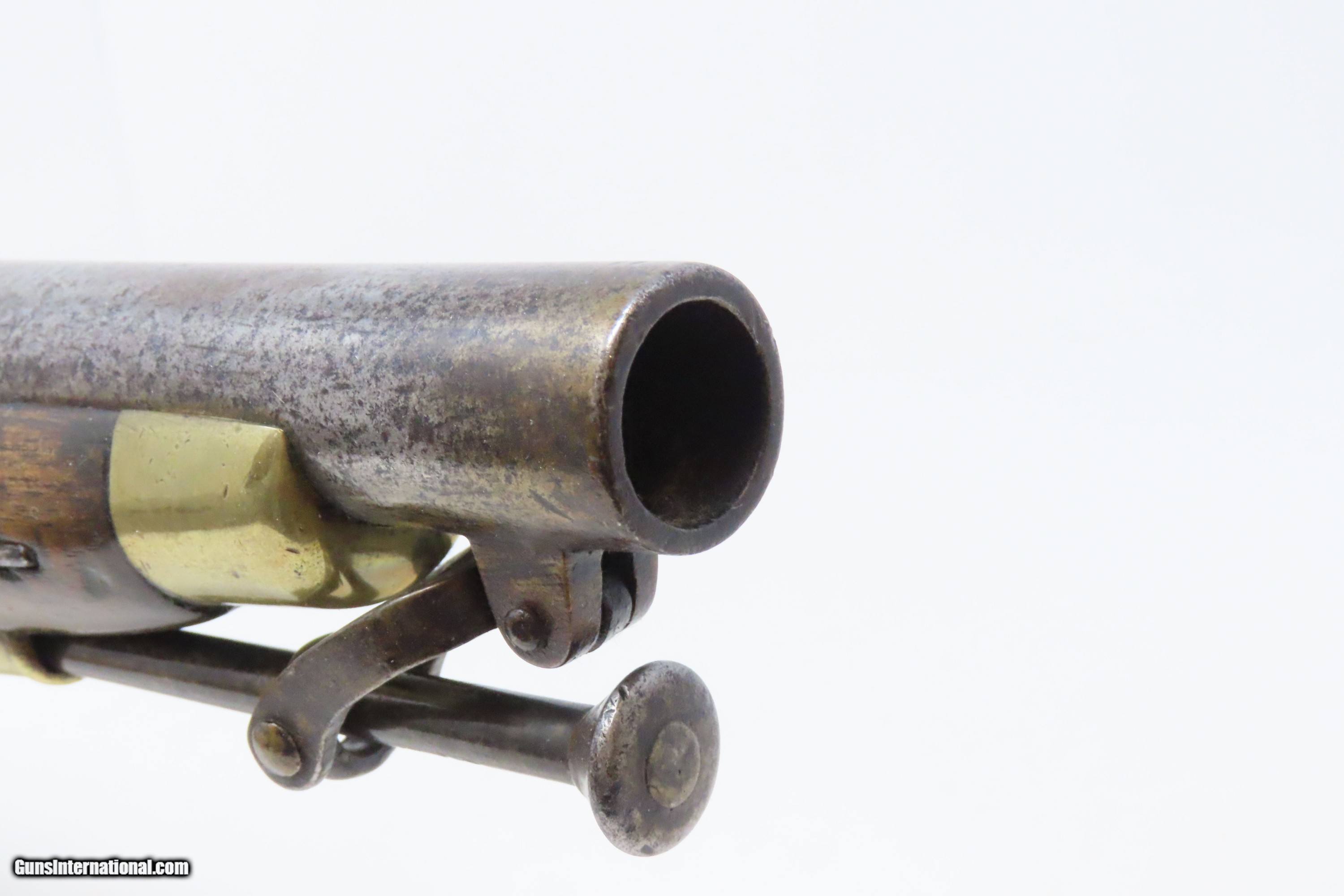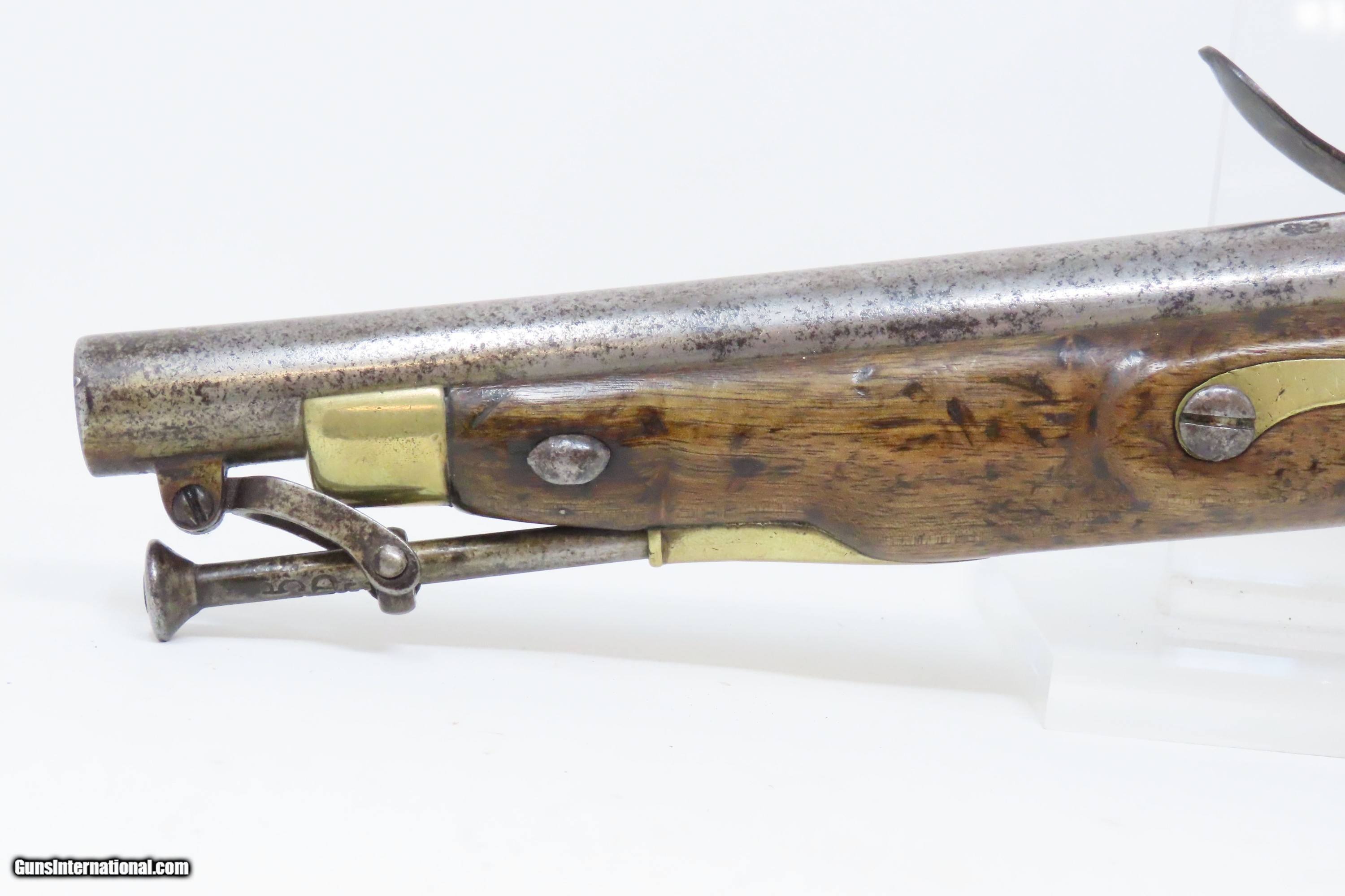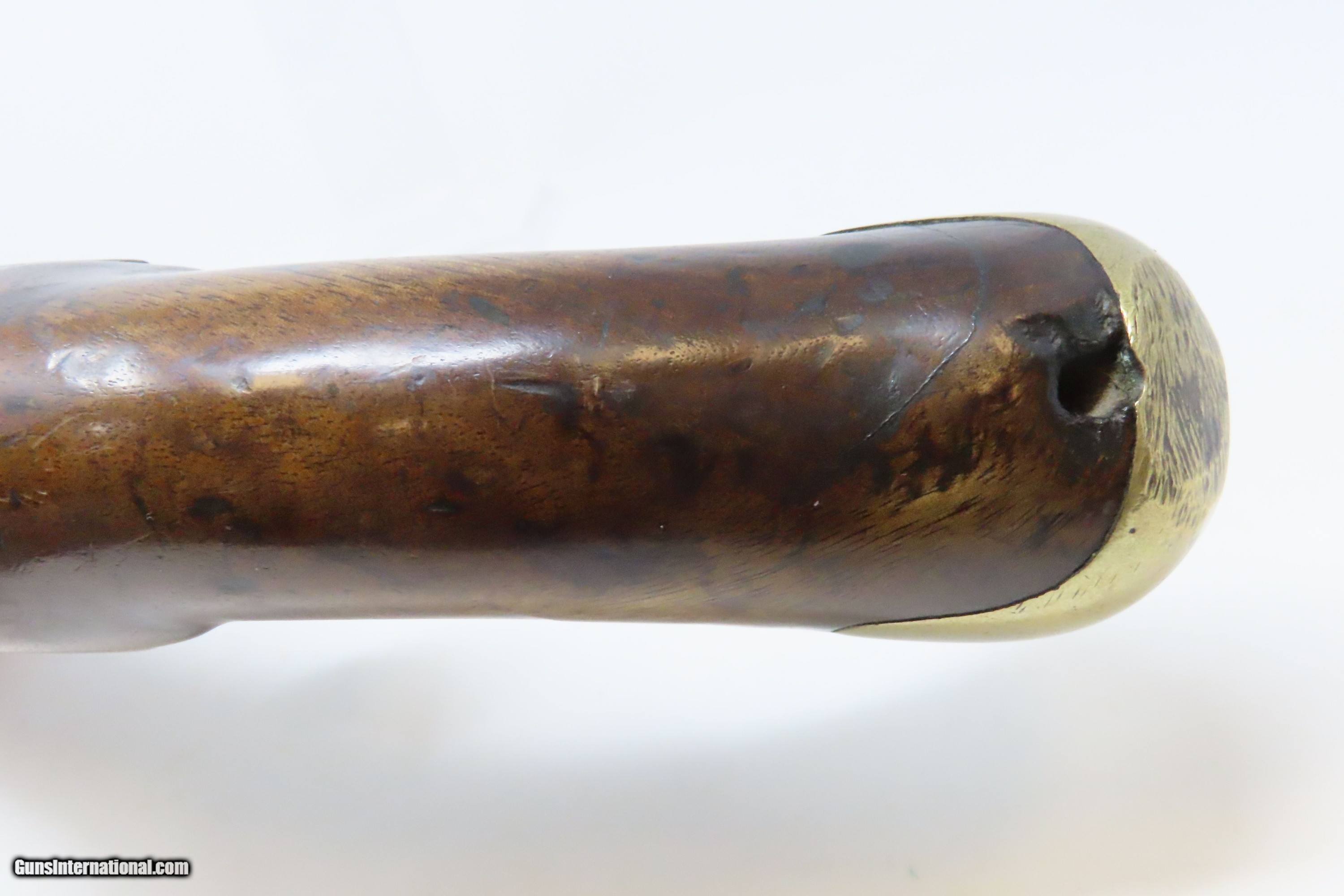 Description: 1812 Dated EAST INDIA COMPANY Unit Marked NEW LAND Pattern FLINTLOCK Pistol UNIT MARKED With RAMPANT LION Logo Here we present an antique 1812 Dated East India Company Unit Marked New Land Pattern British Cavalry Flintlock Pistol, made circa 1812 in London, England. Introduced in 1796 and in widespread production by 1802, the New Land Cavalry Pistol provided one model of pistol for all of Britain's cavalry units such as the Royal Horse Artillery. Initially it started out with a rounded brass butt, as is the example, but this soon gave way to a flat butt with a lanyard ring. The ring on the later pistols allowed the pistol to be attached to the cavalryman's equipment and not be lost in the heat of battle. The famous East India Company made many of these for British Cavalry serving in India, who in turn brought them into service elsewhere in the world. The 1812 dated lock is marked with the rampant lion symbol of the East India Company at the center. It is unit marked with “25/LD/E/23” on both the bottom of the trigger guard and the ramrod, indicating the pistol was issued to “E” Company of the 25th Light Dragoons (1804-1819), who spent most of their existence deployed in India. The second page of the article gives quite a nice succinct history of the unit. Overall condition is fair to good. Original patina. The action moves under spring tension and will hold half-cock but not the full-cock notch. The bore is smooth and dim. The stock shows lots of wear and remains solid. Own the original! This is a legitimate antique and not a reproduction. Barrel is 9 inches. Caliber: .65 Flintlock Overall condition as seen in photos. Very Fast. Very Safe. FREE SHIPPING WORLDWIDE. Delivered directly to your door by express mail! Guaranteed AUTHENTIC & Includes CERTIFICATE OF AUTHENTICITY. ancestryguns $1650 #227596 SOLD Antique: Yes |