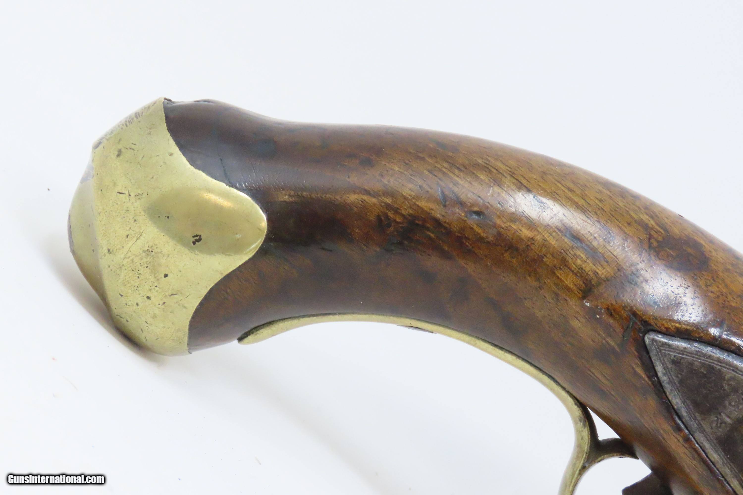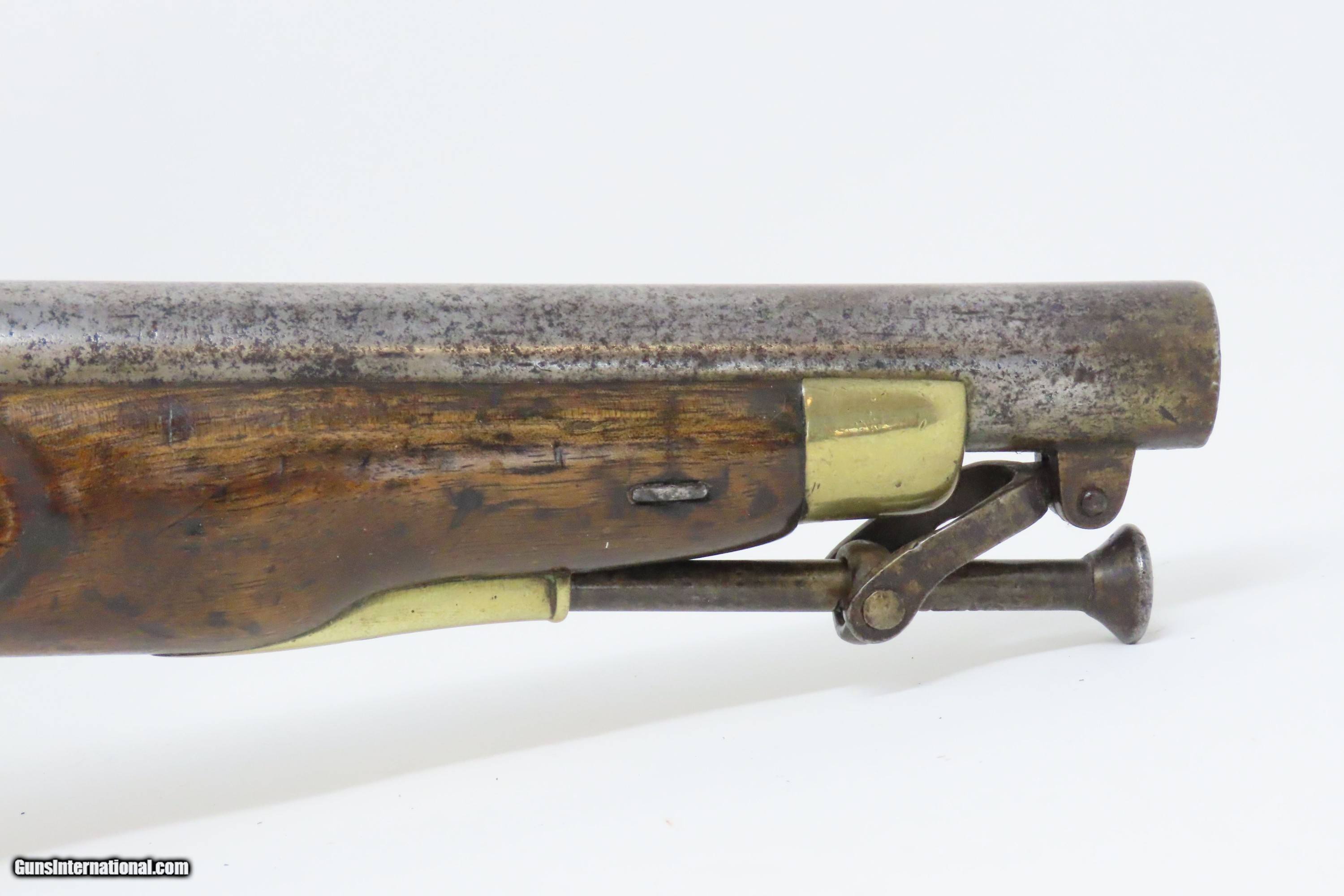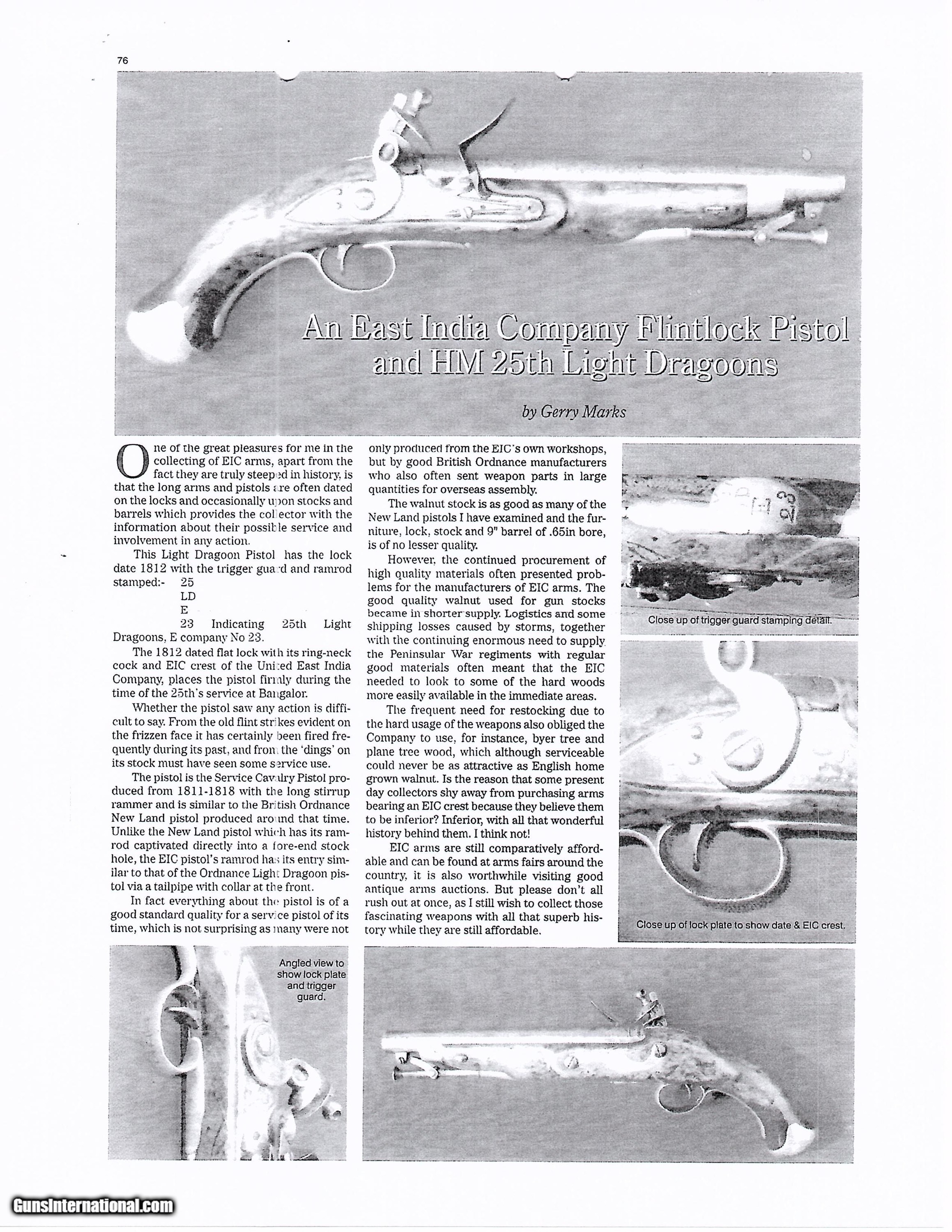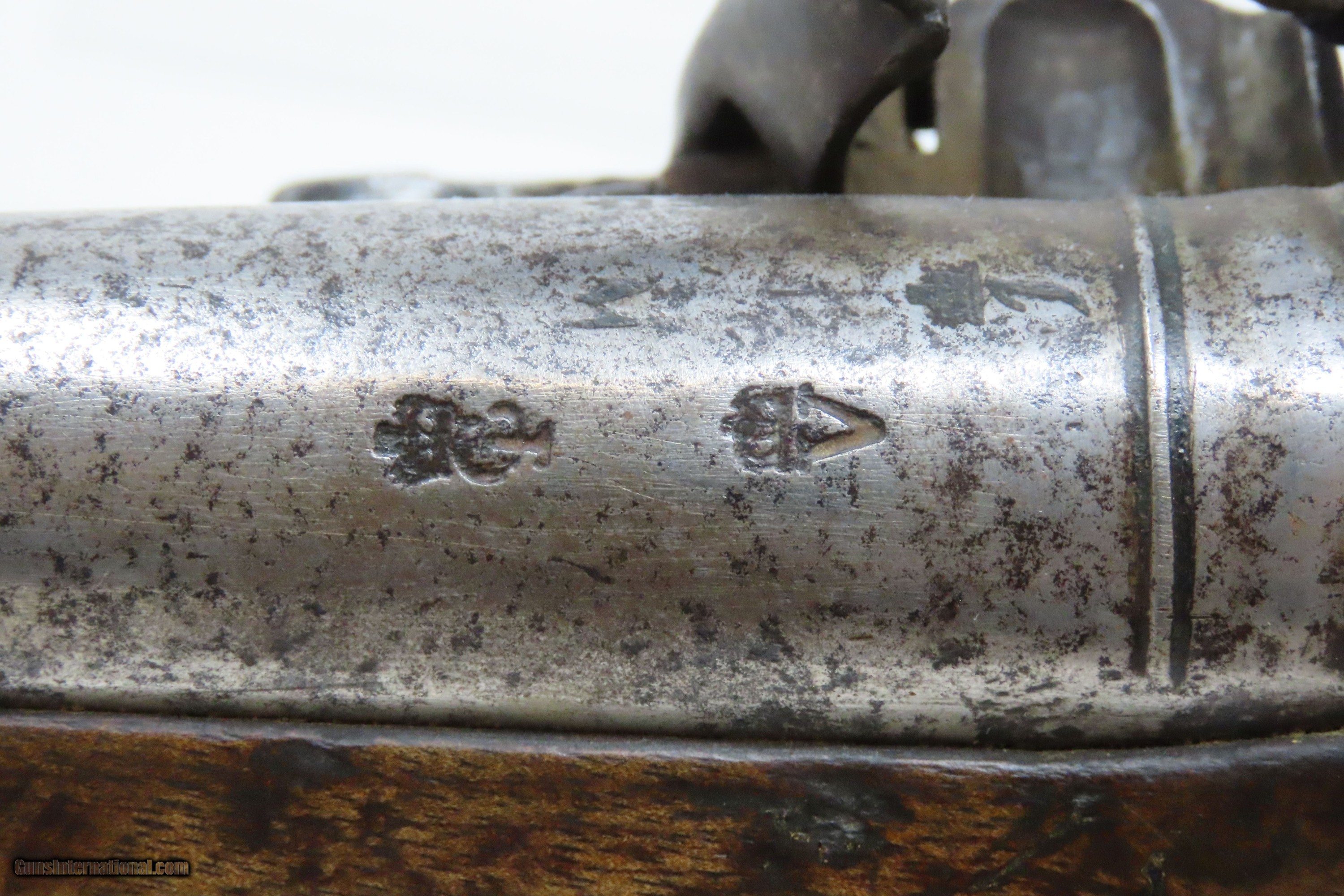 Description: 1812 Dated EAST INDIA COMPANY Unit Marked NEW LAND Pattern FLINTLOCK Pistol UNIT MARKED With RAMPANT LION Logo Here we present an antique 1812 Dated East India Company Unit Marked New Land Pattern British Cavalry Flintlock Pistol, made circa 1812 in London, England. Introduced in 1796 and in widespread production by 1802, the New Land Cavalry Pistol provided one model of pistol for all of Britain's cavalry units such as the Royal Horse Artillery. Initially it started out with a rounded brass butt, as is the example, but this soon gave way to a flat butt with a lanyard ring. The ring on the later pistols allowed the pistol to be attached to the cavalryman's equipment and not be lost in the heat of battle. The famous East India Company made many of these for British Cavalry serving in India, who in turn brought them into service elsewhere in the world. The 1812 dated lock is marked with the rampant lion symbol of the East India Company at the center. It is unit marked with “25/LD/E/23” on both the bottom of the trigger guard and the ramrod, indicating the pistol was issued to “E” Company of the 25th Light Dragoons (1804-1819), who spent most of their existence deployed in India. The second page of the article gives quite a nice succinct history of the unit. Overall condition is fair to good. Original patina. The action moves under spring tension and will hold half-cock but not the full-cock notch. The bore is smooth and dim. The stock shows lots of wear and remains solid. Own the original! This is a legitimate antique and not a reproduction. Barrel is 9 inches. Caliber: .65 Flintlock Overall condition as seen in photos. Very Fast. Very Safe. FREE SHIPPING WORLDWIDE. Delivered directly to your door by express mail! Guaranteed AUTHENTIC & Includes CERTIFICATE OF AUTHENTICITY. ancestryguns $1650 #227596 SOLD Antique: Yes |