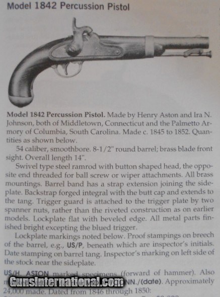 Description: A VERY NICE EXAMPLE OF A H. ASTON MODEL 1842 U.S. CONTRACT THESE WERE USED IN MEXICAN WAR AND EARLY CIVIL WAR, THIS .54 CALIBER PISTOL IS DATED 1849. CRISP FACTORY MARKINGS, VERY GOOD WALNUT STOCK, VISIABLE CARTOUCH OUTLINES. VERY GOOD SHOOTABLE BORE WITH STRONG ACTION AND 2 CLICK HAMMER. REAL SOLID U.S. CONTRACT MILITARY PISTOL, AS PICTURED $25.00 S&H DIRECT TO BUYER NO FFL NEEDED ANYWHERE THAT'S OK. HIGHER OFFERS CONSIDERED ! SOLD Antique: Yes Handgun Caliber: .54 Manufacturer: HENRY ASTON Model: 1842 Barrel Length: 8.5 Bore: CLEAR Condition: VERY GOOD PLUS Metal Condition: GUNMETALPATINA Wood Condition: VERY GOOD Bore Condition: VERY GOOD Barrels: 8.5 Barrel Type: ROUND Action: CRISP & STRONG Stock: WALNUT Finish: BROWNISH PATINA Sights: ORIGINAL Manufacture Date: 1849 |