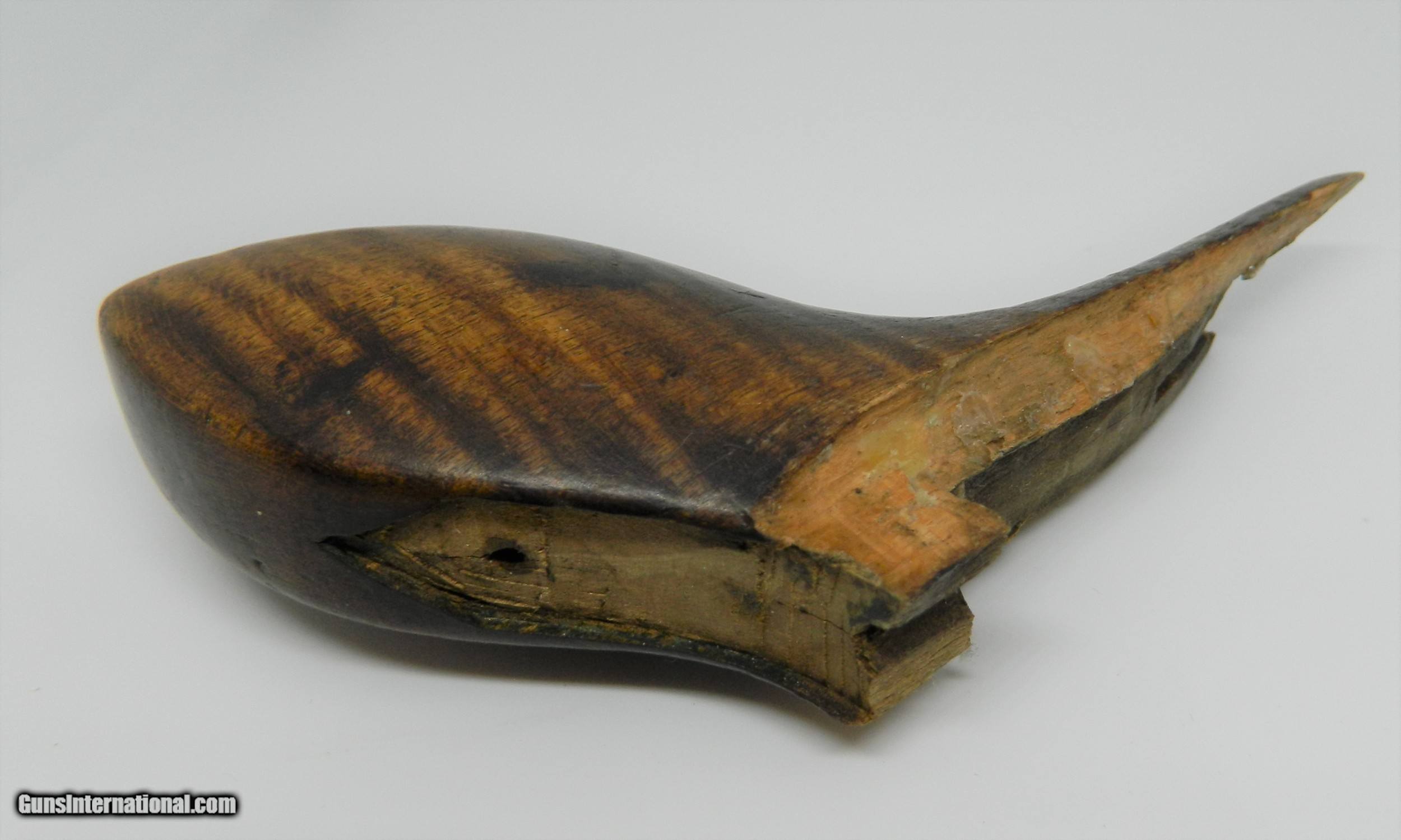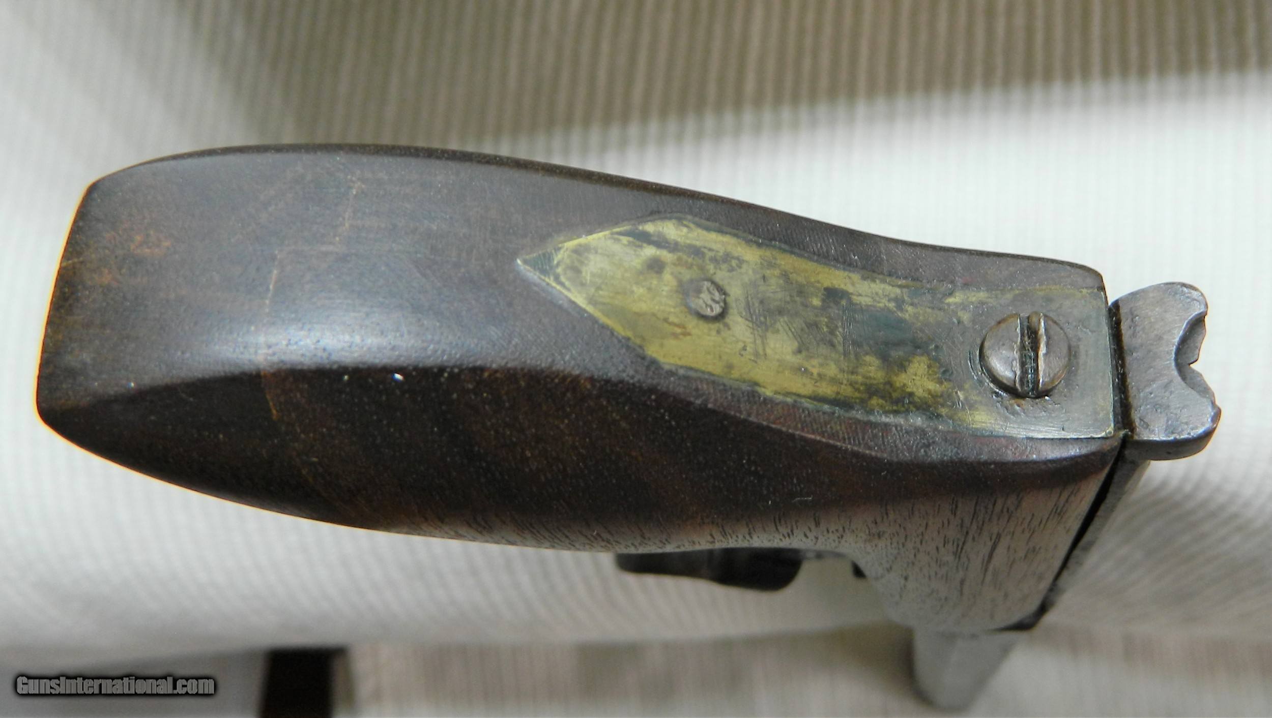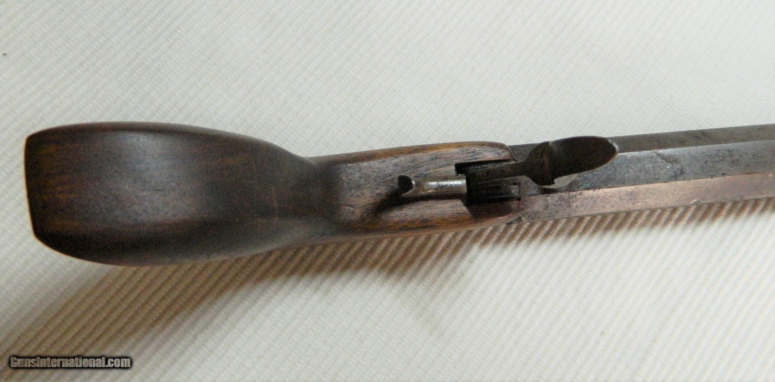 Description: I found this Gun in the wall of an 1800's building in the Gold Rush area of Northern California. I have seen pictures of men carring this type of wepon in their high top boots while panning gold in a stream. It would have the added benifit of being used as a club as the 9" hex barrel weighs nearly 2lbs.The caliber is something around .30. and it has front and rear sights. The hammer and trigger function, can't see in the bore. When I found the gun the original ( looks like Tiger Maple) stock/grip was broken and I made a replacement out of Walnut, the original goes with the gun. This is a very interesting old gun that some gold seeking immigrant brought with him to California for protection in the great 1849 Gold Rush. ALTHOUGH i MAY SAY THAT THE ANTIQUE GUNS I SELL ARE FULLY FUNCTIONAL, I WOULD NEVER RECOMMEND TRYING TO SHOOT ANY ANTIQUE FIREARM!!!! SOLD Antique: Yes Manufacturer: unknown Model: unknown Serial Number: unknown Barrel Length: 9 |