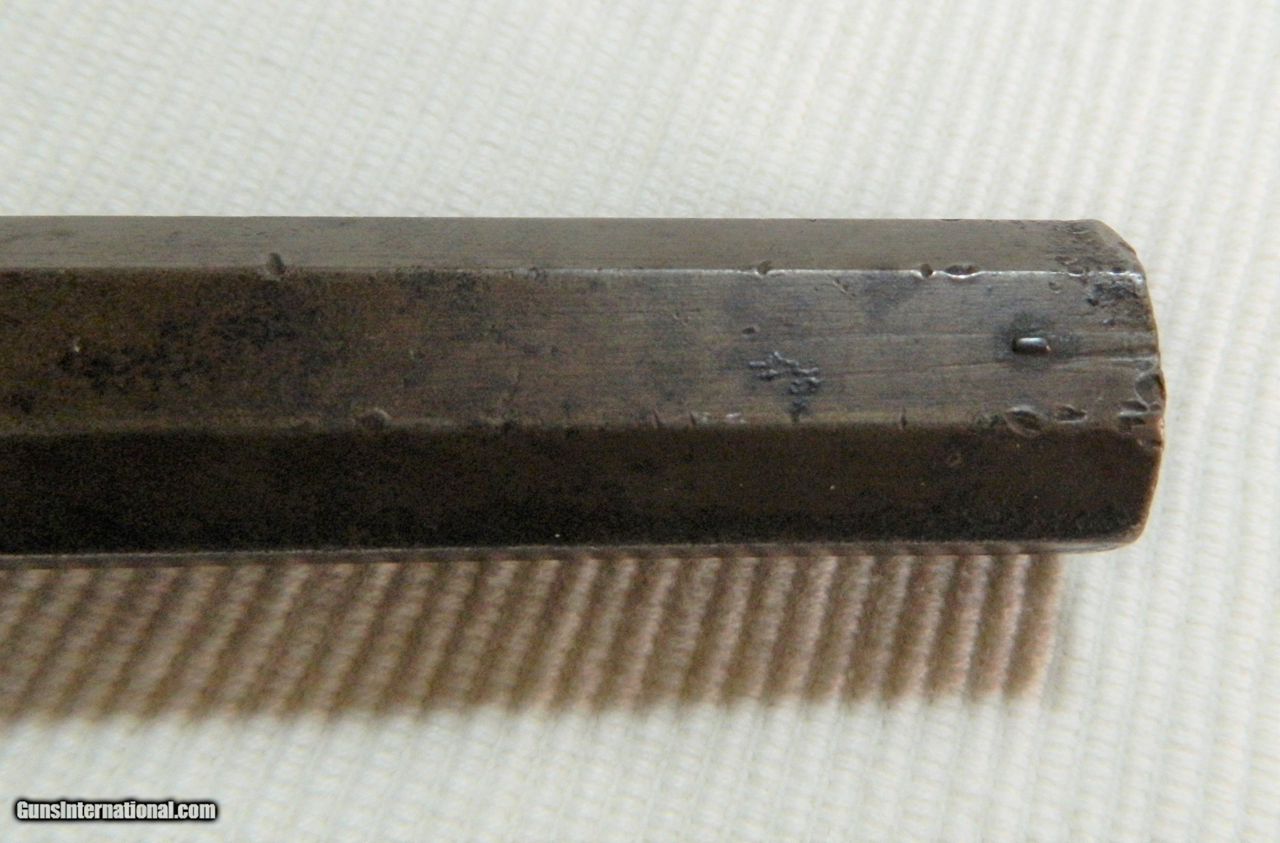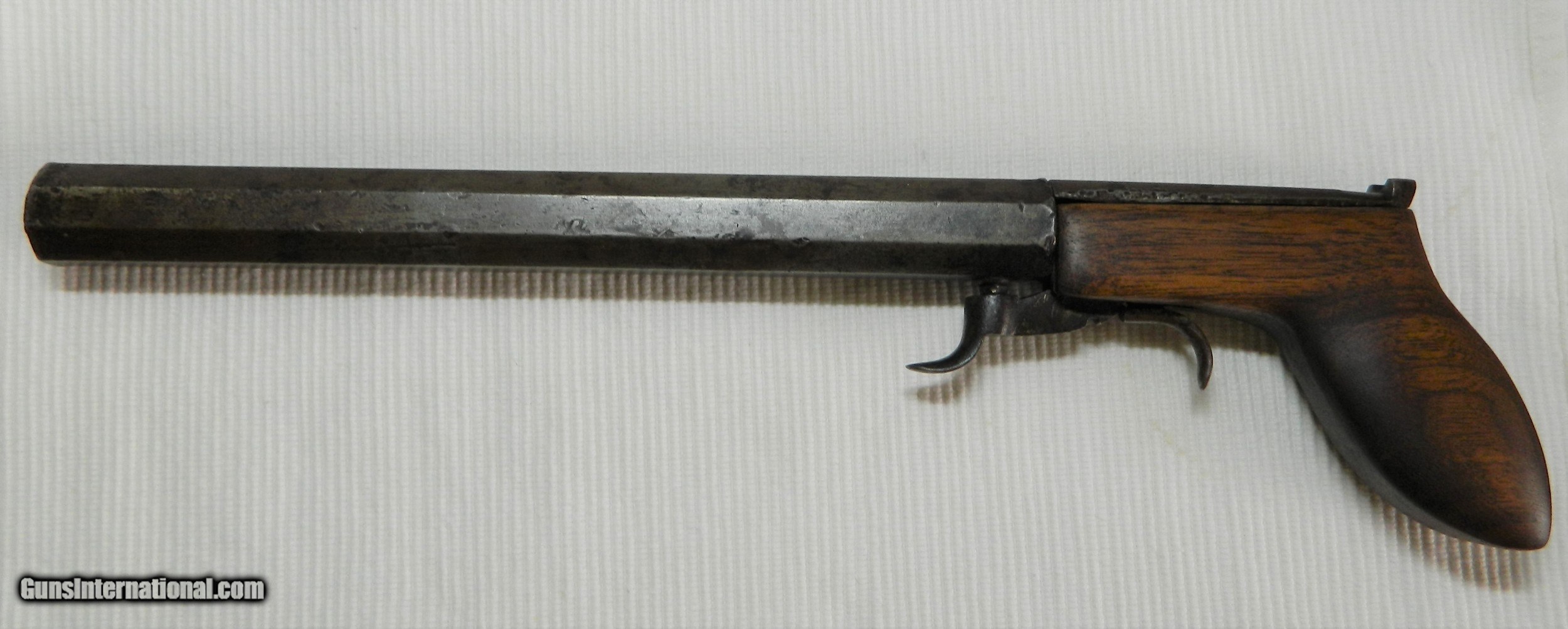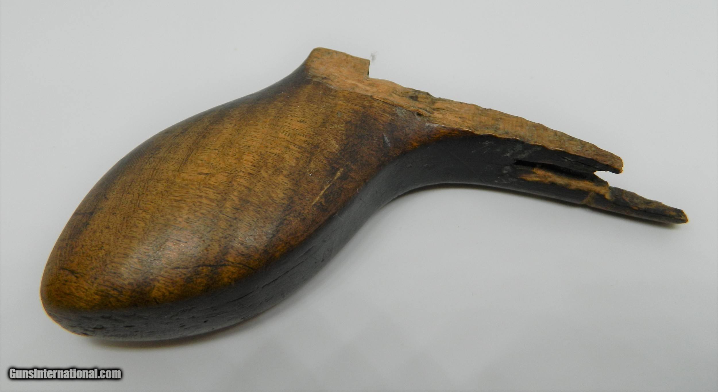 Description: I found this Gun in the wall of an 1800's building in the Gold Rush area of Northern California. I have seen pictures of men carring this type of wepon in their high top boots while panning gold in a stream. It would have the added benifit of being used as a club as the 9" hex barrel weighs nearly 2lbs.The caliber is something around .30. and it has front and rear sights. The hammer and trigger function, can't see in the bore. When I found the gun the original ( looks like Tiger Maple) stock/grip was broken and I made a replacement out of Walnut, the original goes with the gun. This is a very interesting old gun that some gold seeking immigrant brought with him to California for protection in the great 1849 Gold Rush. ALTHOUGH i MAY SAY THAT THE ANTIQUE GUNS I SELL ARE FULLY FUNCTIONAL, I WOULD NEVER RECOMMEND TRYING TO SHOOT ANY ANTIQUE FIREARM!!!! SOLD Antique: Yes Manufacturer: unknown Model: unknown Serial Number: unknown Barrel Length: 9 |