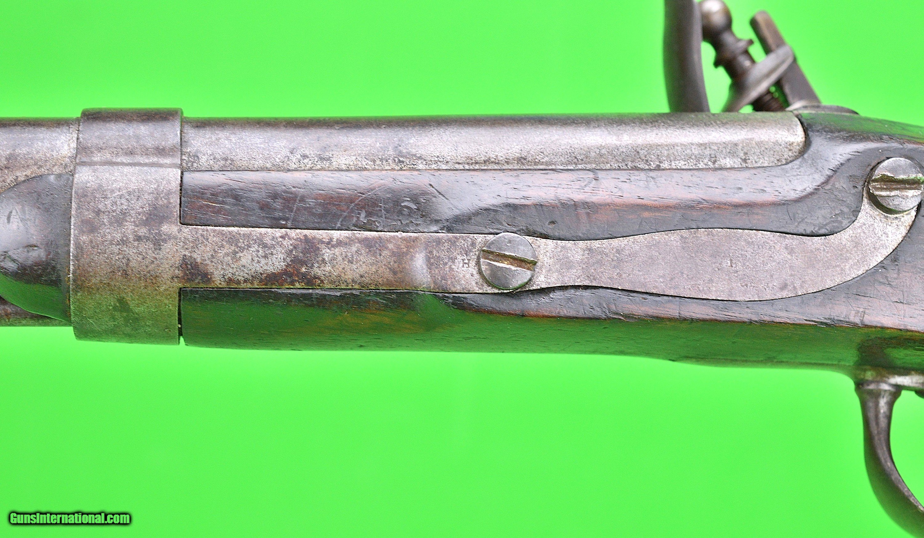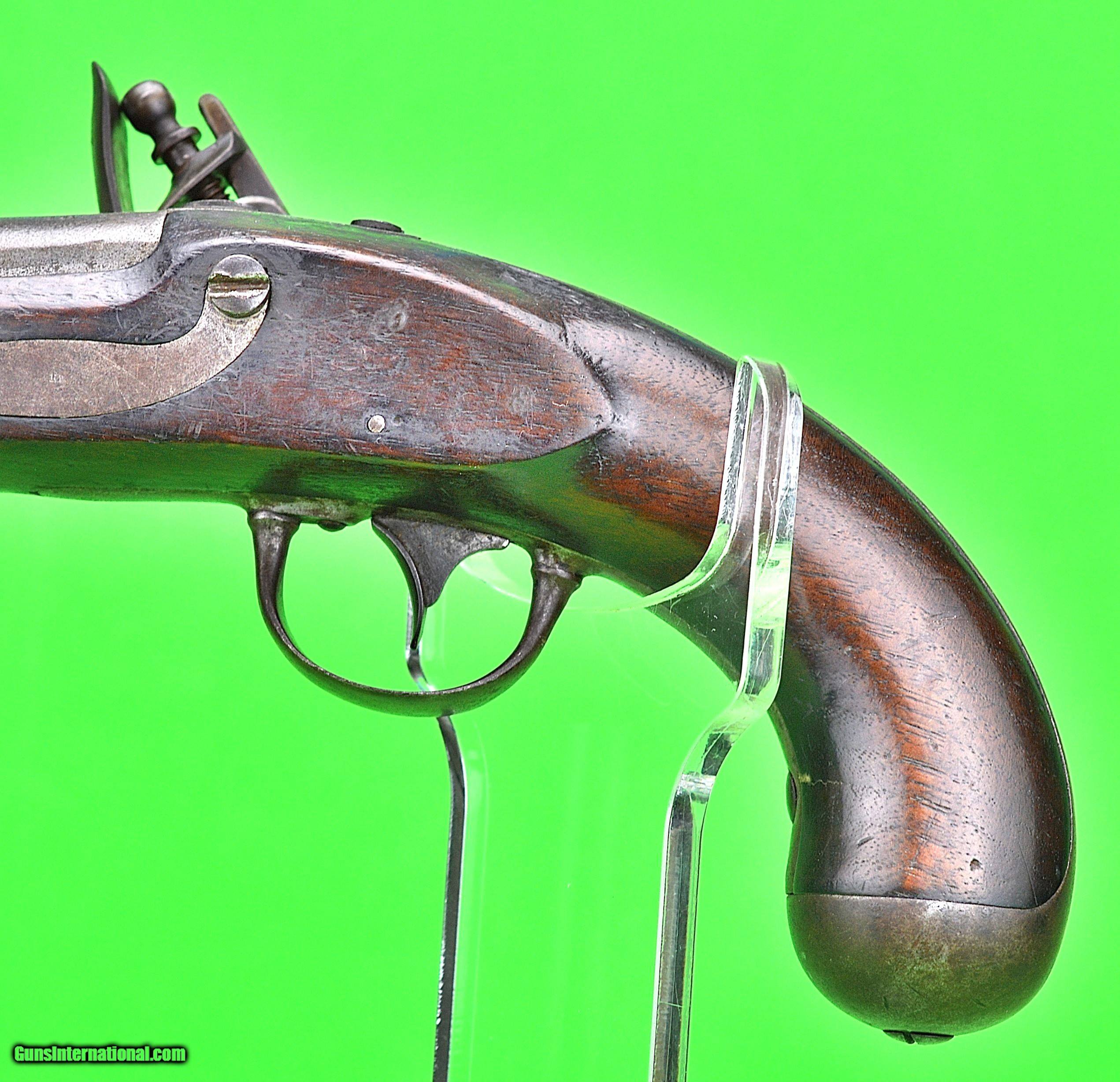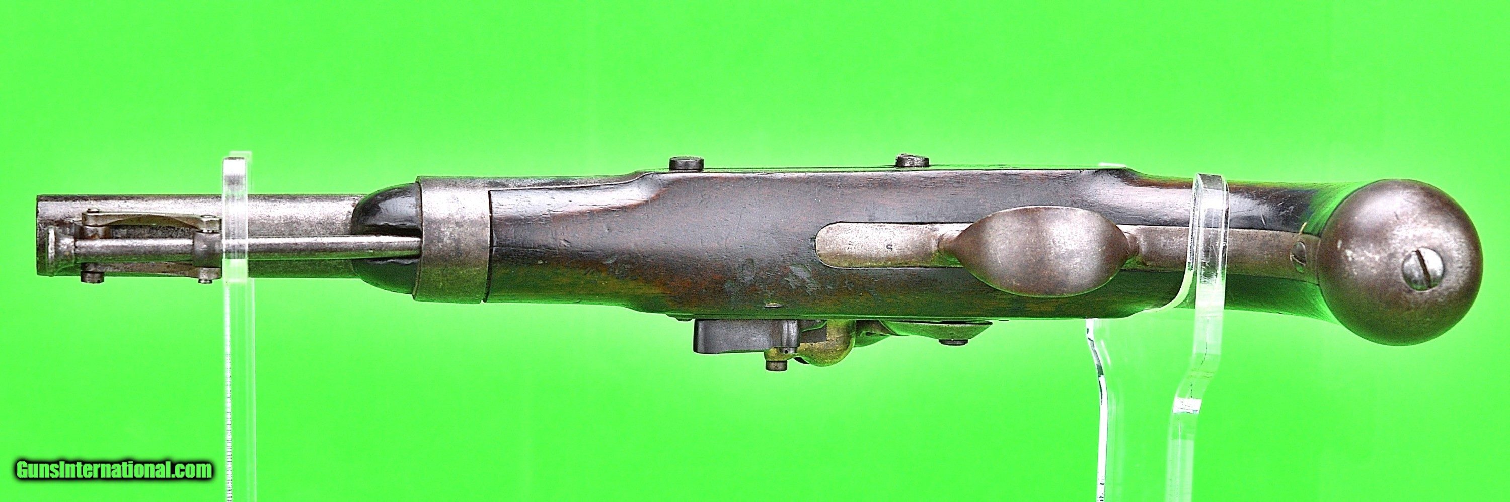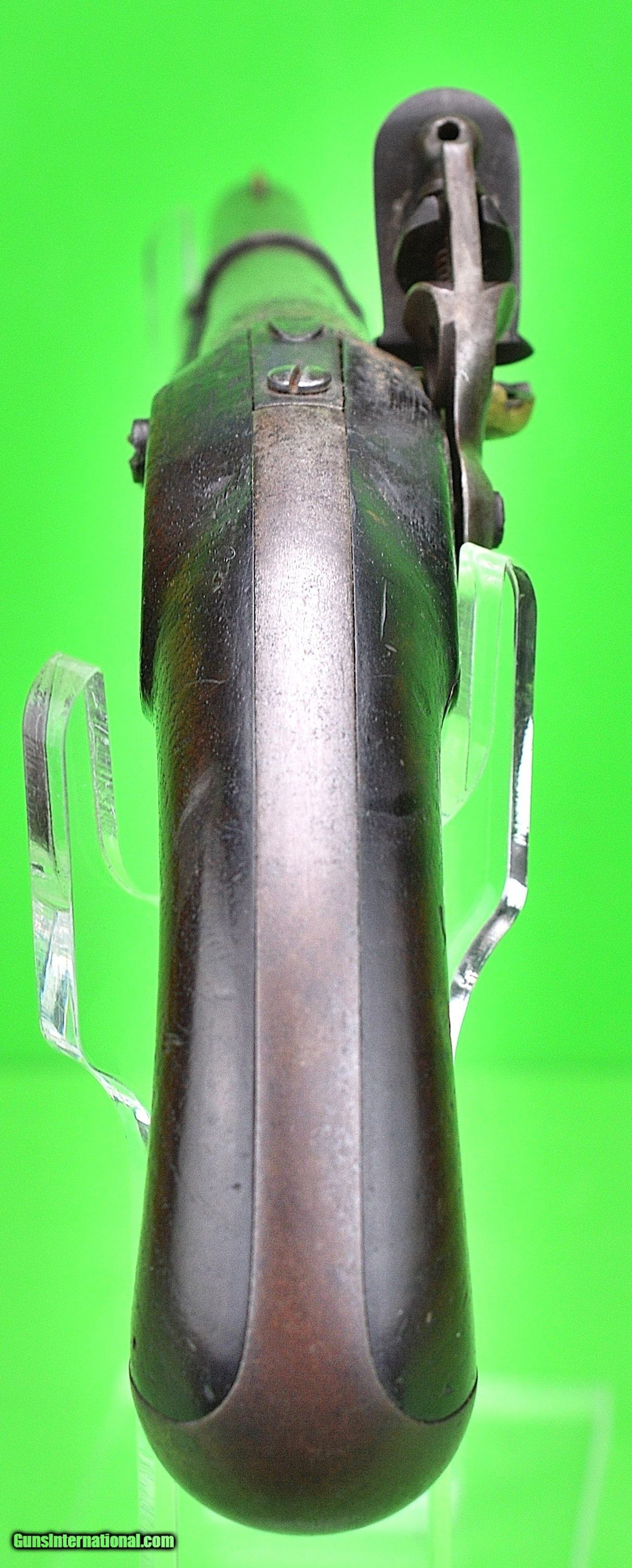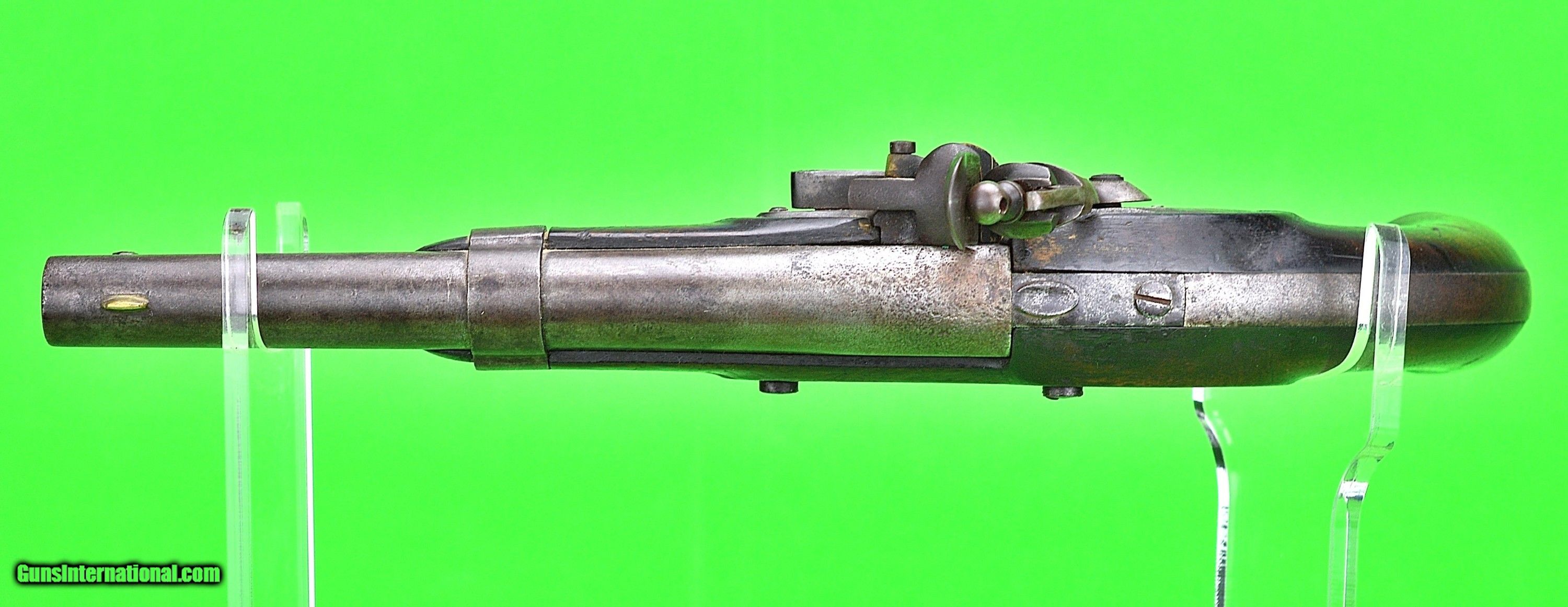 Description: A.H. Waters Model 1836 .54 caliber Flintlock pistol manufactured in 1844. Our research tells us only 3,000 of this variant were produced. A total of 41,000 Waters Model 1836 flintlock pistols were made, many of which were converted to percussion. They were used in the Mexican American and the American Civil War. This 1844 example is marked on the lock with an “EAGLE head/A.H. Waters & Co./Milbury MASS/1844. The inspector James Harris initials are found on the barrel and side plate. The condition is good-very good remaining in the original Flintlock configuration. The metal parts have turned to a grayish brown patina. Markings are clear. There is some pitting on the barrel mostly at the breech area around the pan. Action is tight. Bore is fair, The stock has numbers dints and dings and signs of use. There are hairline cracks ahead of and behind the lock. The right stock grip shows the initials “D S”, likely one of the early owners. Overall, this is a very acceptable example of the reasonably rare 175 year old plus pistol. Please see the photos. $1500.00 SOLD Antique: Yes Manufacturer: A.H. Waters Model: Flintlock Pistol Bore: .54 Condition: Good/Very Good Metal Condition: Good/Very Good Wood Condition: Good/Very Good Bore Condition: Fair Barrel Type: Smooth Action: Flintlock |