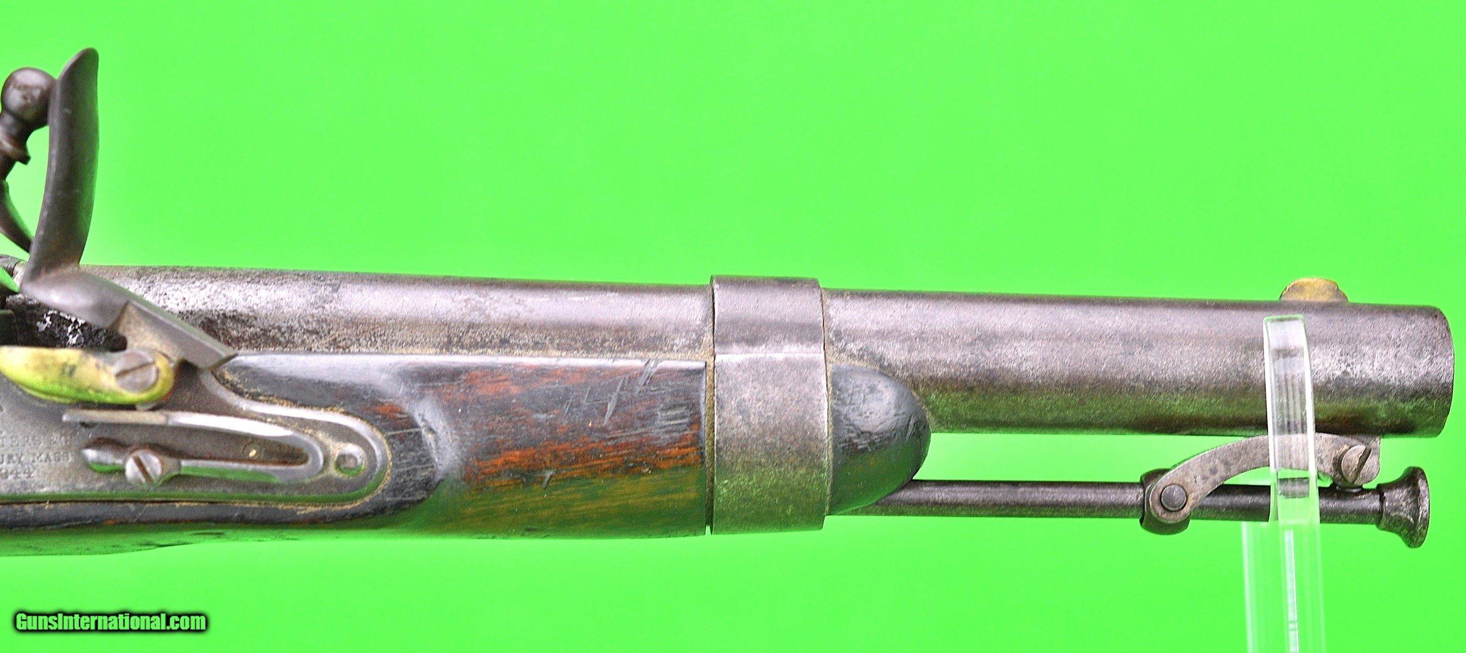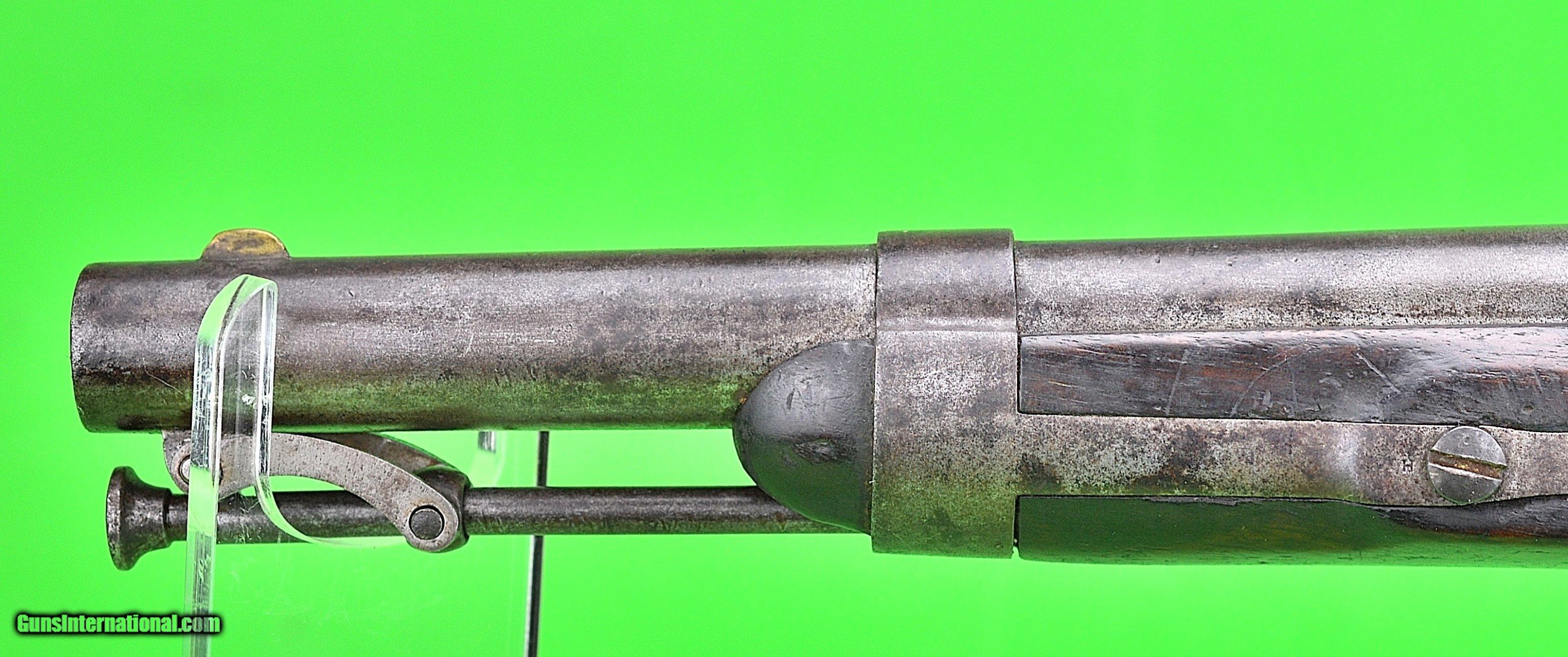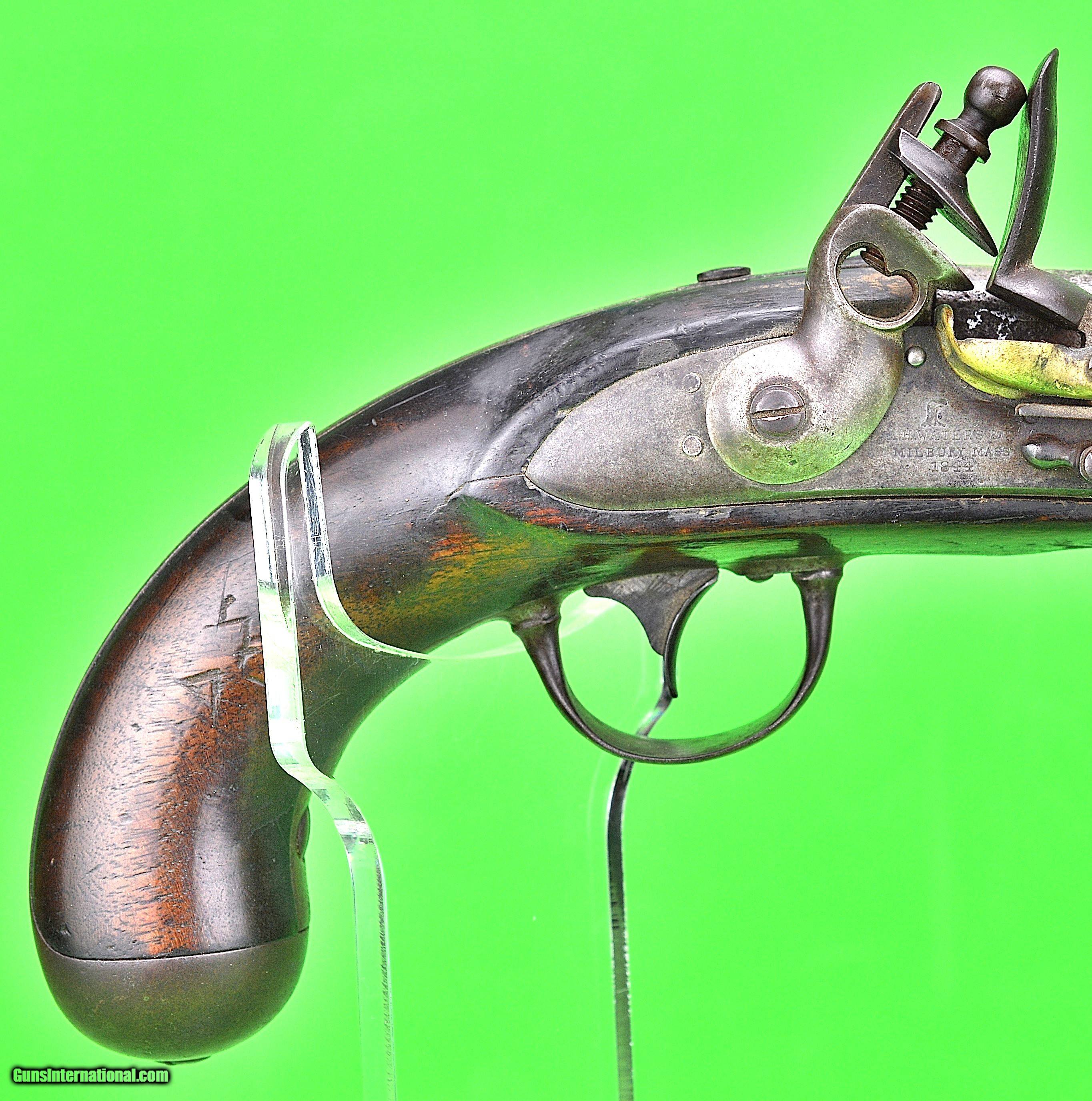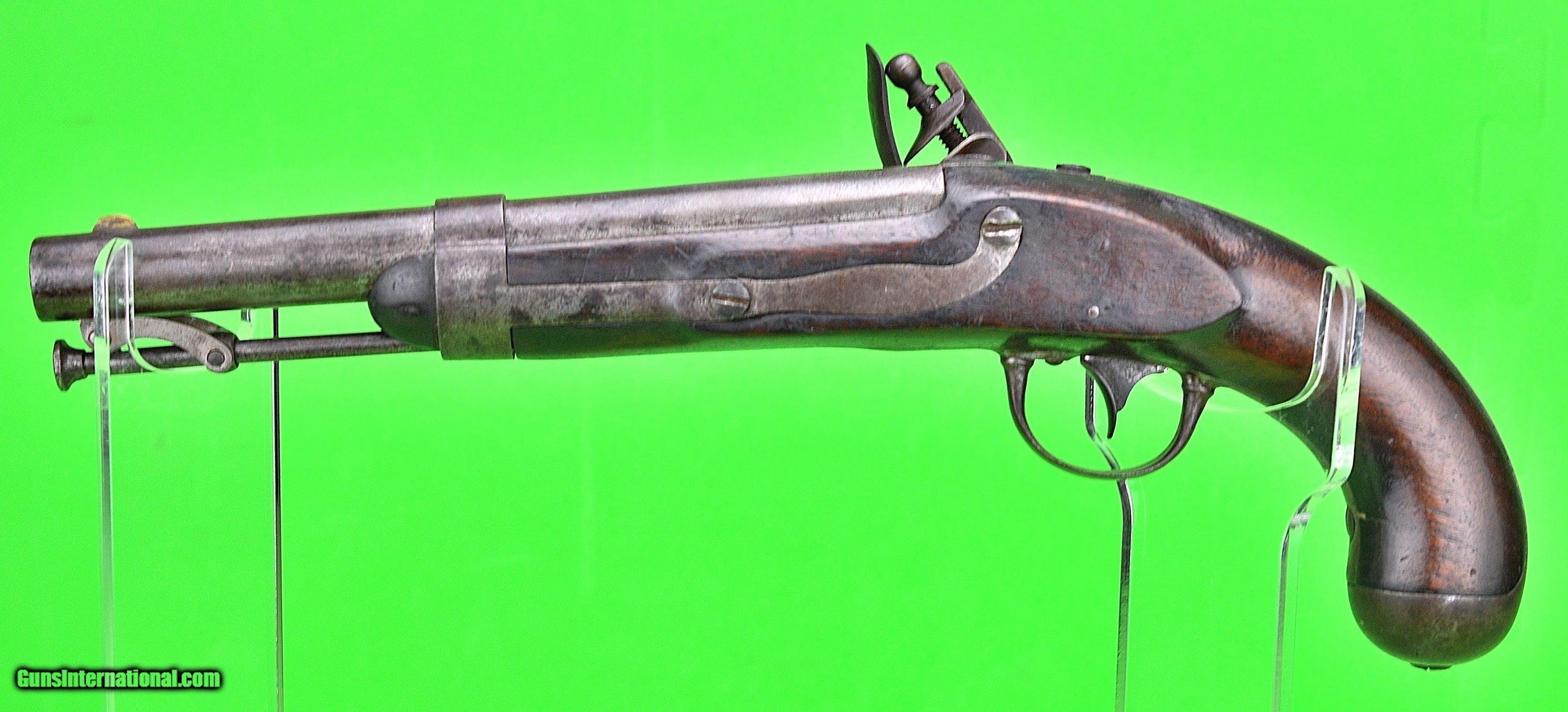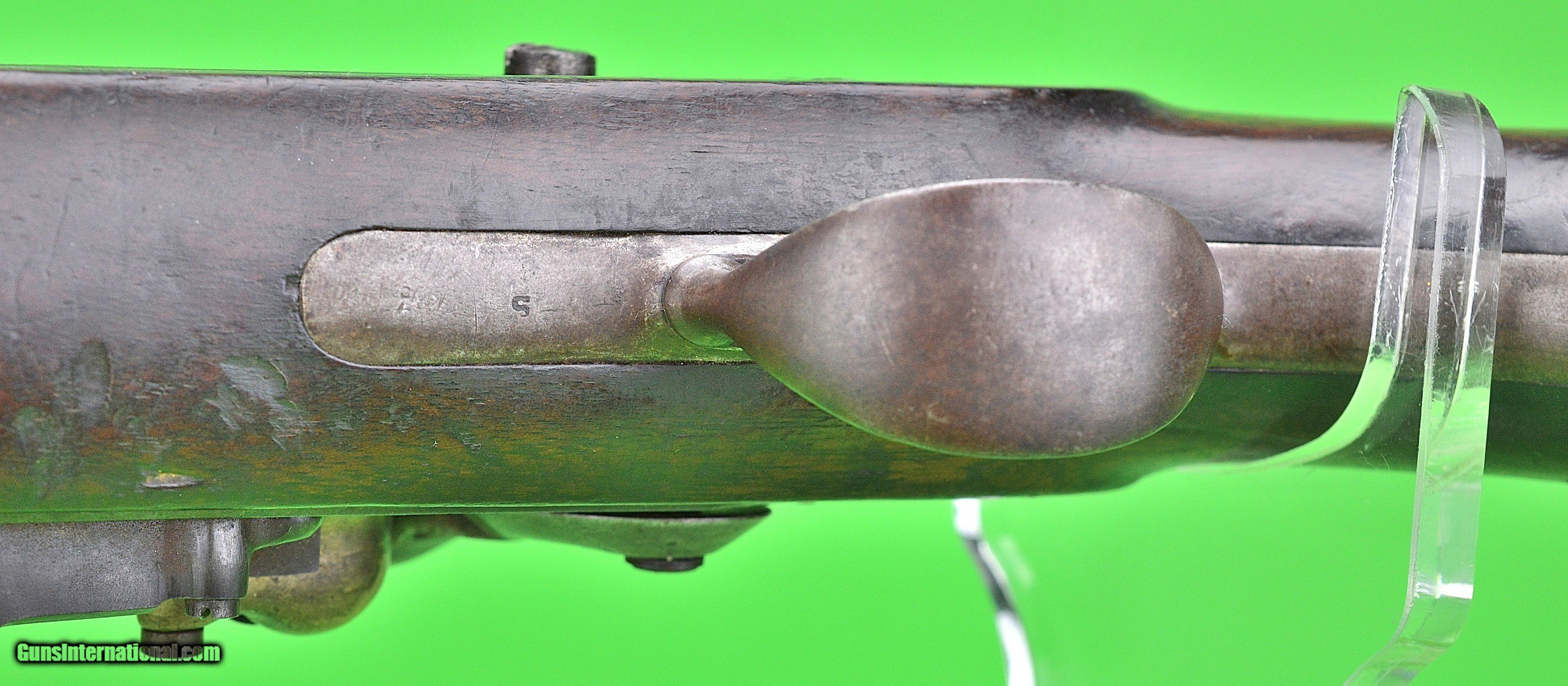 Description: A.H. Waters Model 1836 .54 caliber Flintlock pistol manufactured in 1844. Our research tells us only 3,000 of this variant were produced. A total of 41,000 Waters Model 1836 flintlock pistols were made, many of which were converted to percussion. They were used in the Mexican American and the American Civil War. This 1844 example is marked on the lock with an “EAGLE head/A.H. Waters & Co./Milbury MASS/1844. The inspector James Harris initials are found on the barrel and side plate. The condition is good-very good remaining in the original Flintlock configuration. The metal parts have turned to a grayish brown patina. Markings are clear. There is some pitting on the barrel mostly at the breech area around the pan. Action is tight. Bore is fair, The stock has numbers dints and dings and signs of use. There are hairline cracks ahead of and behind the lock. The right stock grip shows the initials “D S”, likely one of the early owners. Overall, this is a very acceptable example of the reasonably rare 175 year old plus pistol. Please see the photos. $1500.00 SOLD Antique: Yes Manufacturer: A.H. Waters Model: Flintlock Pistol Bore: .54 Condition: Good/Very Good Metal Condition: Good/Very Good Wood Condition: Good/Very Good Bore Condition: Fair Barrel Type: Smooth Action: Flintlock |