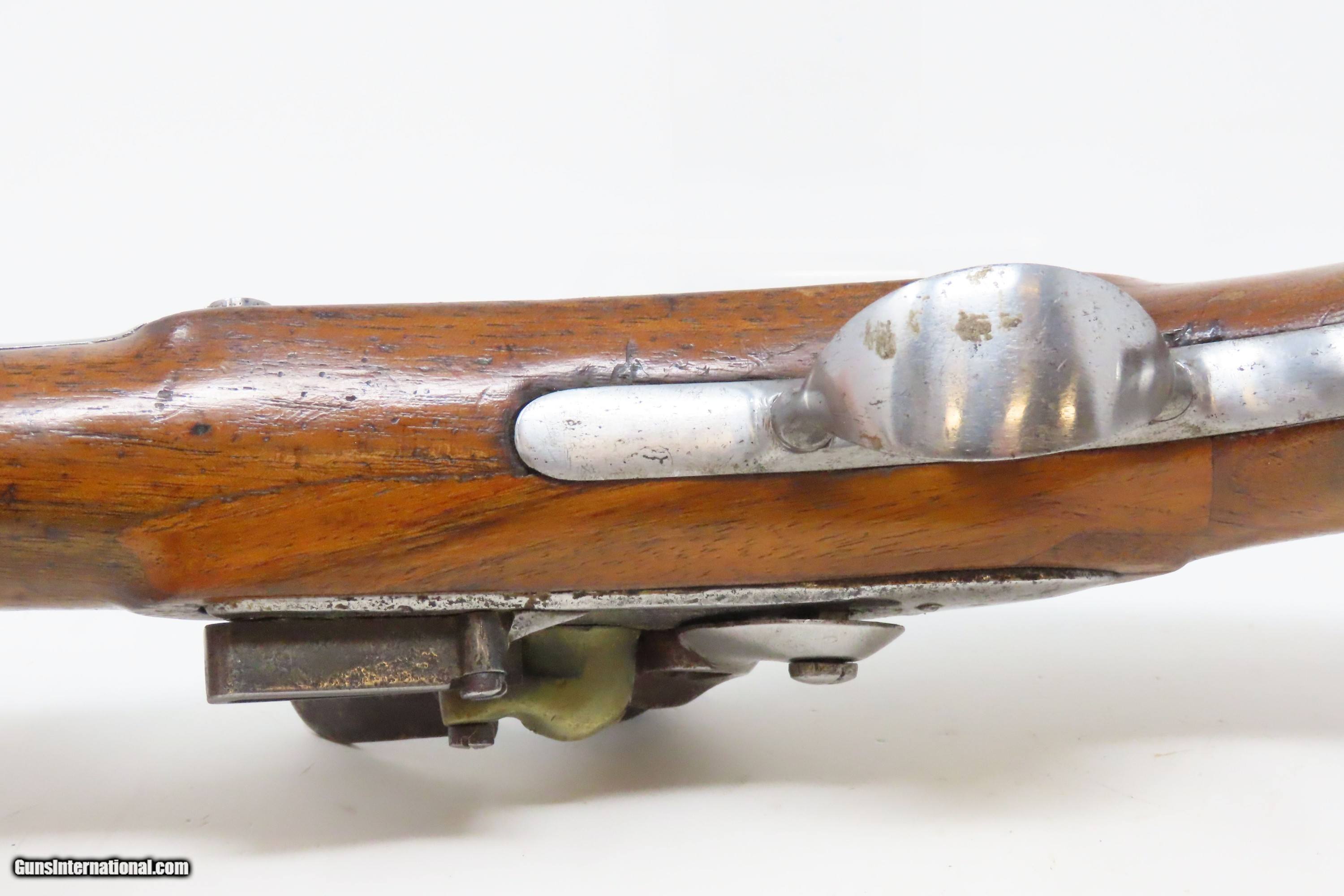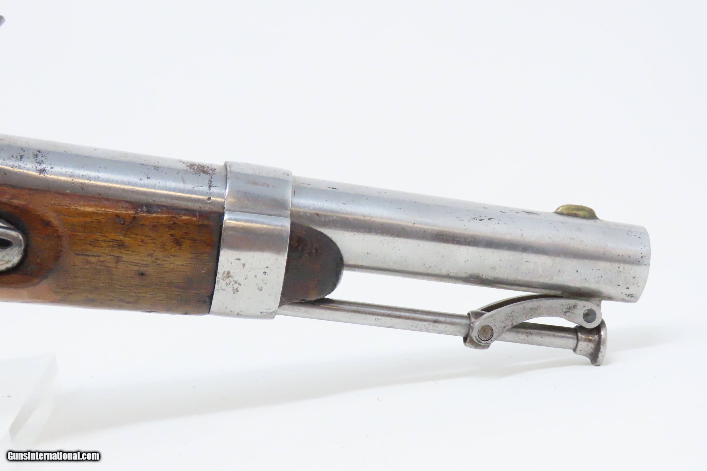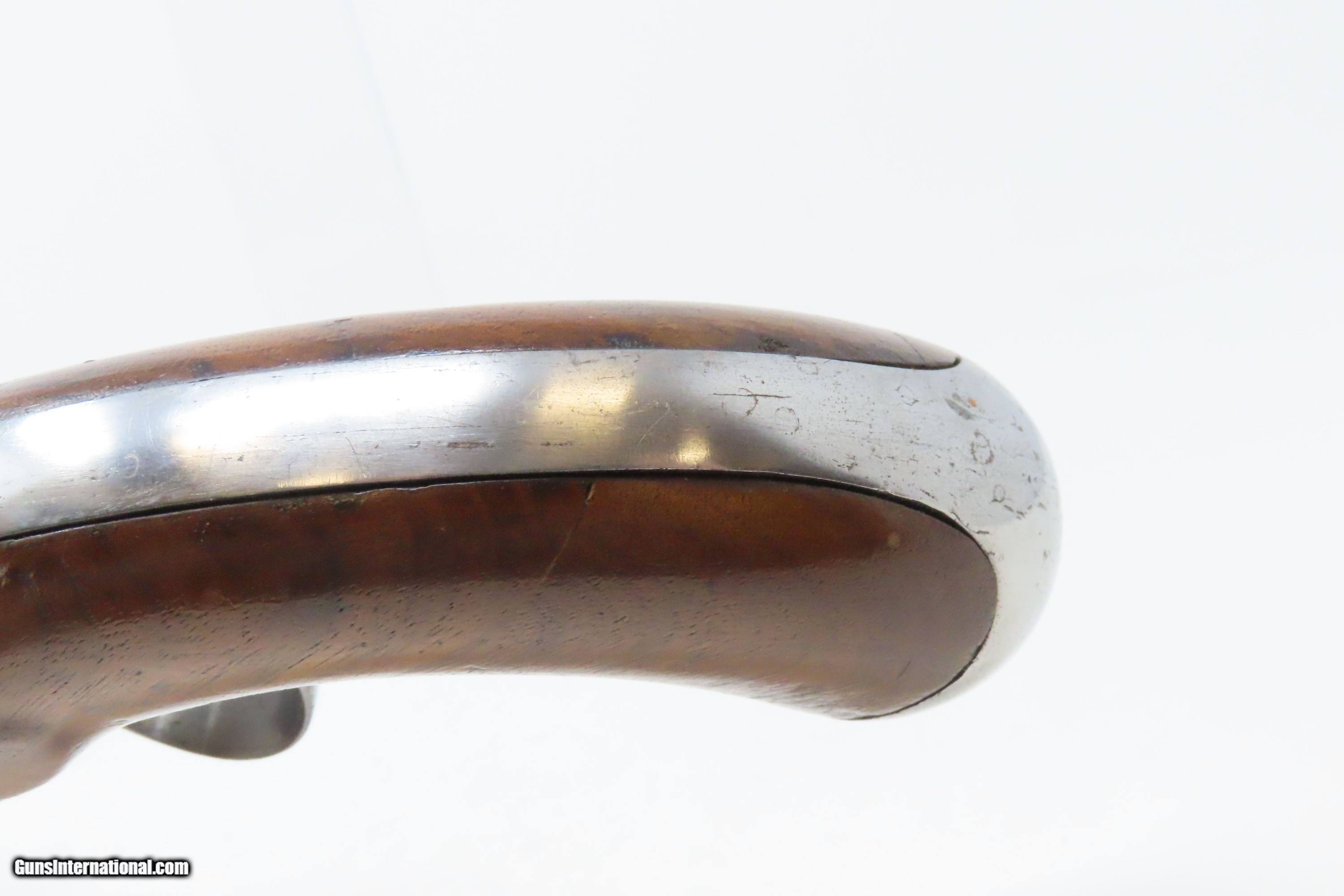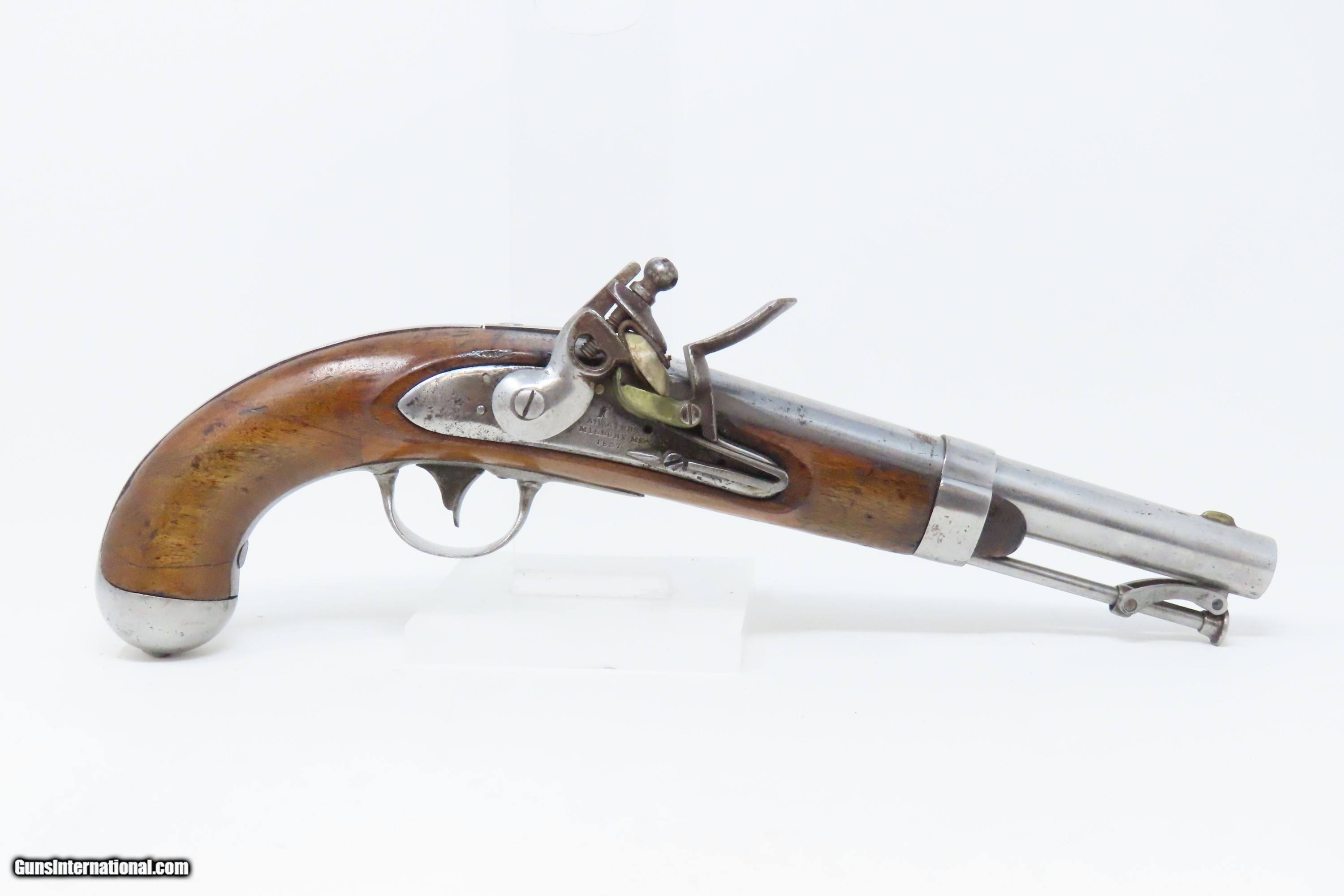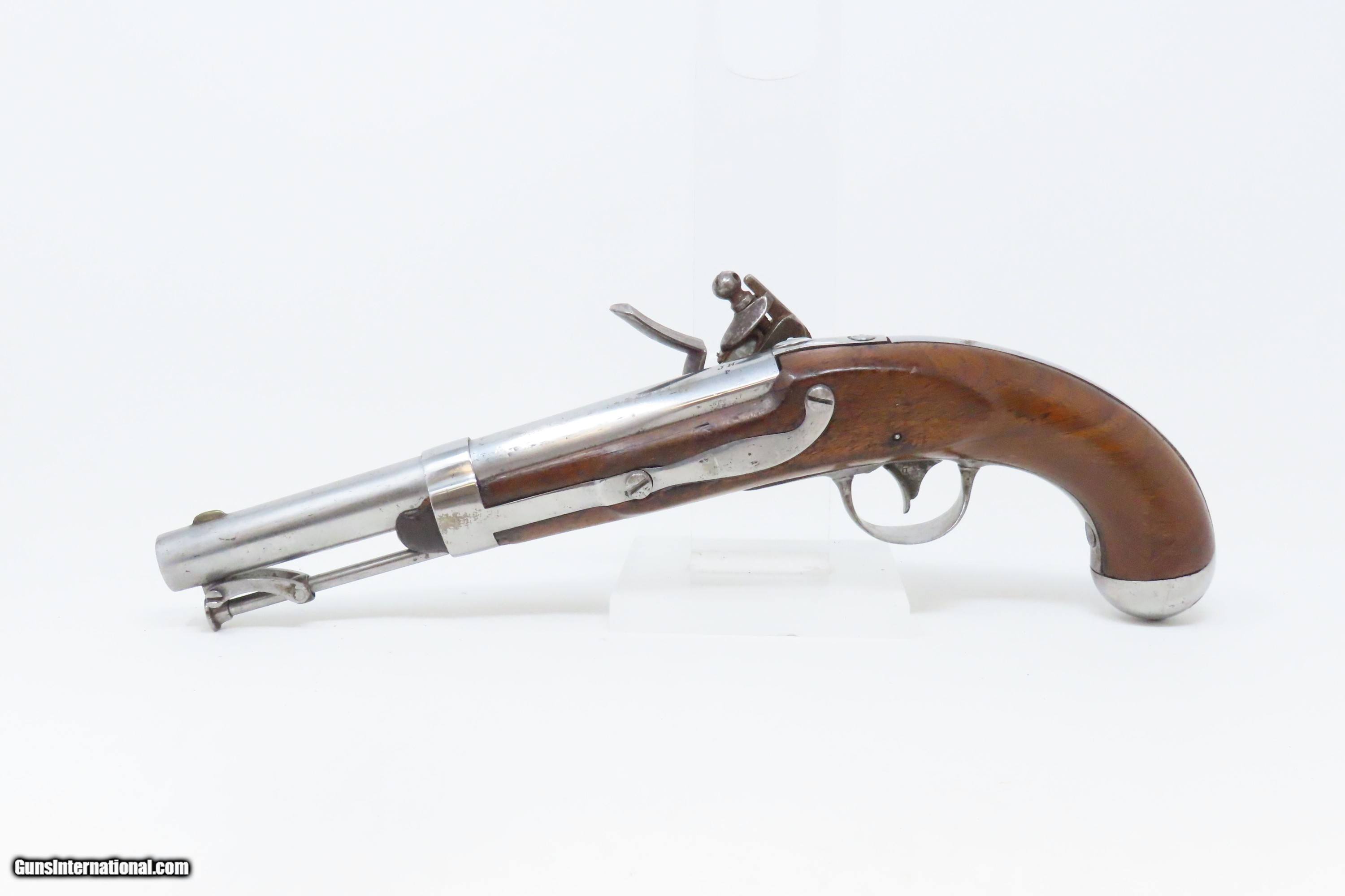 Description: Antique ASA WATERS U.S. Model 1836 .54 Caliber Military FLINTLOCK Pistol STANDARD ISSUE of the MEXICAN-AMERICAN WAR Here we present an antique A.H. Waters U.S. Model 1836 Flintlock Pistol, made in 1844. There were actually two manufacturers of these guns: Asa Waters and Robert Johnson. Combined, the production totals 41,000 guns. This was the last U.S. martial pistol to use the flintlock system, and many consider this the best of all U.S. flint guns due to its craftsmanship and aesthetic appeal. The gun is historically significant as this was the primary issue pistol during the Mexican American War (1846-1848) and was even significantly used during the American Civil War (1861-1865), especially in the percussion converted format. The lock plate is stamped with an eagle head above "A. WATERS/MILBURY. MS./1837" in three lines. The left side of the barrel is roll-stamped: "U.S./JH/P" in three lines. Many of these were lost to attrition during the various conflicts listed above, and many were converted to percussion for use by the North & South during the Civil War. Here is a true survivor in its original flintlock state. The overall condition is good. Bright steel. The action is excellent. The bore is patinated and smooth. The stock has been repaired under the lock and through the grip and it is solid as ever. Own the original! This is a legitimate antique and not a reproduction. Barrel is 8-1/2 inches. Caliber: .54 Flintlock Overall condition as seen in photos. Very Fast. Very Safe. FREE SHIPPING WORLDWIDE. Delivered directly to your door by express mail! Guaranteed AUTHENTIC & Includes CERTIFICATE OF AUTHENTICITY. ancestryguns $1600 #228148 SOLD Antique: Yes |