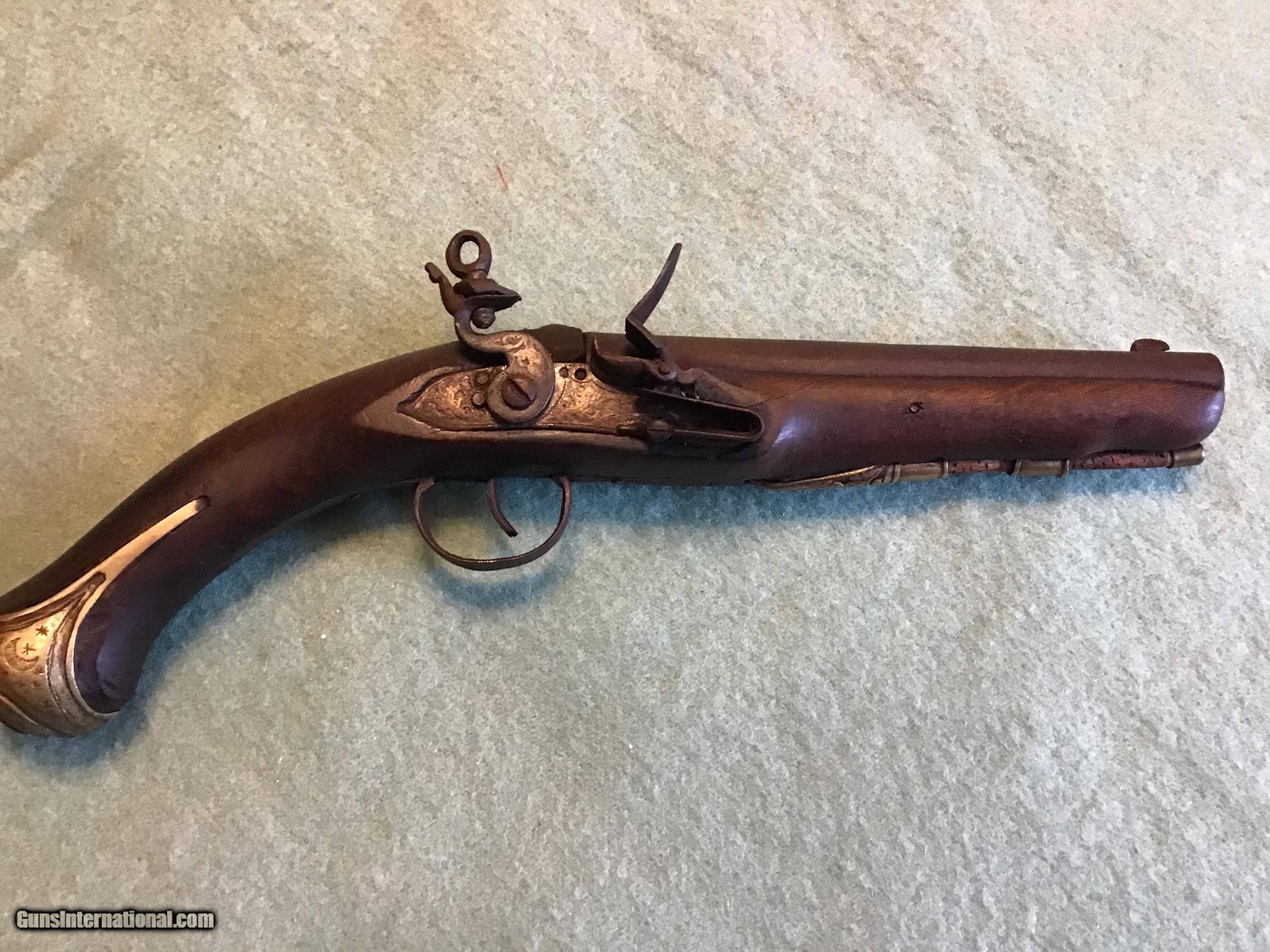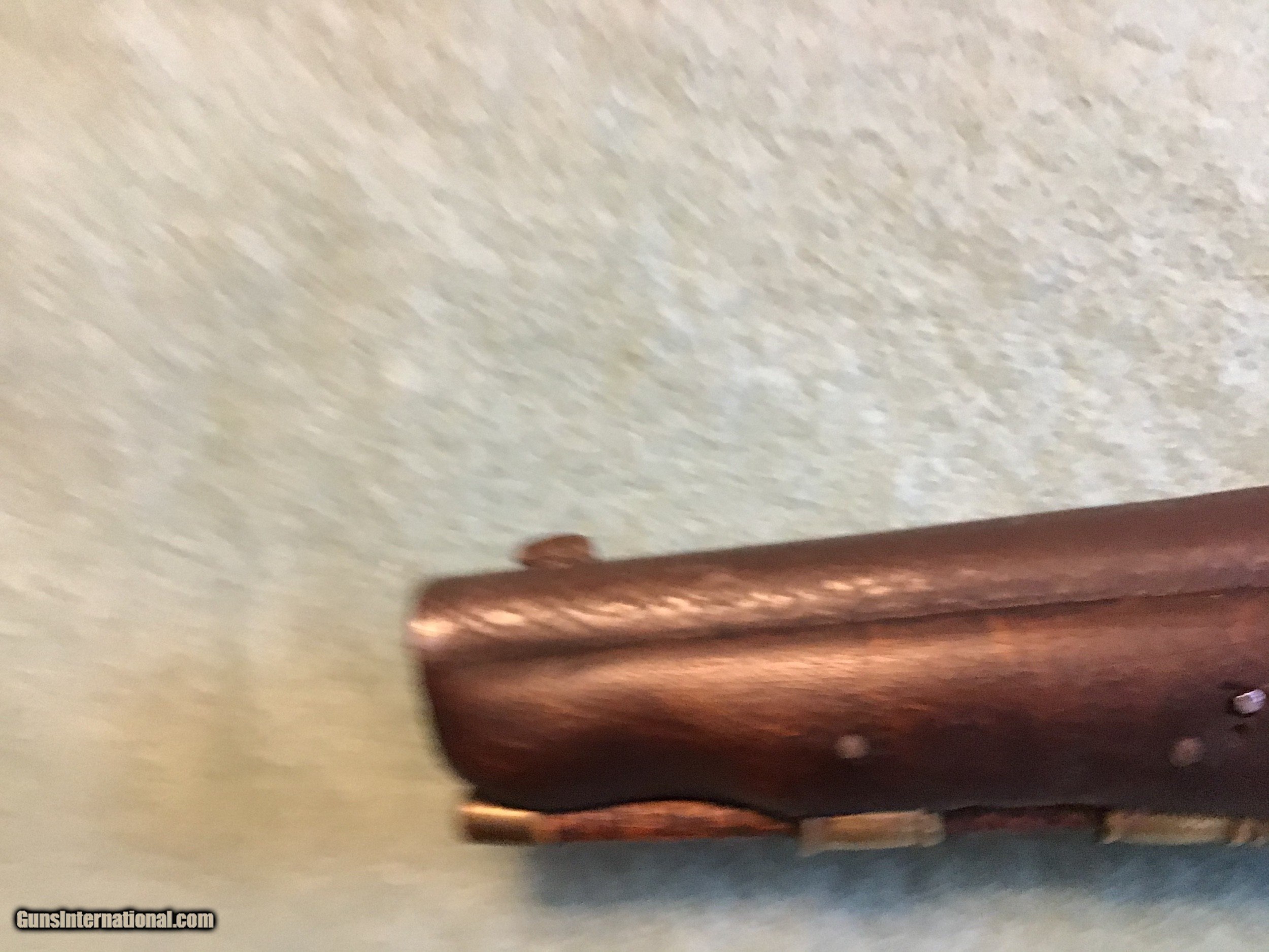 Description: On Hold Sale pending. Antique flintlock pistol approximately 60 caliber from the late 1700's or Early 1800's. I think the grooves in the frizzen may indicate earlier date. Unsure of country of origin but was told stars and moon may indicate Ottoman Empire. All metal parts have been engraved to some degree with a dark brown patina. barrel length 7.5" total length 14.5". Lock still functions. Shipping will be actual cost by priority mail approximately $20.00. Feel free to contact me with any questions, chriskobberdahl2gmail or 218-839-9272. SOLD Antique: Yes |