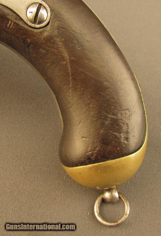 Description: This fine navy pistol has a large belt hook, fancy socket style breech plug, swivel mounted ramrod, and many inspector's marks. The barrel is dated 1842 with several touch marks. Lockplate indicates Tulle manufacture. Buttcap shows "M" (Marine) stamp. This pistol shows the 1849 arsenal modification of an added backstrap with tang and buttcap altered to fit. This pistol is in excellent condition, showing signs of an old cleaning with minor stains on bright steel and light brass patina. The wood shows many marks from use. A fine example of this classic French pistol. We have another of these coming up on Monday that is very similar with an anchor on the butt as opposed to the "M" and dated 1841. Antique SOLD Antique: Yes Manufacturer: French Model: 1837 |