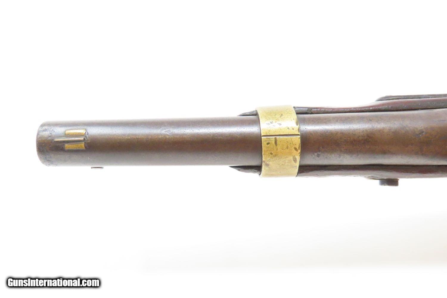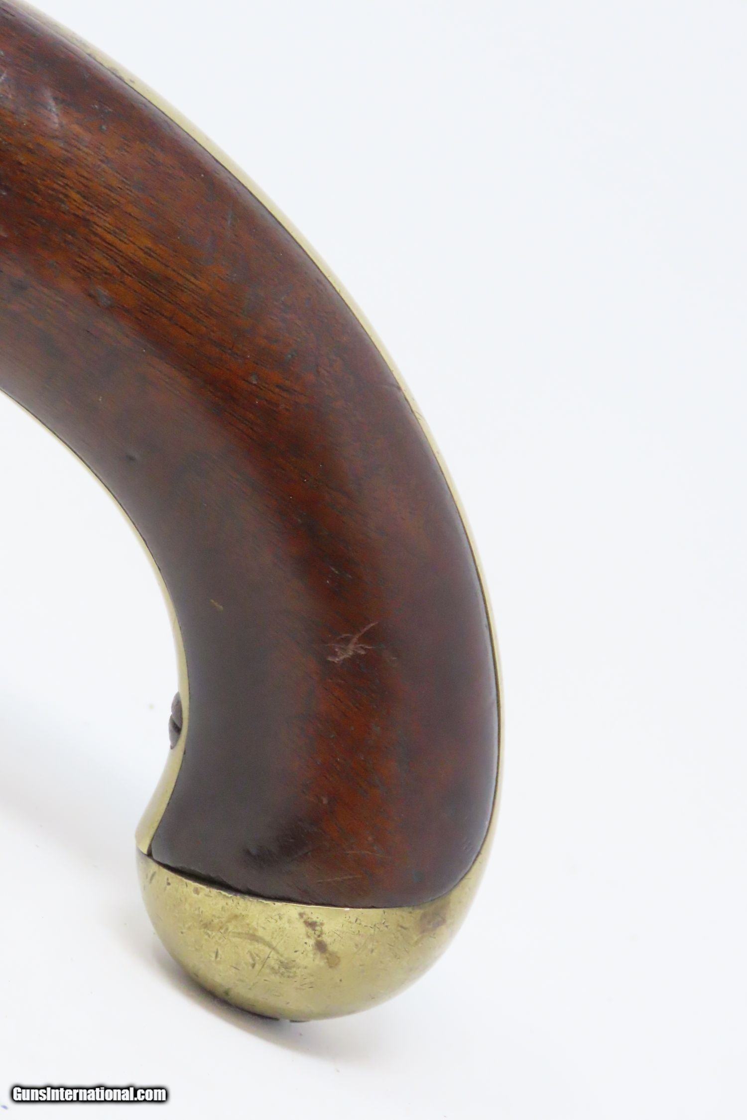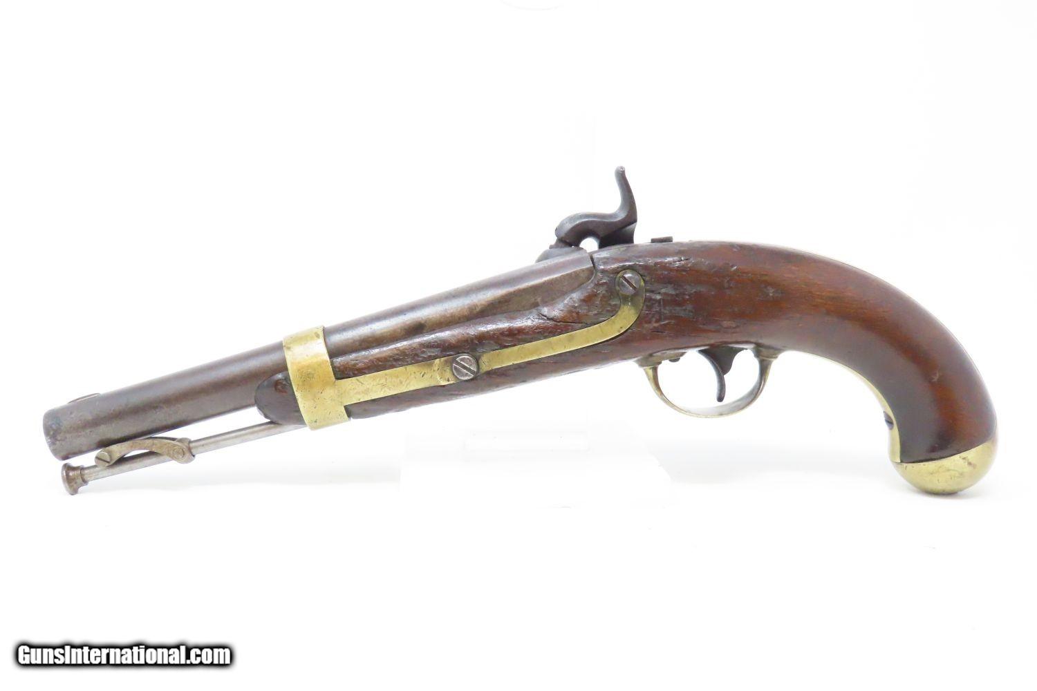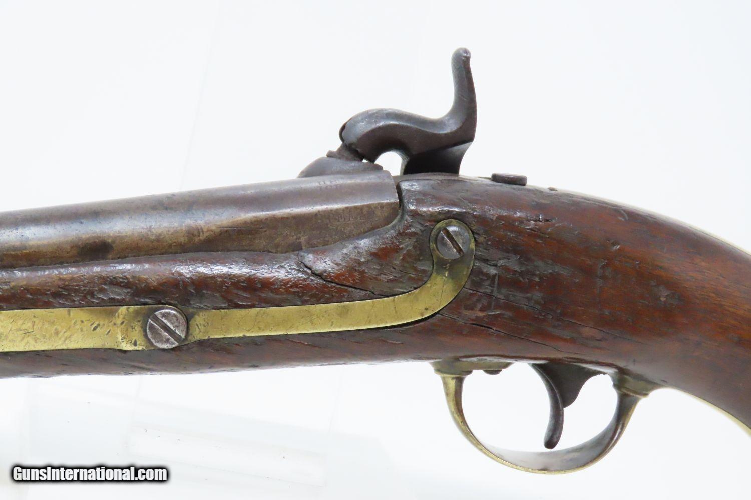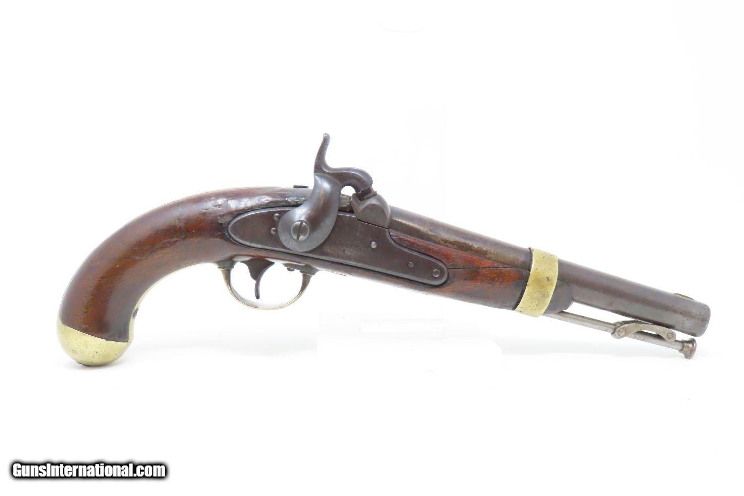 Description: Antique I.N. JOHNSON U.S. Model 1842 DRAGOON .54 Caliber MARTIAL Pistol Dated “1854” Horse Pistol Used During BLEEDING KANSAS Here we present an antique U.S. I.N. Johnson Model 1842 Percussion Pistol, made in 1854, in Middletown, Connecticut by Ira N. Johnson. The Model 1842 saw service during a time of great change and increasing tension, as well as firearms innovation. The Mexican-American War, the numerous conflicts with Native Americans, annexing of new territory, the rising blood-pressure over slavery, and a quick 36% population increase that all culminated in the blood-letting of the American Civil War. This was the first official percussion pistol to be adopted by the U.S. and simultaneously the last large smooth bore single shot pistol. By 1845 it was the primary issued weapon to the First and Second Regiment of Dragoons, replacing many of their Model 1836 flintlocks, just in time for the Mexican-American War. The 1842 features sturdy construction with lots of brass for support. This was important during a time when one would expend their shots and still have a fight on their hands. Striking your opponent with the pommel of your gun was quite effective. The ramrod is captive, so that it would not be lost in the heat of battle on top of a horse. This specimen is marked “US/I.N. JOHNSON” and “MIDDTN/CONN./1854” on the lock. About 10,000 were so marked. Small initials from sub-inspectors are found on various parts of the gun. The primary inspector cartouche is still faintly visible. The overall condition is good. Strong action. Good bore. Cracks in the wood on both sides are stable. The hinge on the ramrod is not affixed to the barrel or stock. Own the original! This is a legitimate antique and not a reproduction. Barrel is 8-1/2 inches. Caliber: .54 Percussion Overall condition as seen in photos. Very Fast. Very Safe. FREE SHIPPING WORLDWIDE. Delivered directly to your door by express mail! Guaranteed AUTHENTIC & Includes CERTIFICATE OF AUTHENTICITY. ancestryguns $1200 #215081 SOLD Antique: Yes |