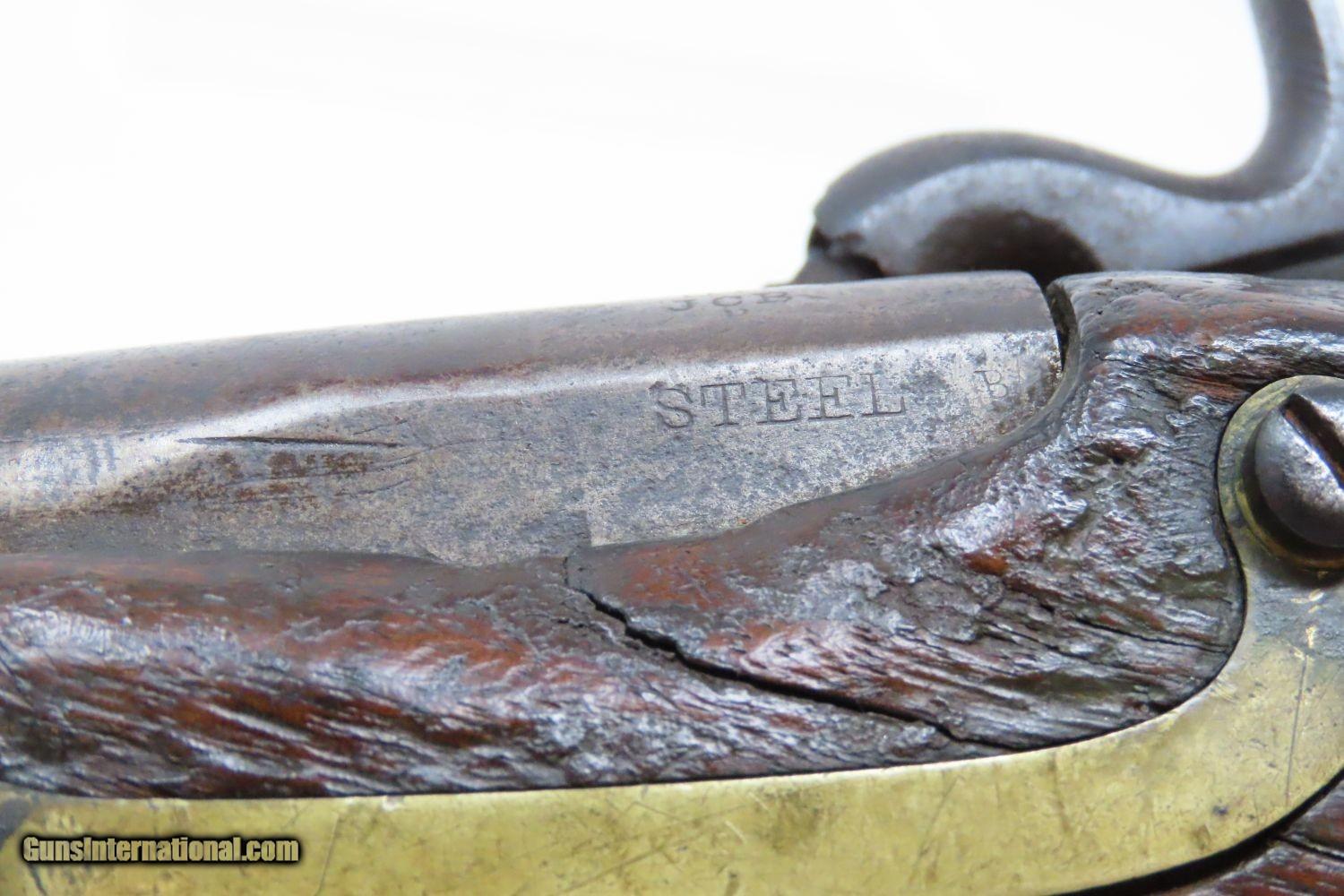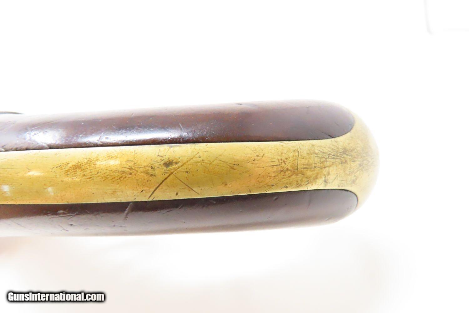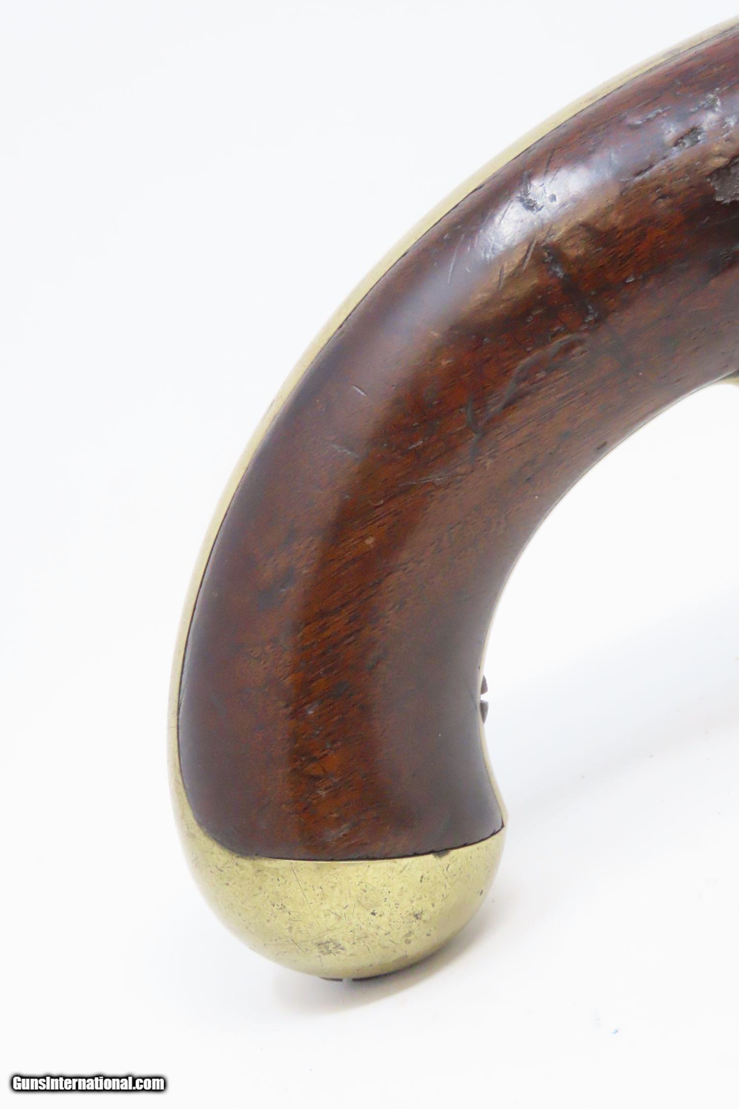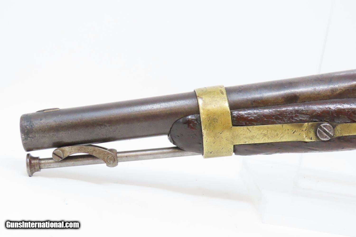 Description: Antique I.N. JOHNSON U.S. Model 1842 DRAGOON .54 Caliber MARTIAL Pistol Dated “1854” Horse Pistol Used During BLEEDING KANSAS Here we present an antique U.S. I.N. Johnson Model 1842 Percussion Pistol, made in 1854, in Middletown, Connecticut by Ira N. Johnson. The Model 1842 saw service during a time of great change and increasing tension, as well as firearms innovation. The Mexican-American War, the numerous conflicts with Native Americans, annexing of new territory, the rising blood-pressure over slavery, and a quick 36% population increase that all culminated in the blood-letting of the American Civil War. This was the first official percussion pistol to be adopted by the U.S. and simultaneously the last large smooth bore single shot pistol. By 1845 it was the primary issued weapon to the First and Second Regiment of Dragoons, replacing many of their Model 1836 flintlocks, just in time for the Mexican-American War. The 1842 features sturdy construction with lots of brass for support. This was important during a time when one would expend their shots and still have a fight on their hands. Striking your opponent with the pommel of your gun was quite effective. The ramrod is captive, so that it would not be lost in the heat of battle on top of a horse. This specimen is marked “US/I.N. JOHNSON” and “MIDDTN/CONN./1854” on the lock. About 10,000 were so marked. Small initials from sub-inspectors are found on various parts of the gun. The primary inspector cartouche is still faintly visible. The overall condition is good. Strong action. Good bore. Cracks in the wood on both sides are stable. The hinge on the ramrod is not affixed to the barrel or stock. Own the original! This is a legitimate antique and not a reproduction. Barrel is 8-1/2 inches. Caliber: .54 Percussion Overall condition as seen in photos. Very Fast. Very Safe. FREE SHIPPING WORLDWIDE. Delivered directly to your door by express mail! Guaranteed AUTHENTIC & Includes CERTIFICATE OF AUTHENTICITY. ancestryguns $1200 #215081 SOLD Antique: Yes |