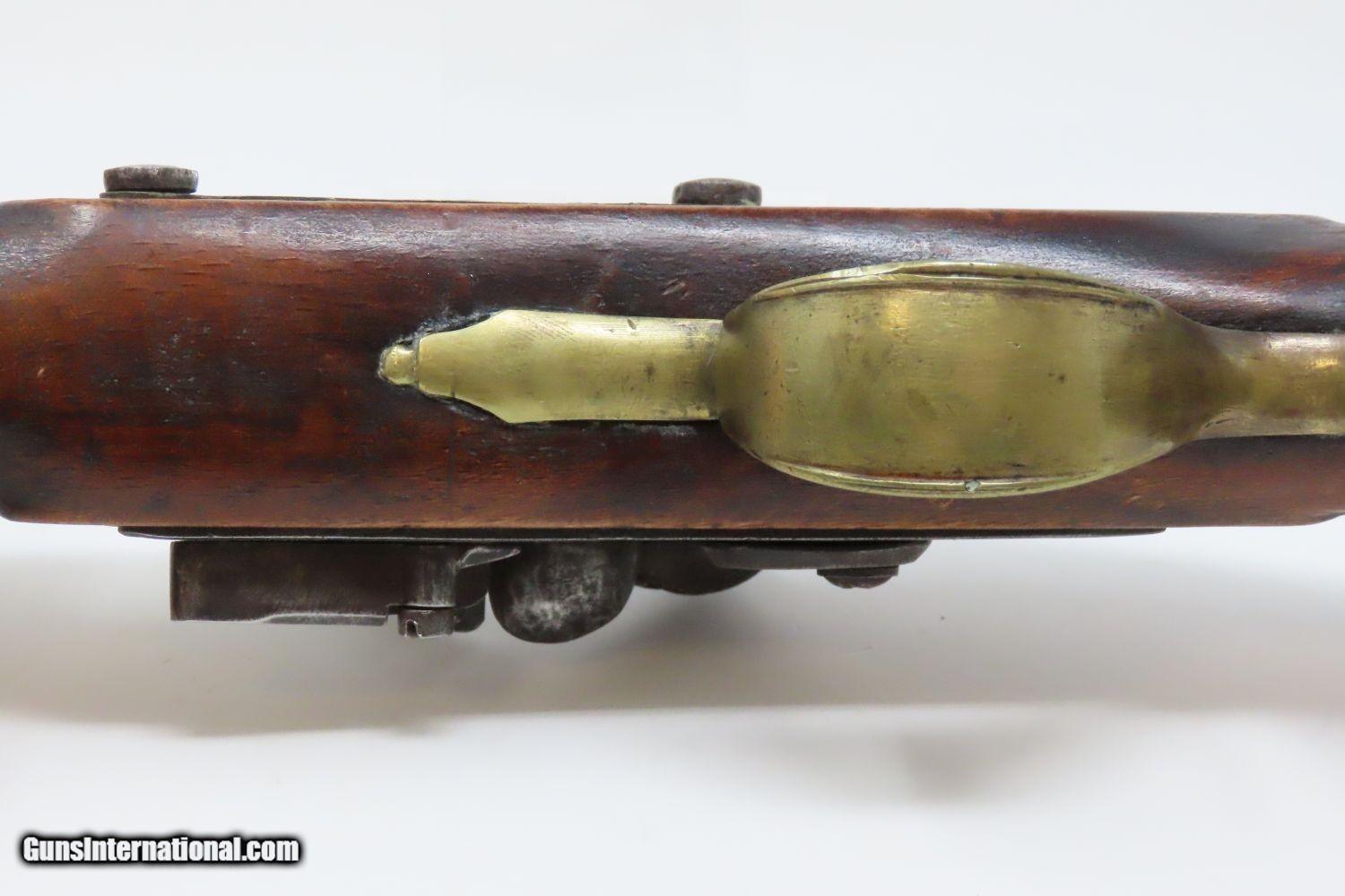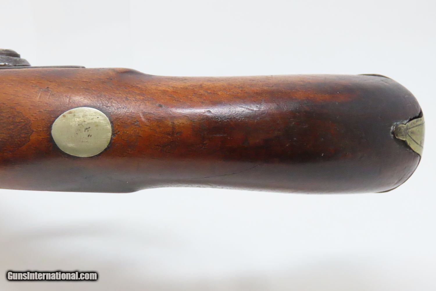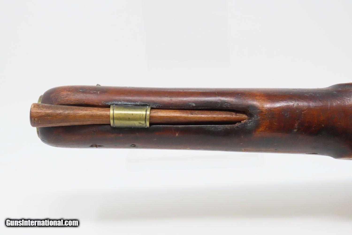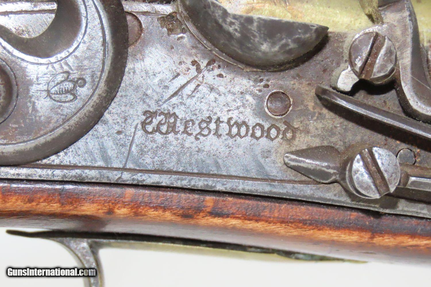 Description: Antique Joseph WESTWOOD of LONDON Brass Barrel FLINTLOCK INDIAN TRADE Pistol British with Birmingham Proofs & Brass Barrel Here we present an antique Joseph Westwood Flintlock Trade Pistol, made circa 1813 through the 1830s in Birmingham, England, though he often marked his gun as made in “London”. This Birmingham Gun maker "Westwood" was in business from the mid-1820s to around 1845. He was known for making good quality Flintlock pistols, likely for the Hudson Bay Company, that were traded to the Indigenous Indians in exchange for fur pelts that were eagerly desired in the European Fashion Trade. The Hudson Bay Company was founded in May of 1670 primarily serving in the fur trading industry in its early years and has continued for 350 years to present day in London, England. This pistol was designed to make massive holes in things. This pistol would have been a horse carried pistol or perhaps even worn on a belt. The overall condition is good. The lock reads “WESTWOOD” and is lightly engraved with floral designs. “LONDON” is stamped atop the barrel with Birmingham proof marks. The action is strong and tight. The bore is smooth and dark. This example is quite hardy. A fantastic British flintlock pistol from the early-19th Century! Own the original! This is a legitimate antique and not a reproduction. Barrel is 9 inches. Caliber: .61 Overall condition as seen in photos. Very Fast. Very Safe. FREE SHIPPING WORLDWIDE. Delivered directly to your door by express mail! Guaranteed AUTHENTIC & Includes CERTIFICATE OF AUTHENTICITY. ancestryguns $1675 #20672 SOLD Antique: Yes |