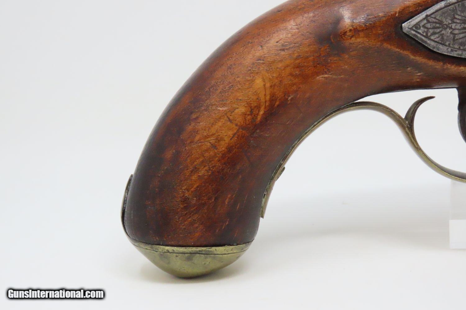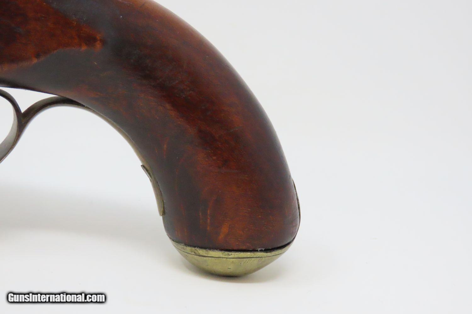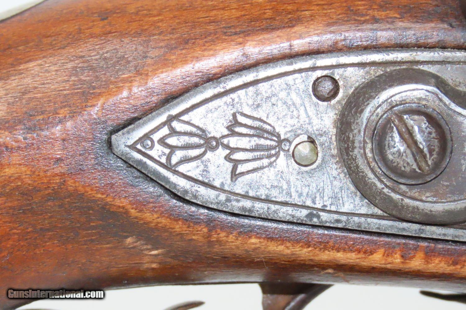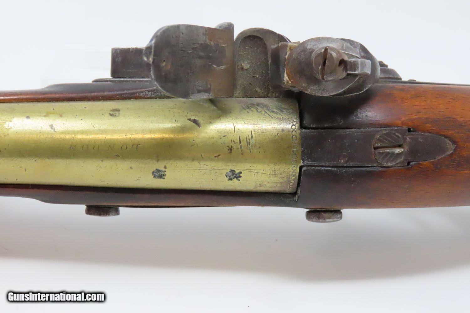Description: Antique Joseph WESTWOOD of LONDON Brass Barrel FLINTLOCK INDIAN TRADE Pistol British with Birmingham Proofs & Brass Barrel Here we present an antique Joseph Westwood Flintlock Trade Pistol, made circa 1813 through the 1830s in Birmingham, England, though he often marked his gun as made in “London”. This Birmingham Gun maker "Westwood" was in business from the mid-1820s to around 1845. He was known for making good quality Flintlock pistols, likely for the Hudson Bay Company, that were traded to the Indigenous Indians in exchange for fur pelts that were eagerly desired in the European Fashion Trade. The Hudson Bay Company was founded in May of 1670 primarily serving in the fur trading industry in its early years and has continued for 350 years to present day in London, England. This pistol was designed to make massive holes in things. This pistol would have been a horse carried pistol or perhaps even worn on a belt. The overall condition is good. The lock reads “WESTWOOD” and is lightly engraved with floral designs. “LONDON” is stamped atop the barrel with Birmingham proof marks. The action is strong and tight. The bore is smooth and dark. This example is quite hardy. A fantastic British flintlock pistol from the early-19th Century! Own the original! This is a legitimate antique and not a reproduction. Barrel is 9 inches. Caliber: .61 Overall condition as seen in photos. Very Fast. Very Safe. FREE SHIPPING WORLDWIDE. Delivered directly to your door by express mail! Guaranteed AUTHENTIC & Includes CERTIFICATE OF AUTHENTICITY. ancestryguns $1675 #20672 SOLD Antique: Yes |