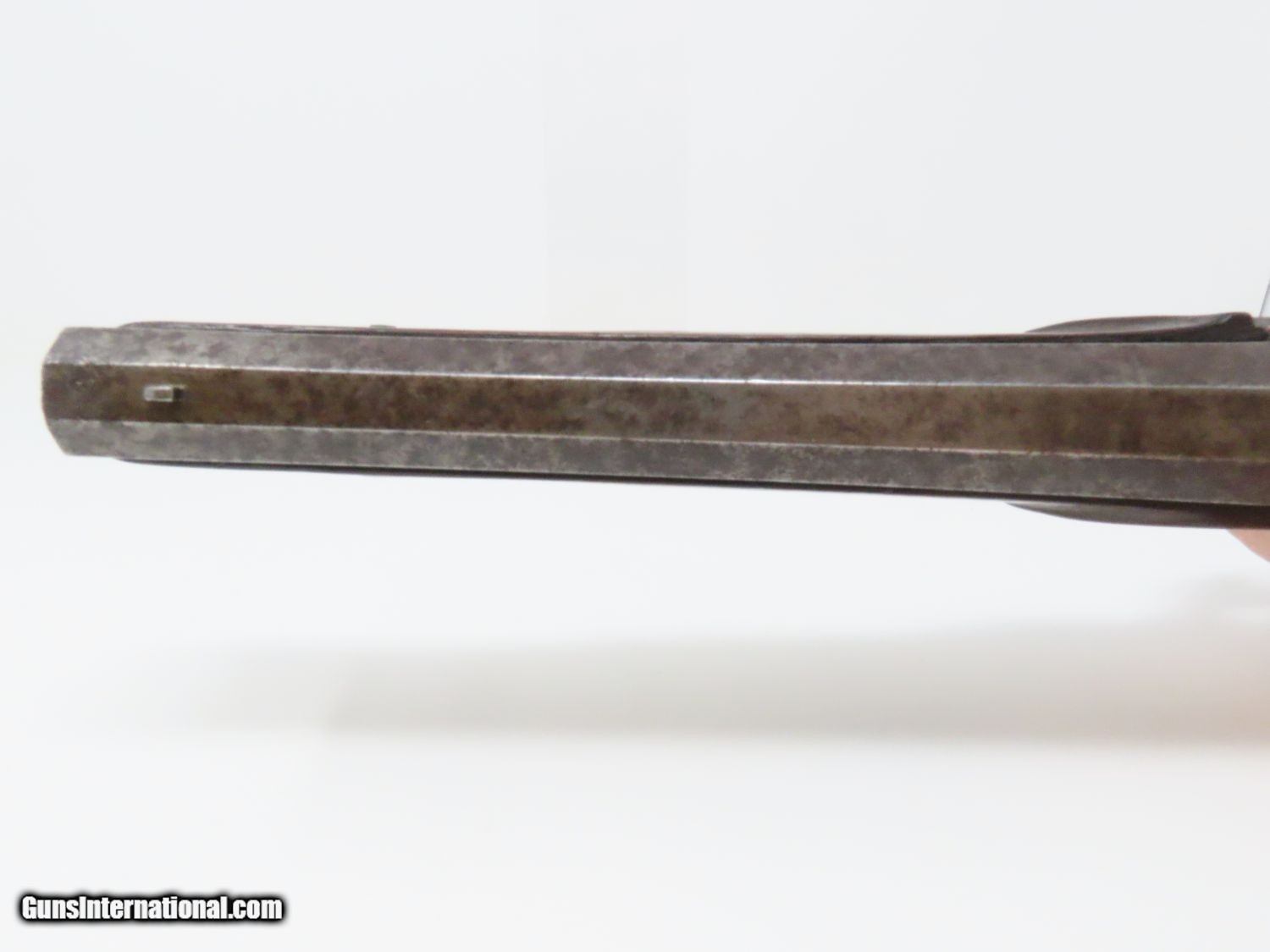 Description: Antique “MANSTOPPER” Large Bore .71 Caliber Pistol Military Belt Percussion Flintlock to Percussion Conversion Here we present an antique Single Shot Belt Pistol, made circa the late-18th Century in western Europe. This is a full-sized sidearm that would have been purchased by an officer to take to front or perhaps by a merchant for protection. This pistol features a large .71 caliber bore that would have been worn on the belt or holstered as it was carried into battle. This pistol features a 9-inch octagonal barrel equipped with a large swale-type rear sight and a blade-type front. The aesthetics of this pistol are typical of French designs from this period. This one also has an older style lock that has its sear engagements with the hammer on the exterior of the lock plate. It would have originally been made as a flintlock and would have been updated to percussion circa the 1840s. This is a neat old pistol and one can easily imagine the sight of its gaping bore would certainly be a deterrent to the enemy or would be scoundrels. The overall condition is very good. Nice case colors remain on the lock with an even gray patina making up the balance. The action is excellent, strong and crisp. The bore is smooth and in good condition. The stock is in great shape. A very handsome pistol. Own the original! This is a legitimate antique and not a reproduction. Barrel is 9 inches. Caliber: .71 Overall condition as seen in photos. Very Fast. Very Safe. FREE SHIPPING WORLDWIDE. Delivered directly to your door by express mail! Guaranteed AUTHENTIC & Includes CERTIFICATE OF AUTHENTICITY. ancestryguns $1750 #20811 SOLD Antique: Yes |