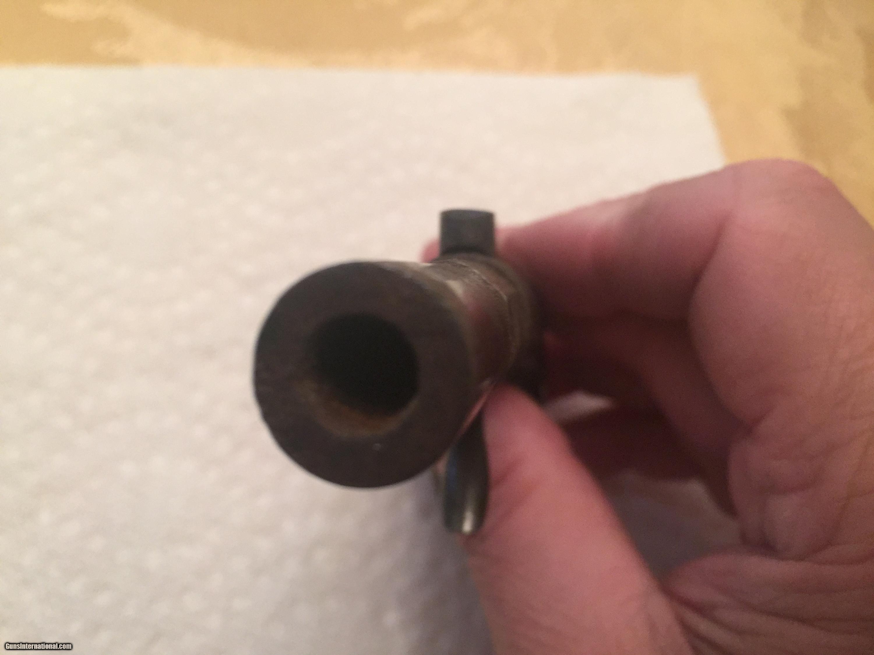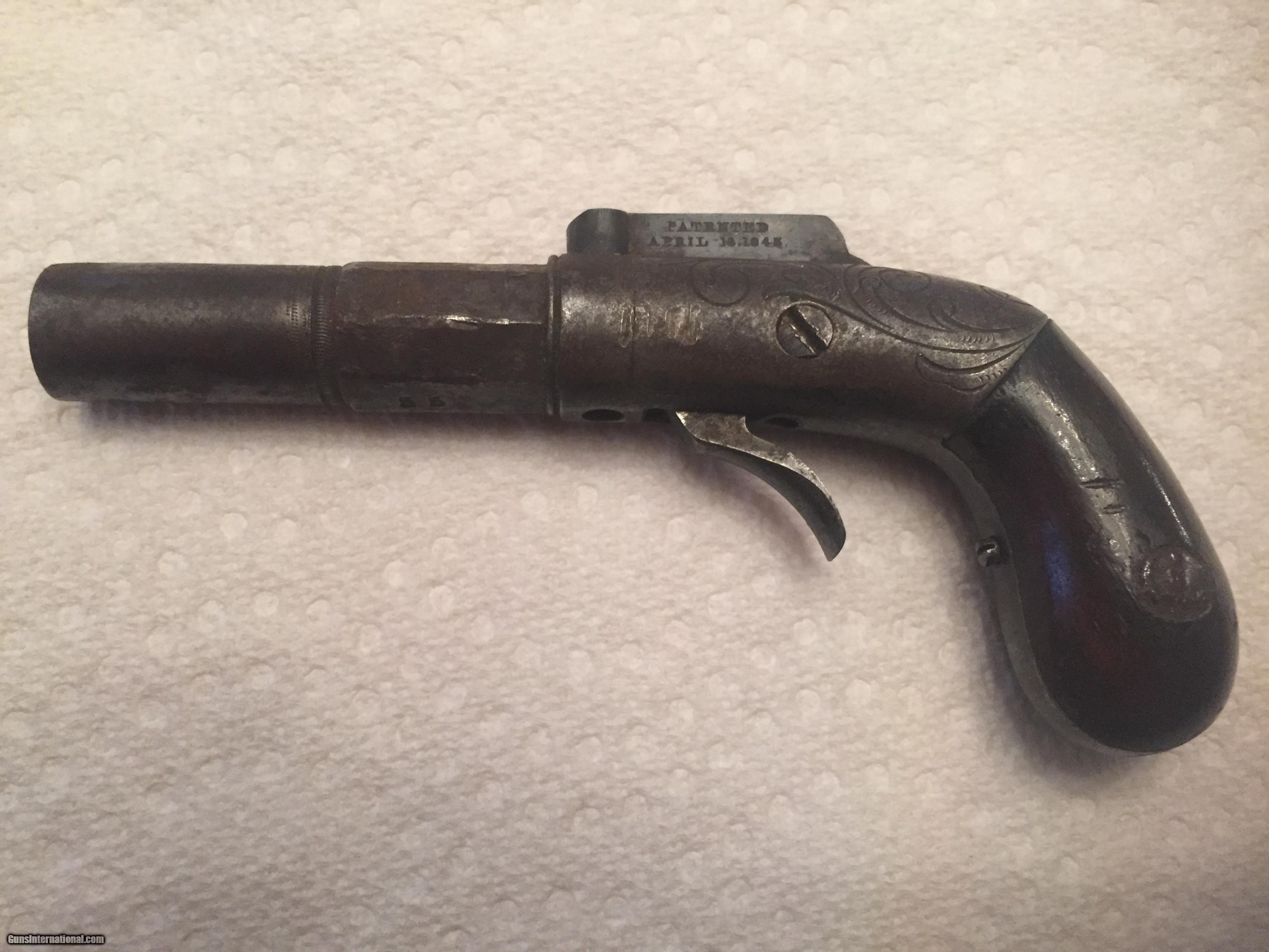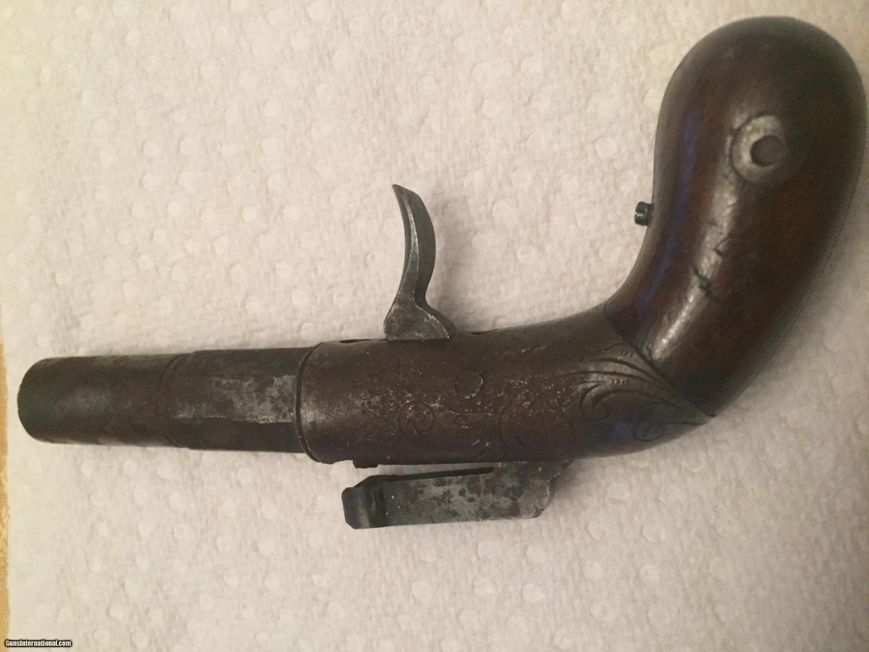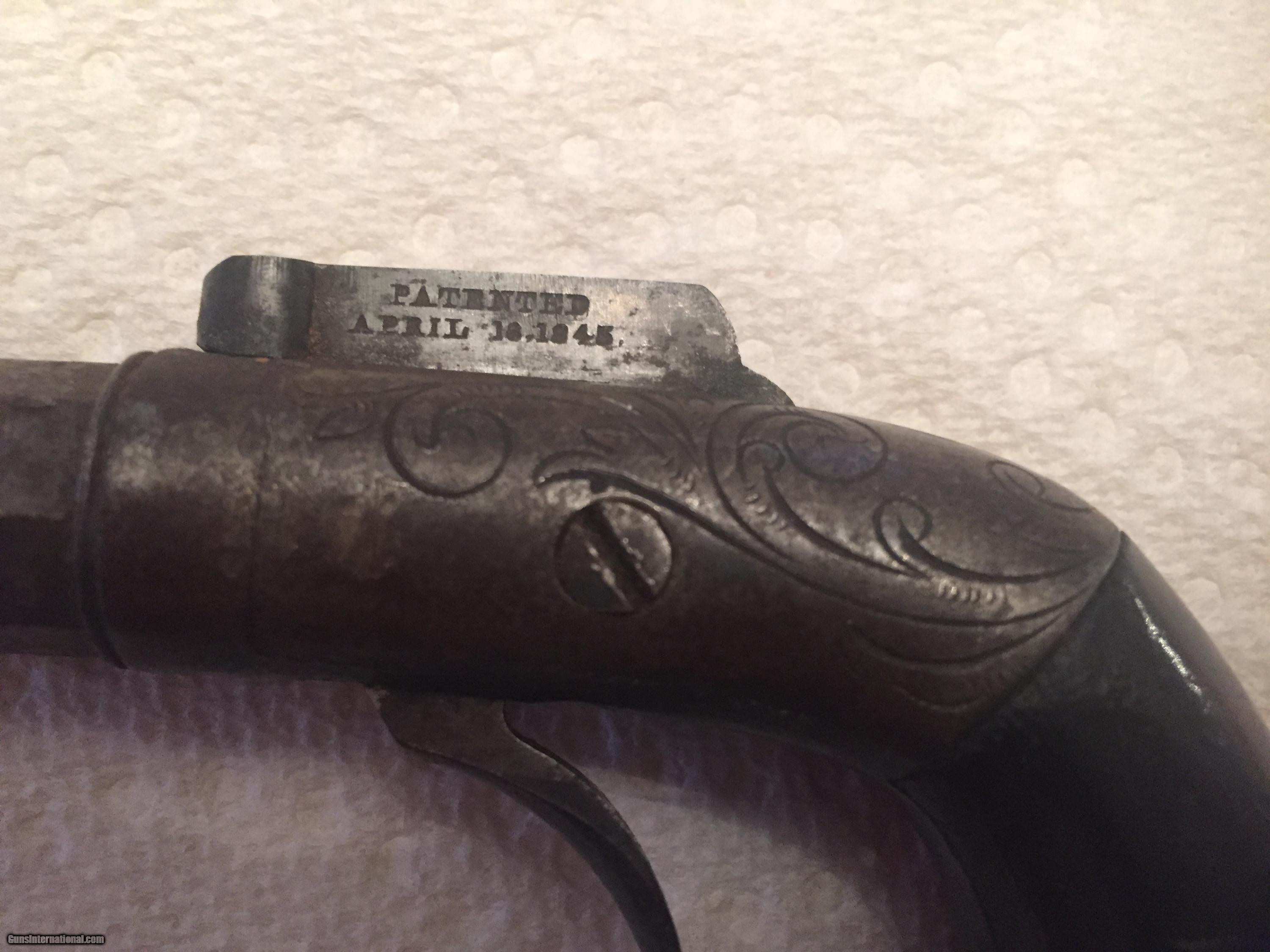 Description: All original antique minature pistol, derringer? Nice decoration on body , patent date of 1845. 55 underneath mid barrel, handle nice shape, looks like trigger guard is missing . Needs a little restoration but the meat of it is there in solid condition. SOLD Antique: Yes Condition: Not an expert Metal Condition: As pictured Wood Condition: Good Manufacture Date: April 1845 patent Engraving: Yes Item Location: Long Island |