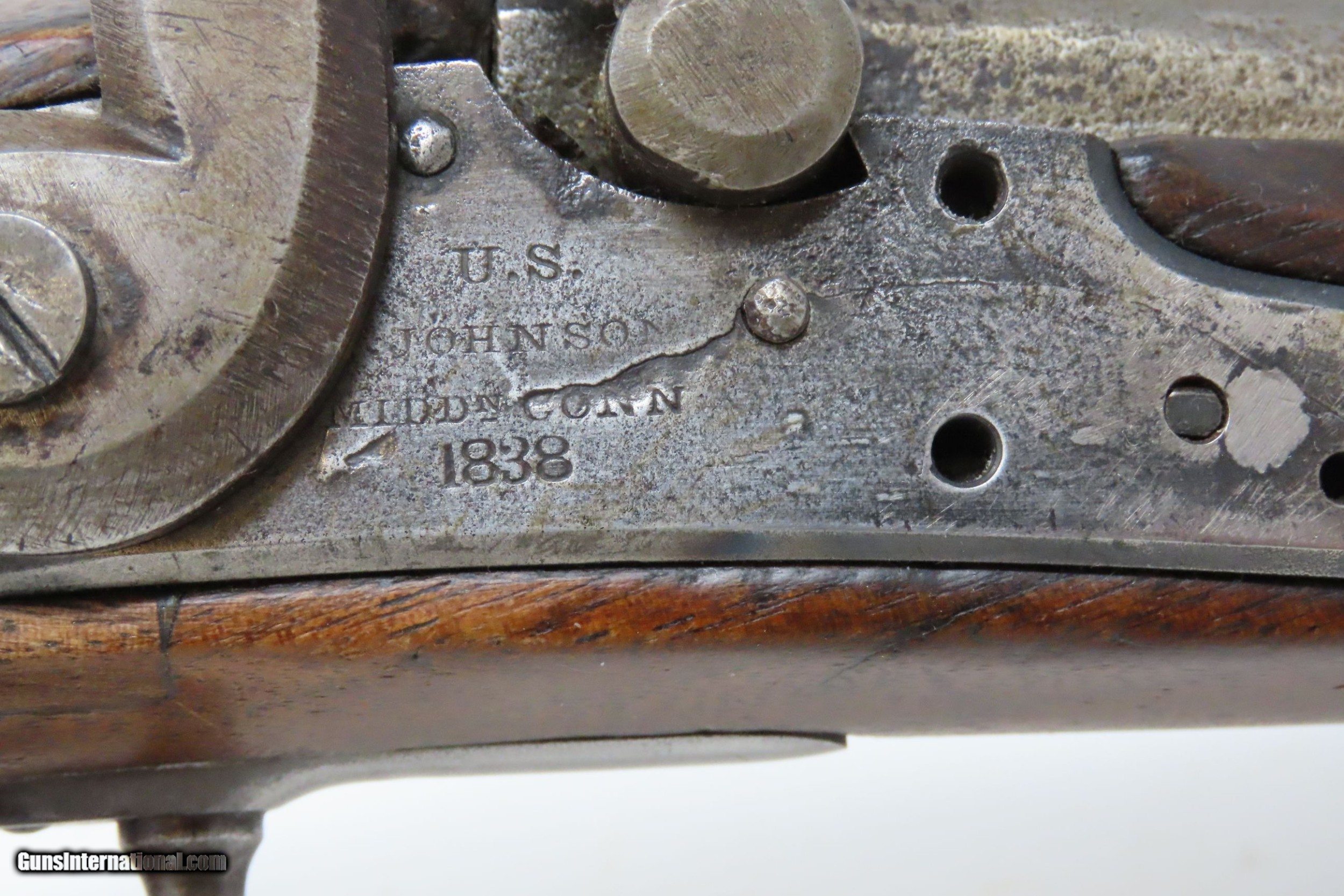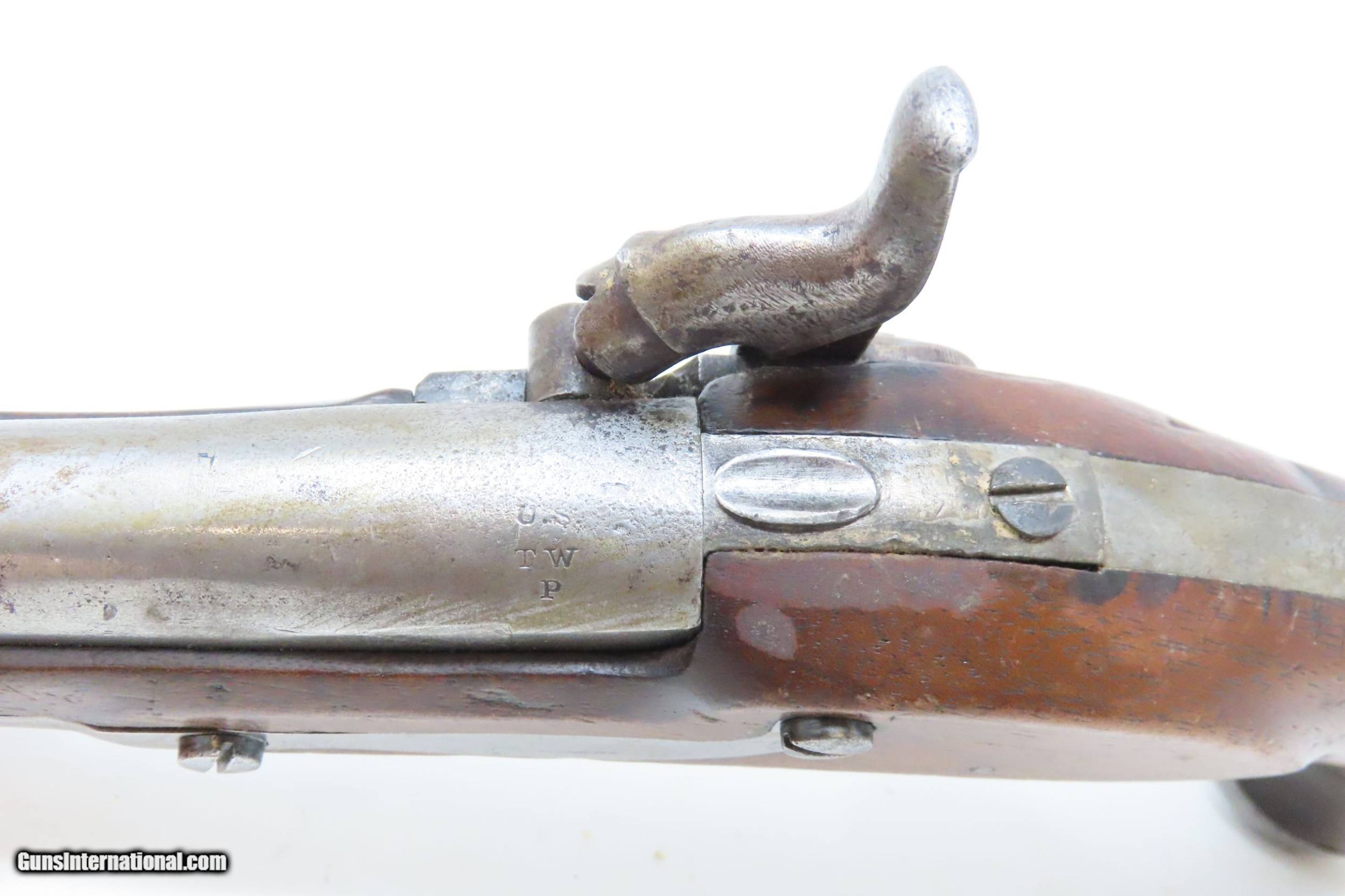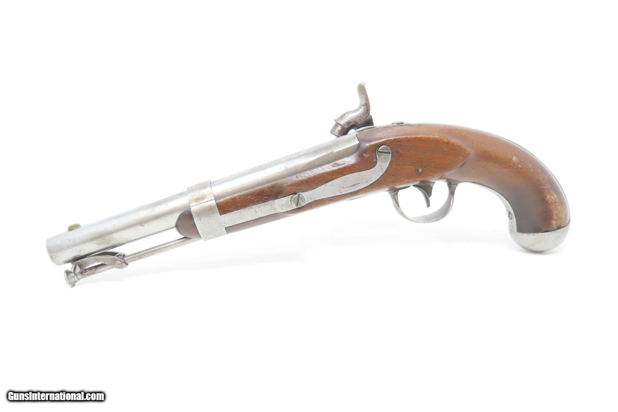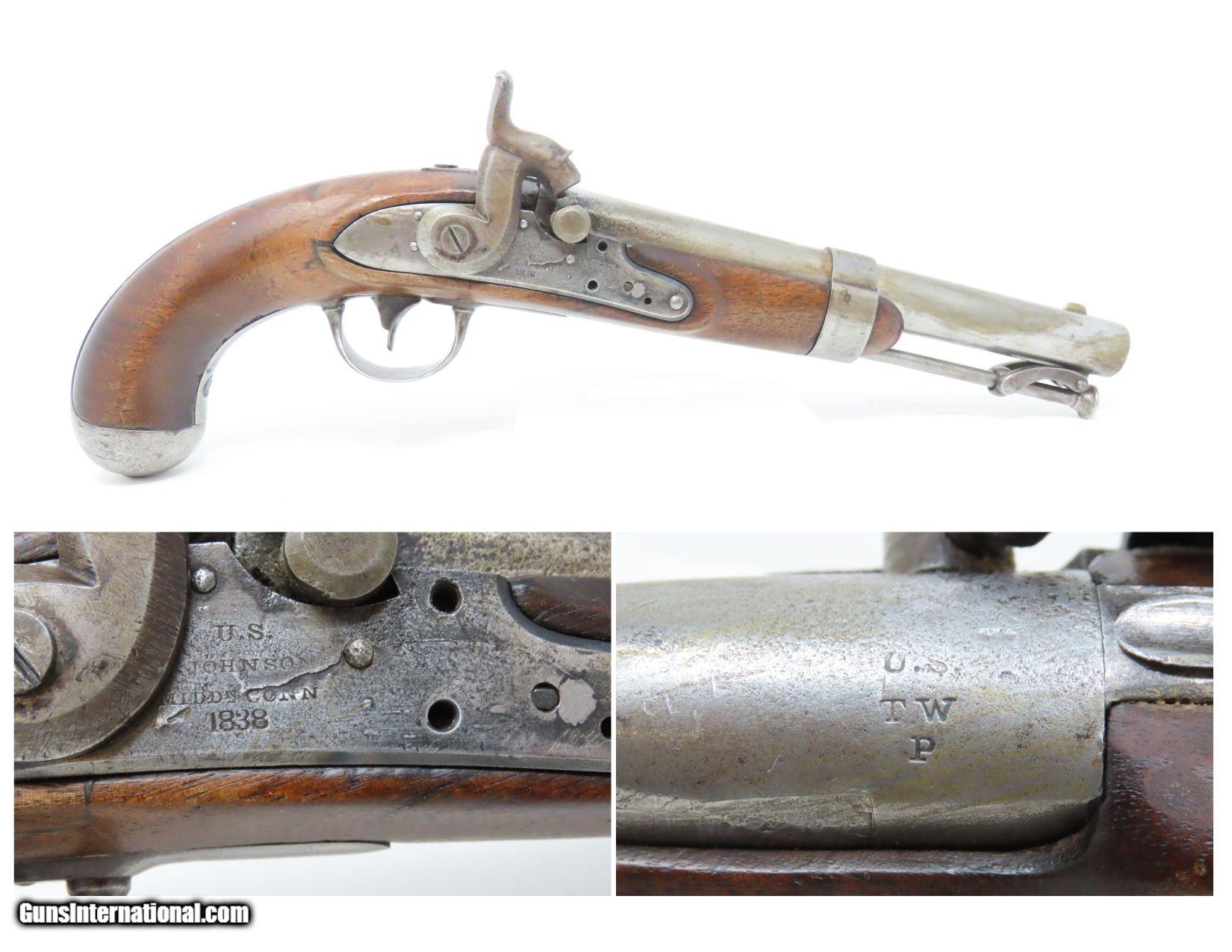 Description: Antique ROBERT JOHNSON US Model 1836 .54 Cal. Smoothbore Conversion Pistol STANDARD ISSUE of the MEXICAN-AMERICAN WAR! Here we present an antique Robert Johnson Model 1836 Percussion Conversion Pistol dated 1838 in Middletown, Connecticut. This .54 caliber smoothbore, percussion pistol would have started out life as a flintlock and converted when the more reliable percussion firing system was introduced and is one of approximately 18,000 Model 1836 pistols manufactured by Robert Johnson. The Model 1836 was widely considered to be the best designed and manufactured flintlock pistol. The pistol has an 8 1/2-inch round barrel with a brass front sight blade, swivel ramrod with button head and iron mountings. The barrel, ramrod, butt cap, barrel band and trigger guard are "bright" finish. The lock plate, hammer, and tang were once casehardened. The right lock is marked "US / JOHNSON / MIDDN.CONN. / 1838". Inspection and proof marks US / TW / P are visible atop the barrel. The Model 1836 Flintlock Pistol was the standard issue handgun of the Mexican War. The overall condition is good. Strong action. Good bore, clear and aged. Solid stock/grip with an average amount of handling wear from use (minor dents and dings). “1838” dated lock. The ramrod is a little loose and falls out with gravity. Own the original! This is a legitimate antique and not a reproduction. Barrel is 8 inches. Caliber: .54 Percussion Overall condition as seen in photos. Very Fast. Very Safe. FREE SHIPPING WORLDWIDE. Delivered directly to your door by express mail! Guaranteed AUTHENTIC & Includes CERTIFICATE OF AUTHENTICITY. ancestryguns $1200 #217692 SOLD Antique: Yes |